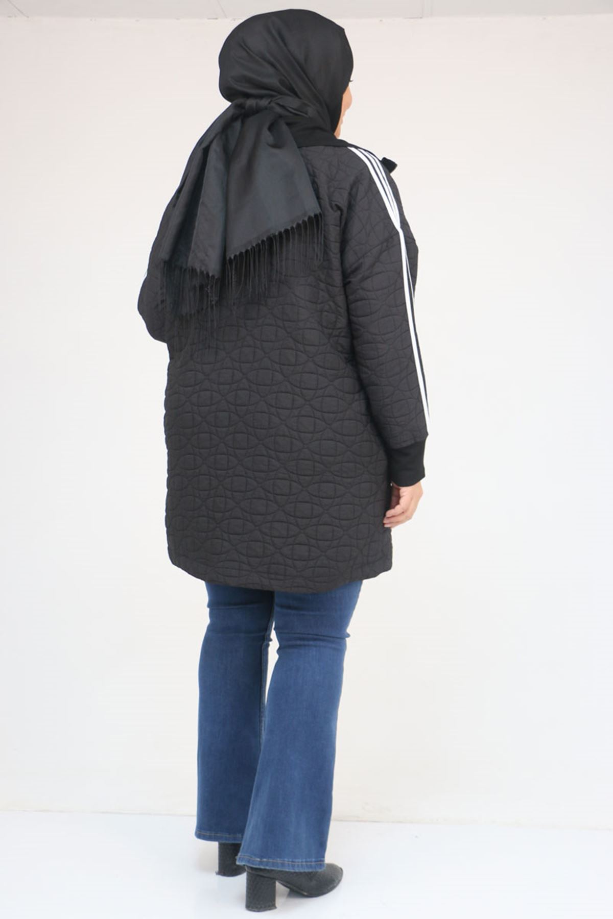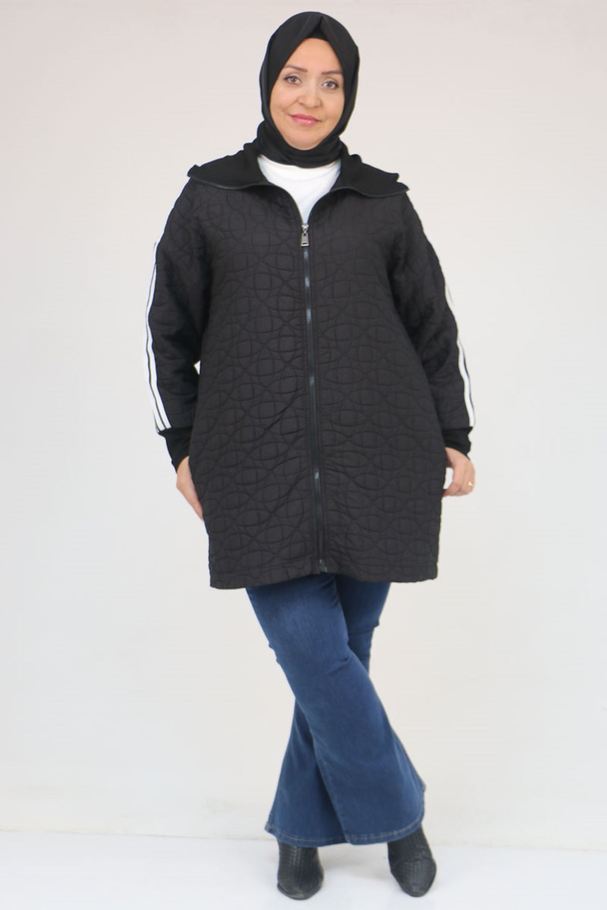 53060 Büyük Beden Omuzdan Şeritli Kapitone Fermuarlı Ceket - Siyah-Beyaz