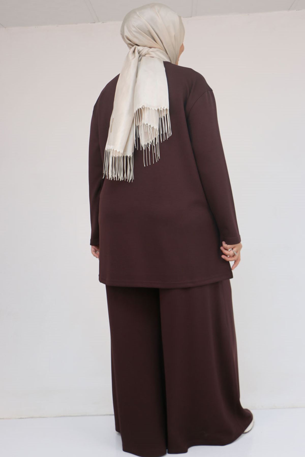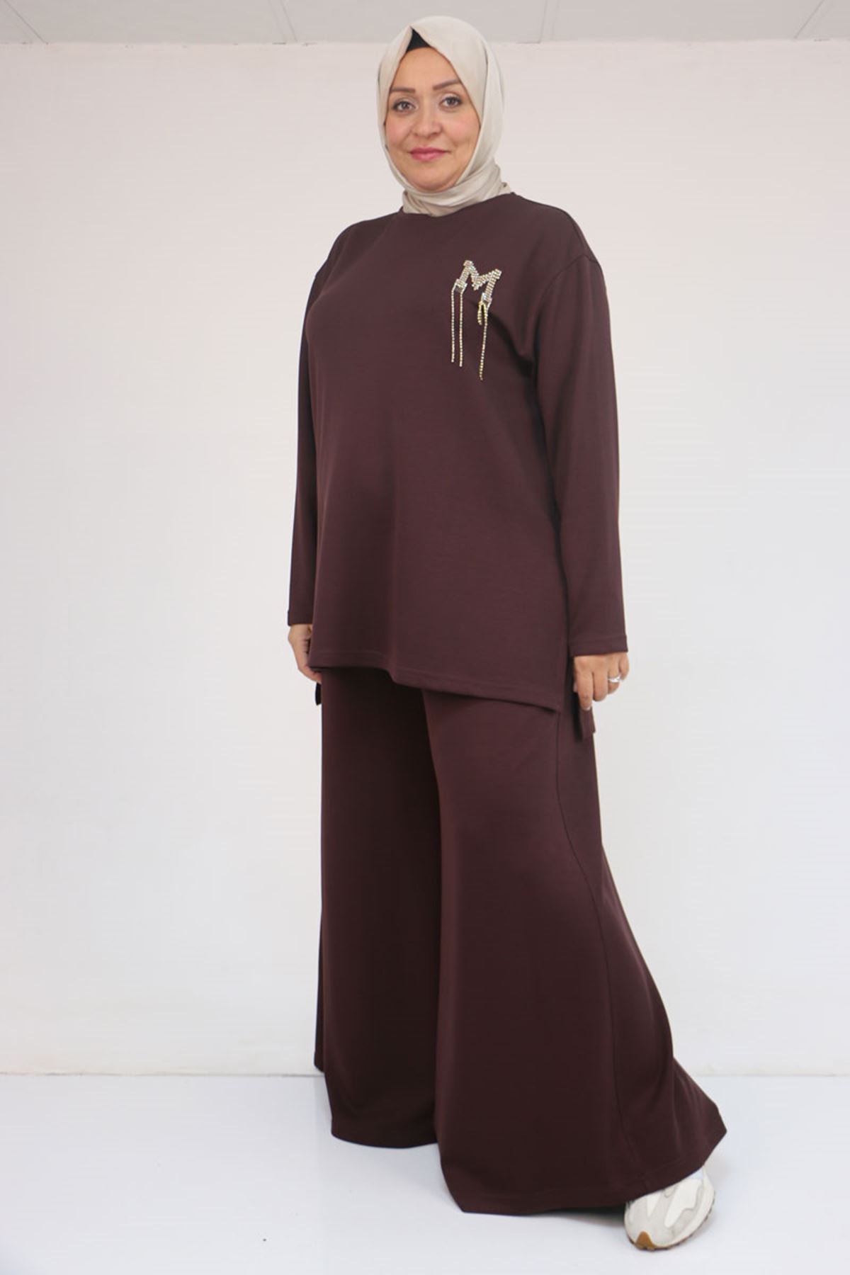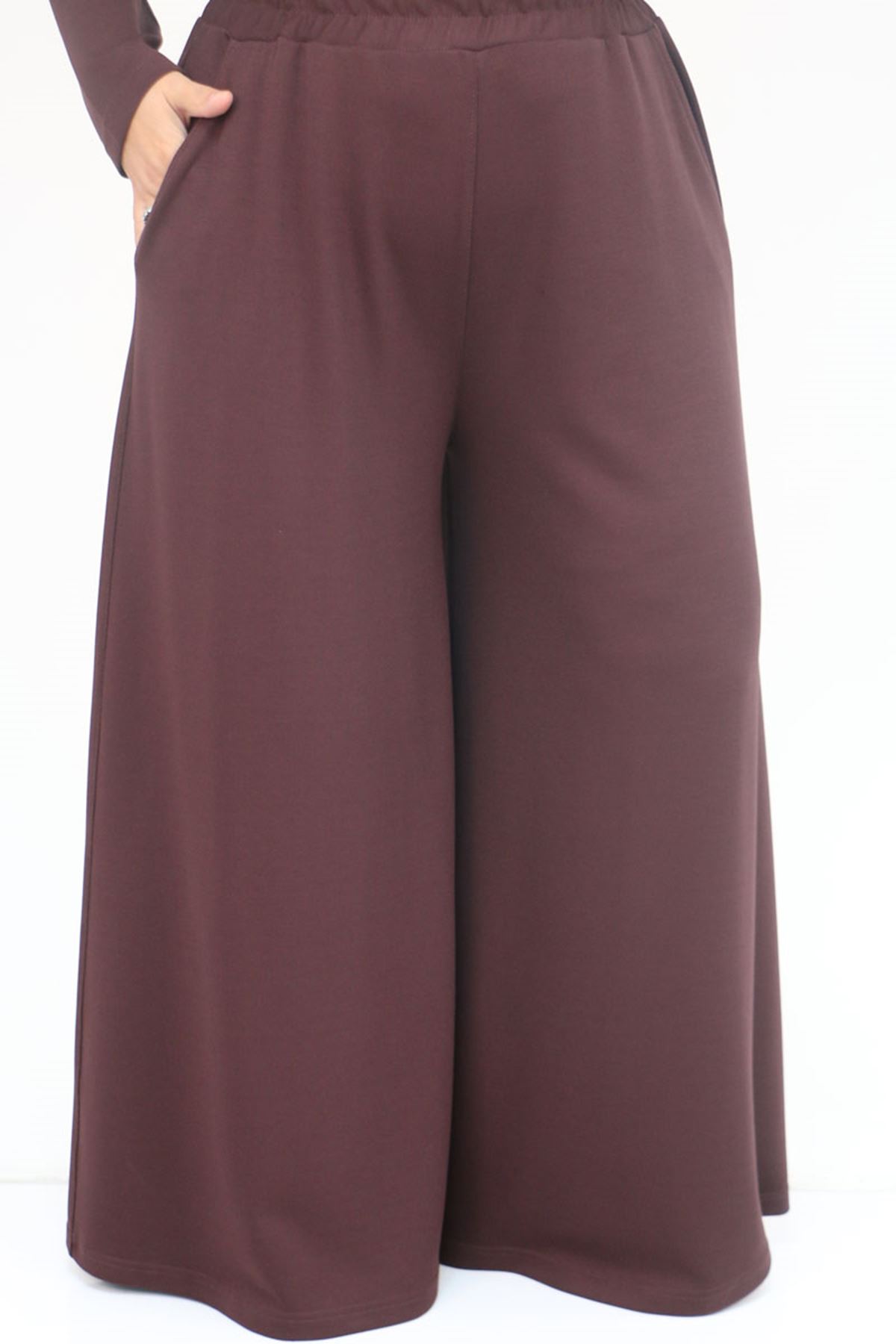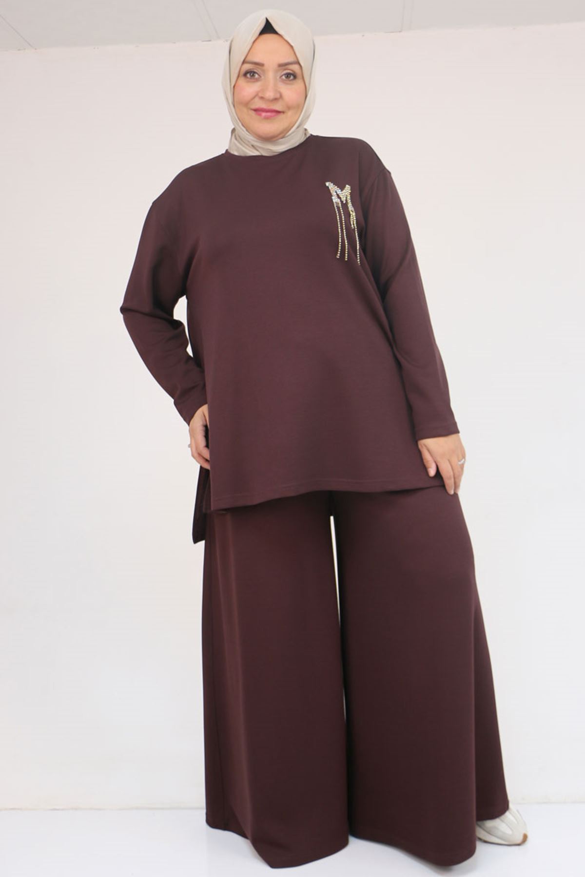 57043 Büyük Beden Yanı Yırtmaçlı Modal Pantolonlu Takım - Kahve