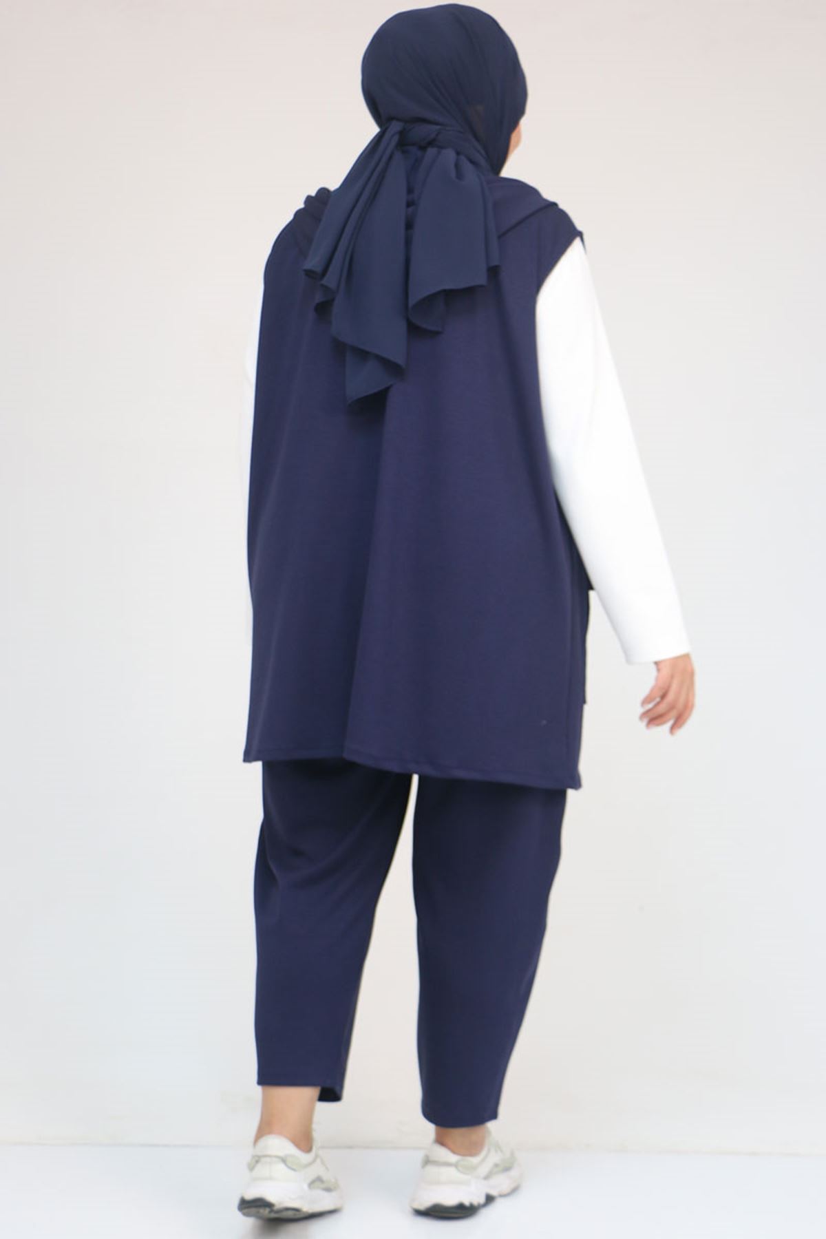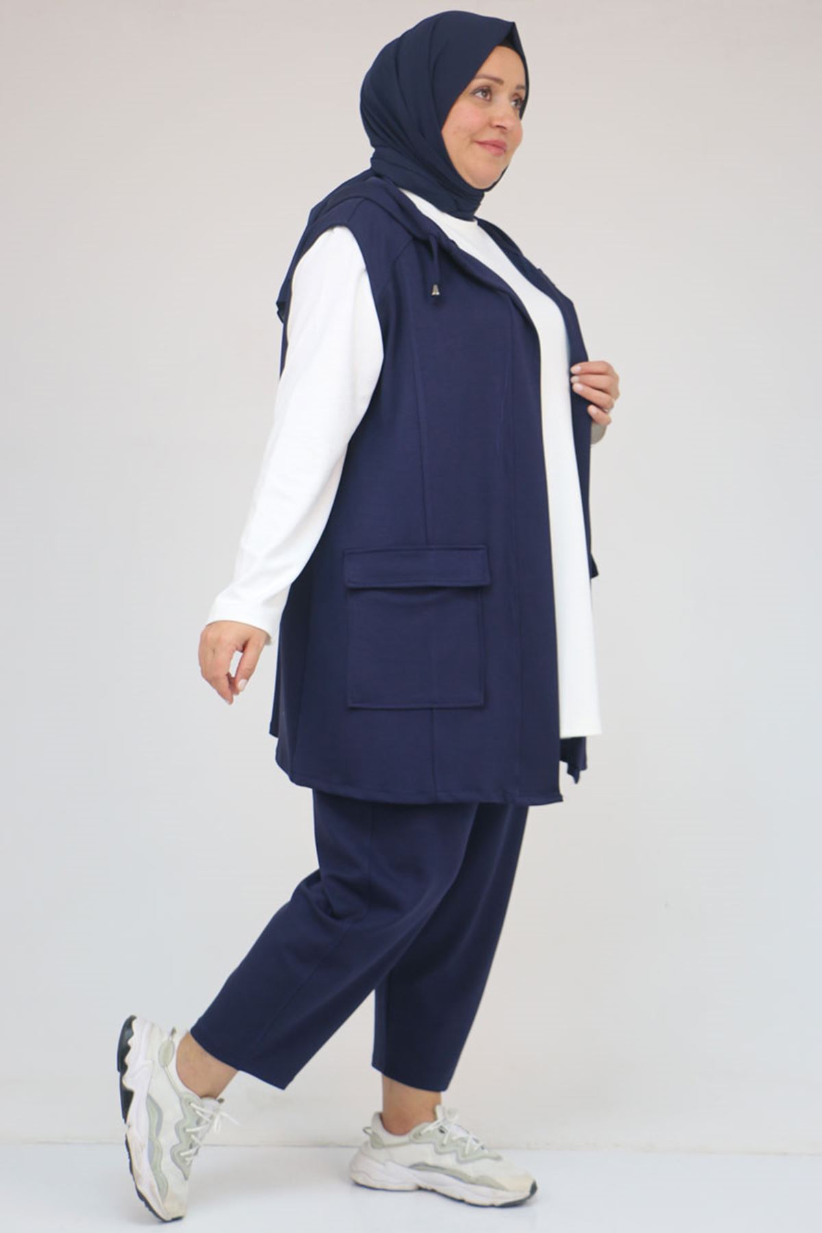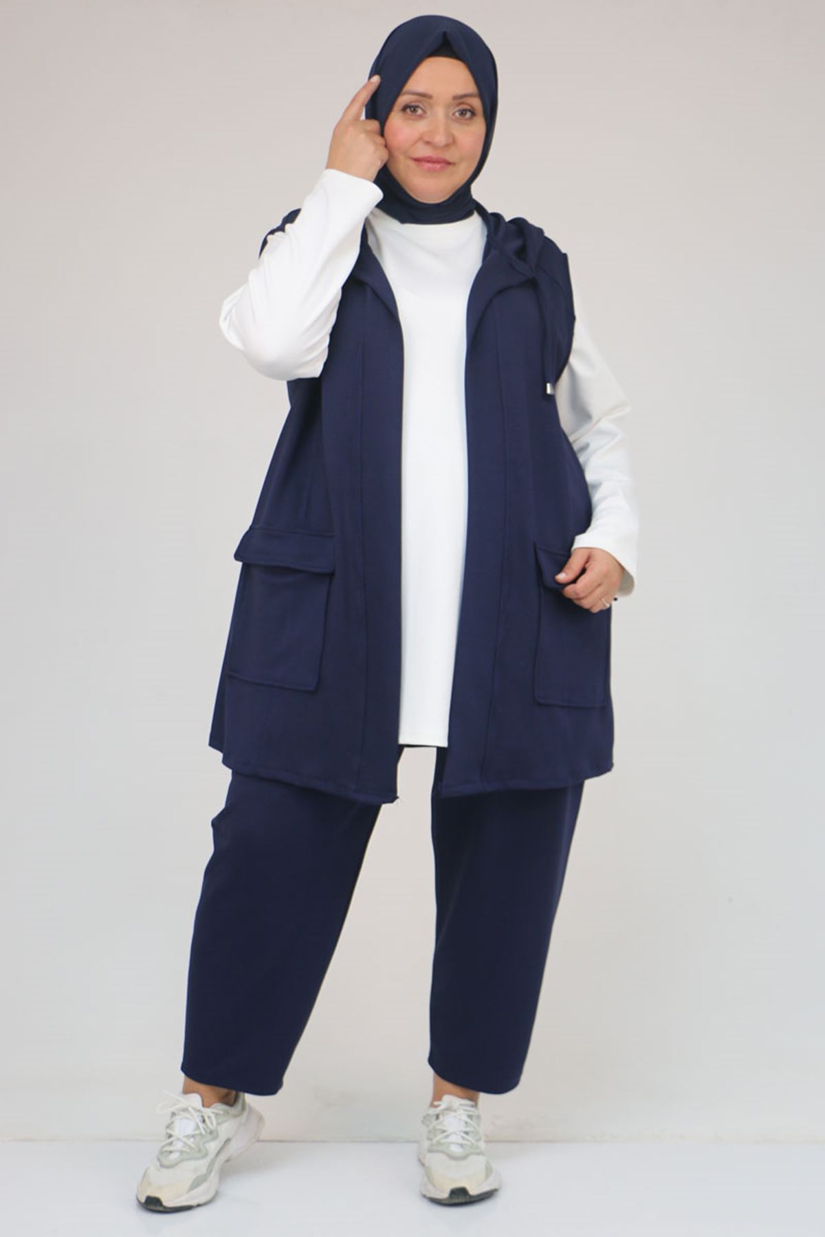 57305 Büyük Beden Modal Yeleği Cepli Üçlü Takım - İndigo