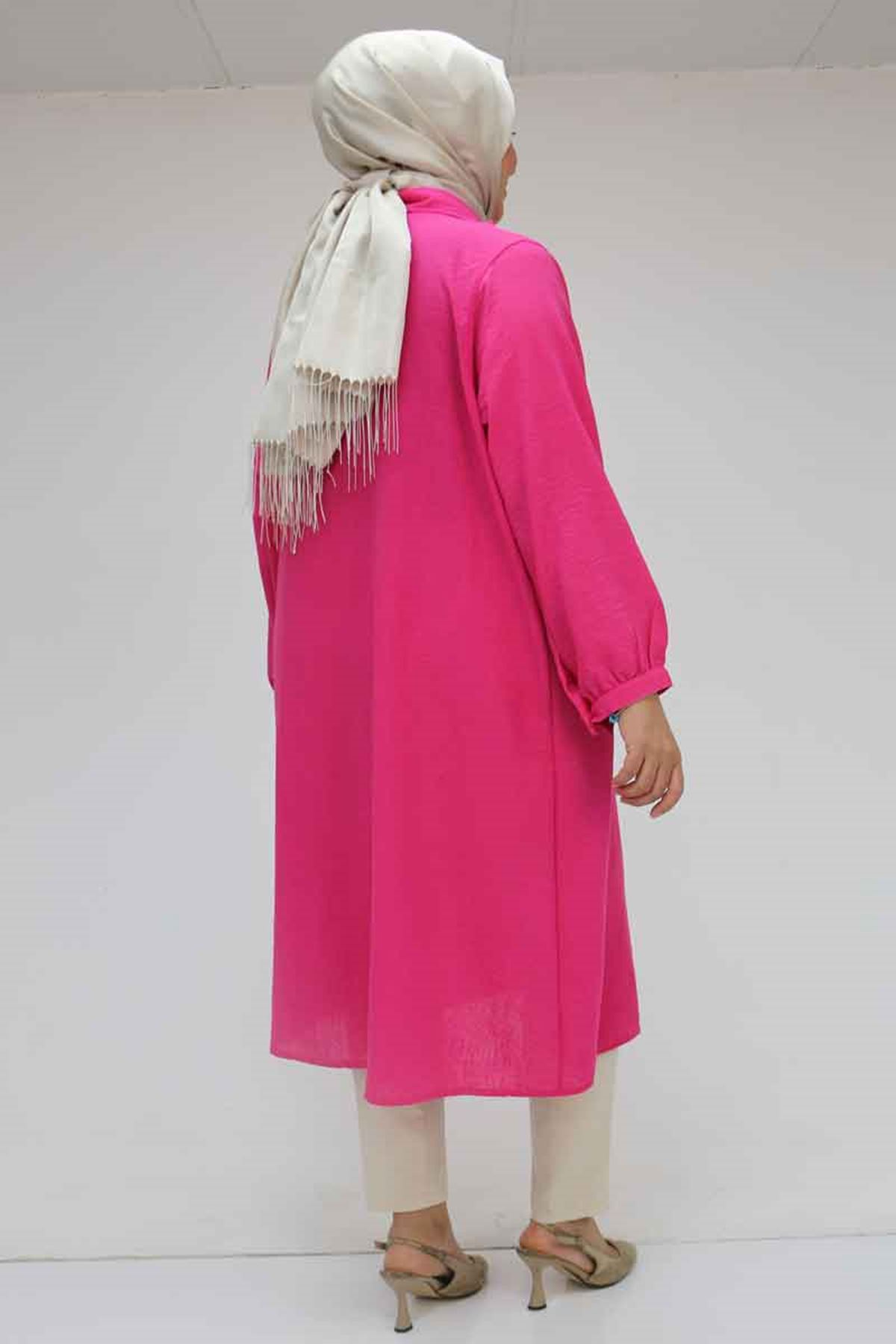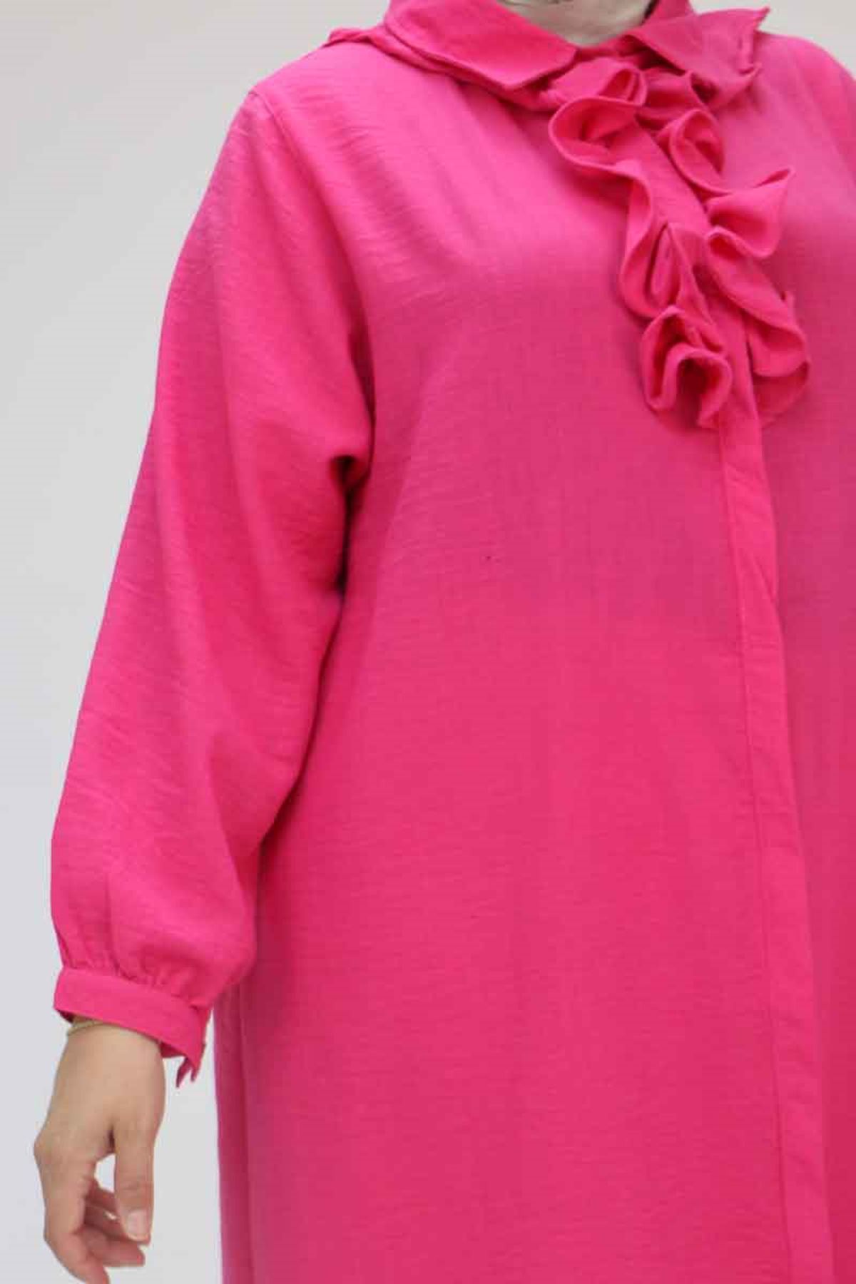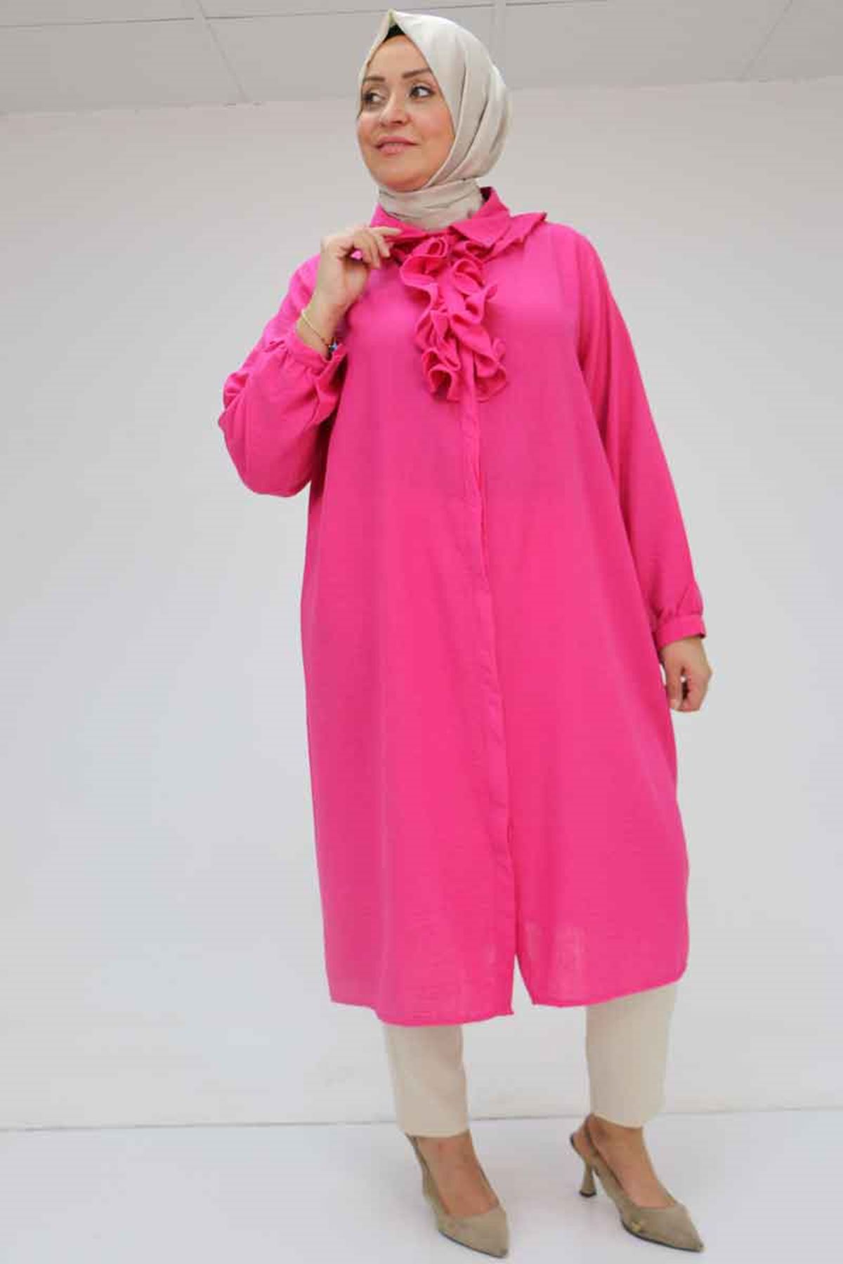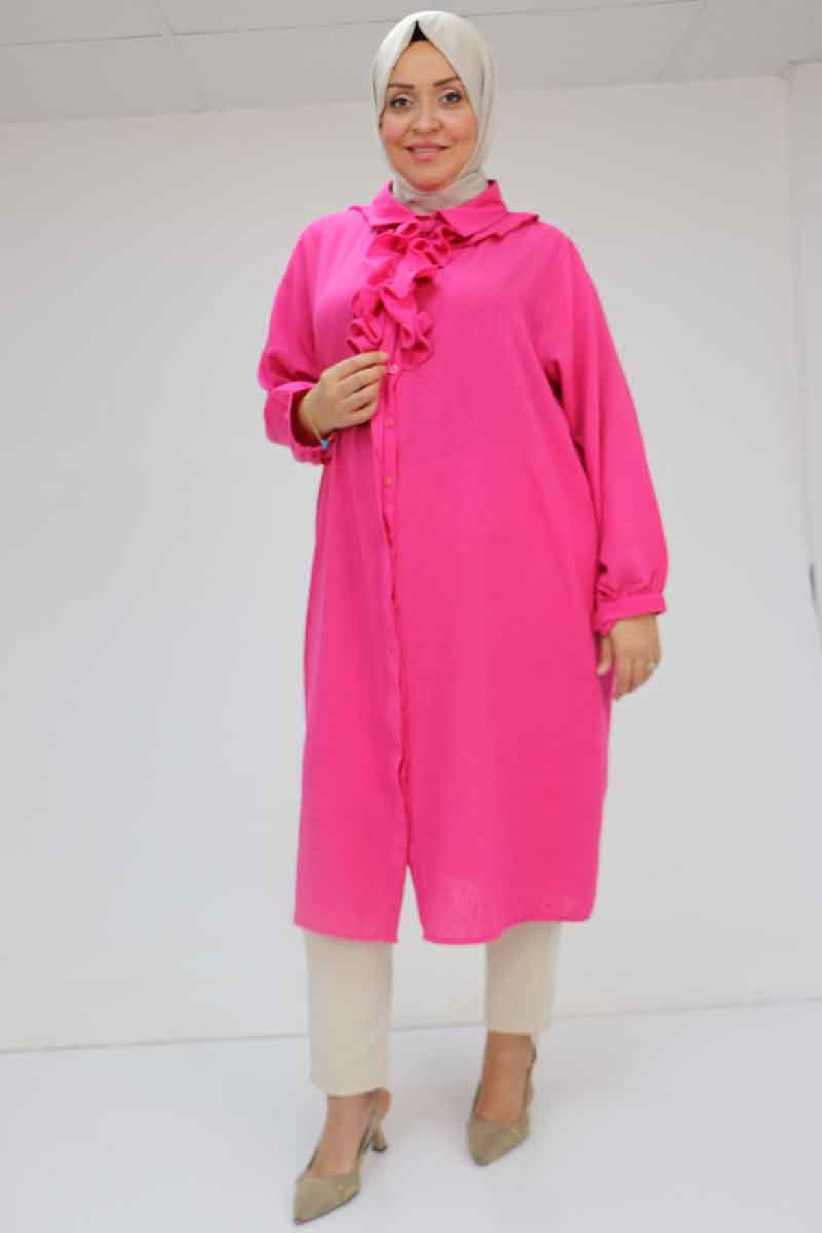 F-58029 Büyük Beden Önü Fırfırlı Düğmeli Keten Gömlek - Fuşya