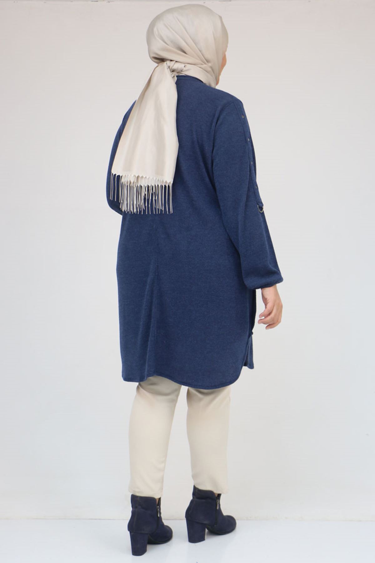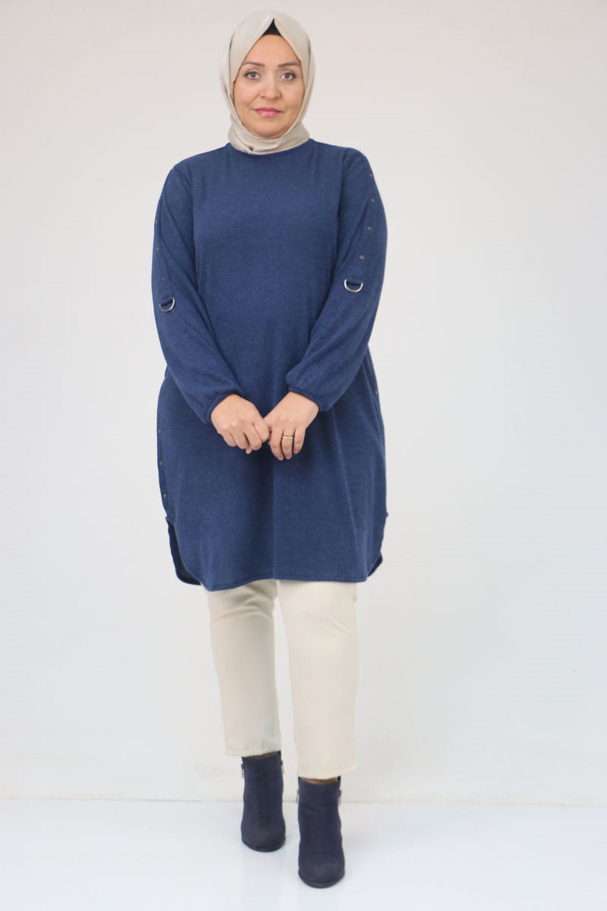 58131 Büyük Beden Kol Ve Etek Uçları Perçinli Mir Tunik - İndigo