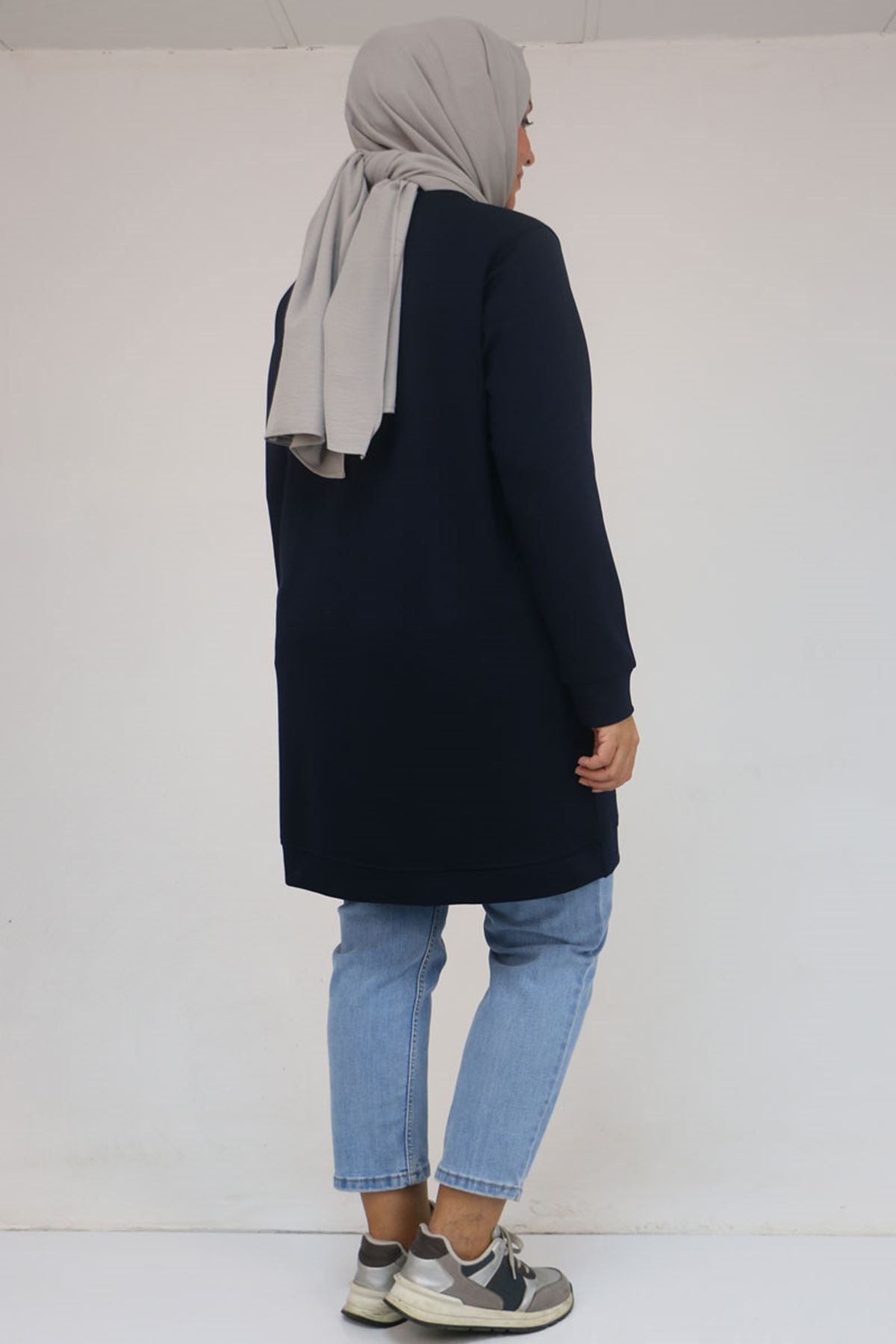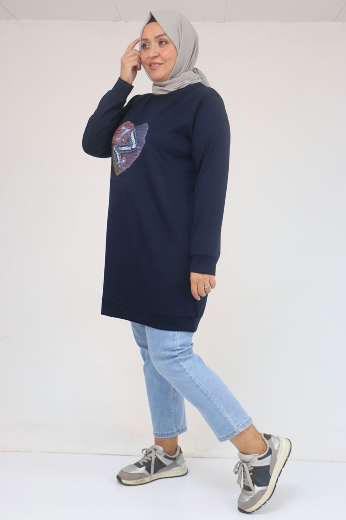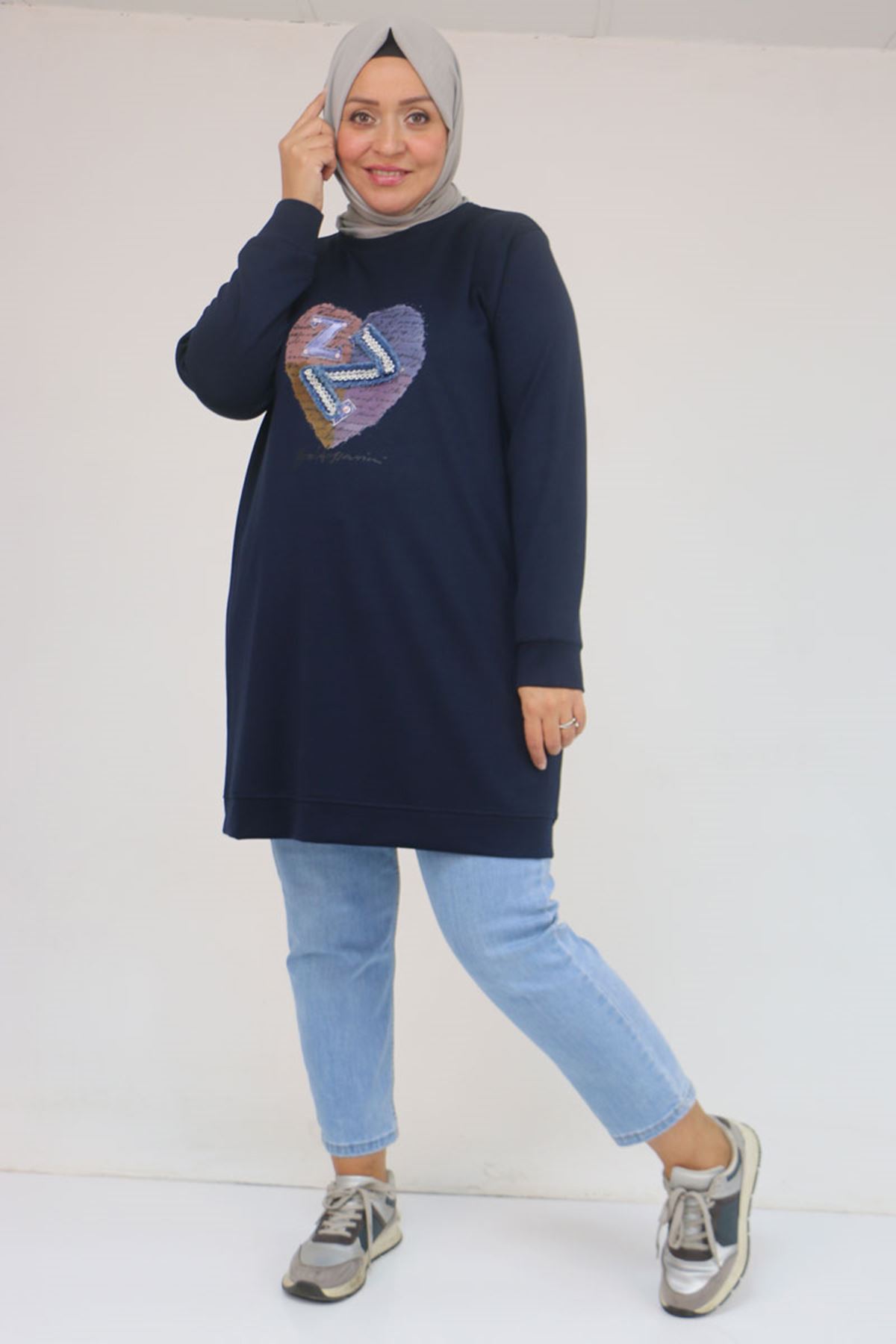 58141 Büyük Beden Önünde Kalp Baskılı Modal Tunik - Lacivert