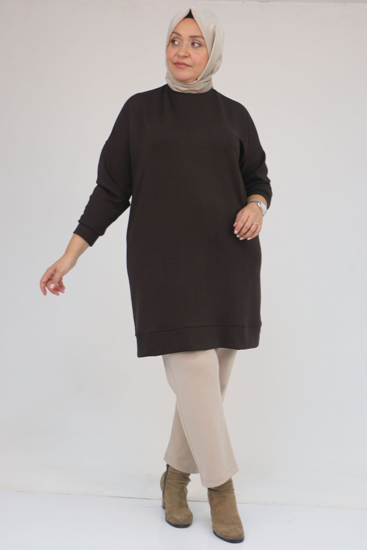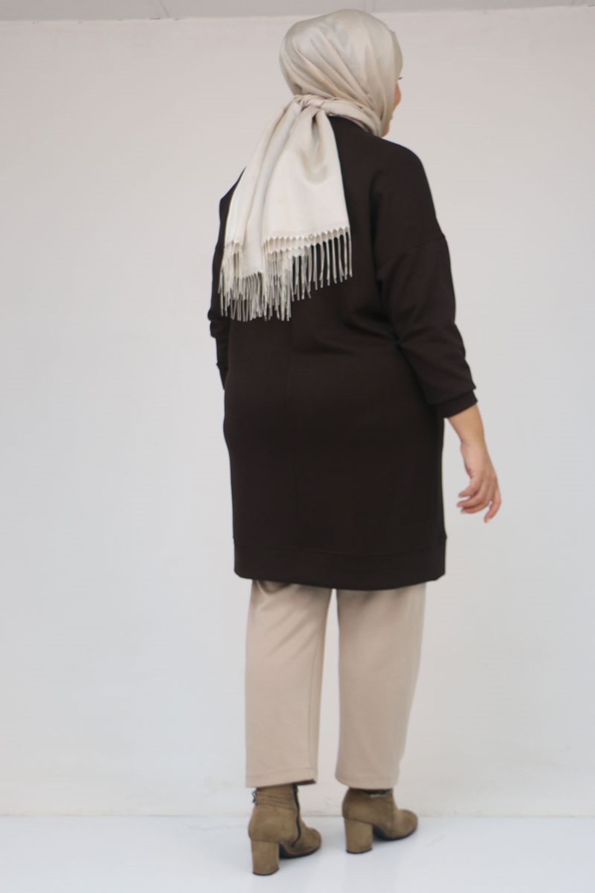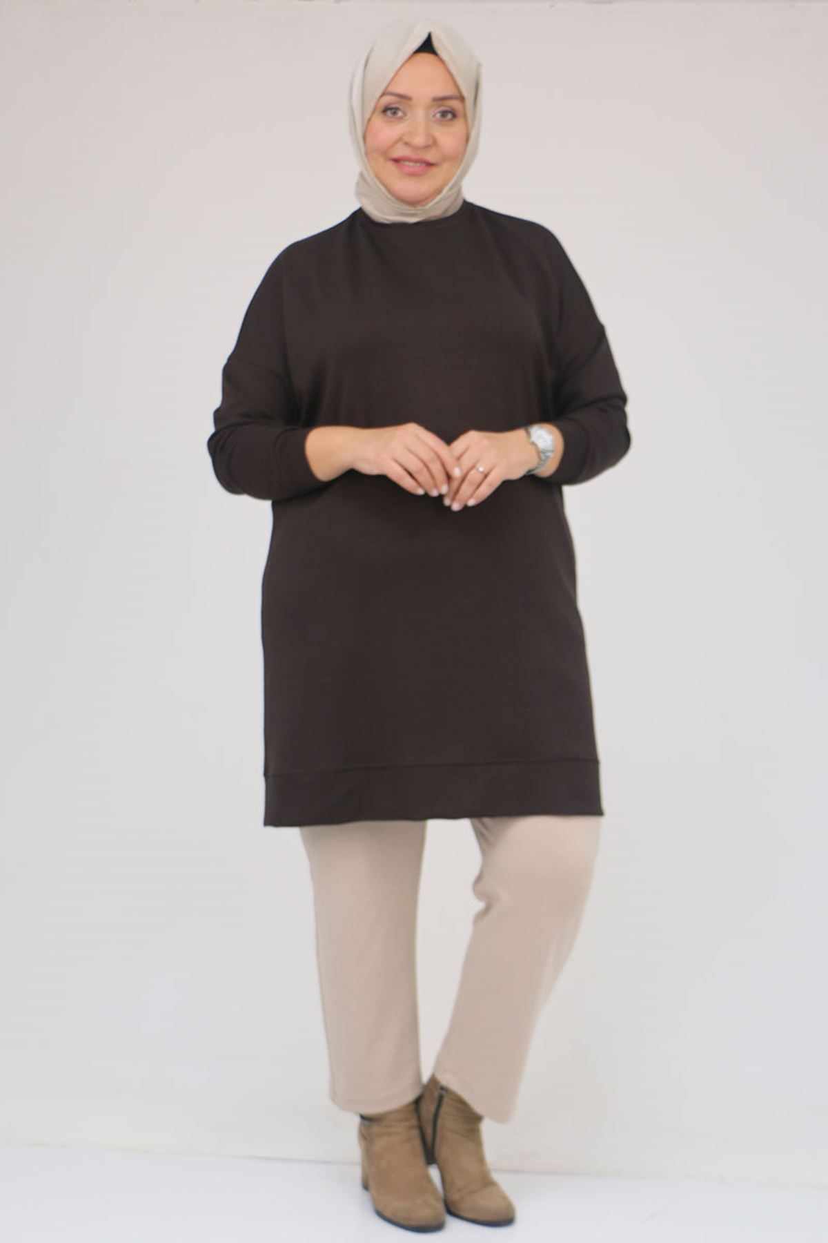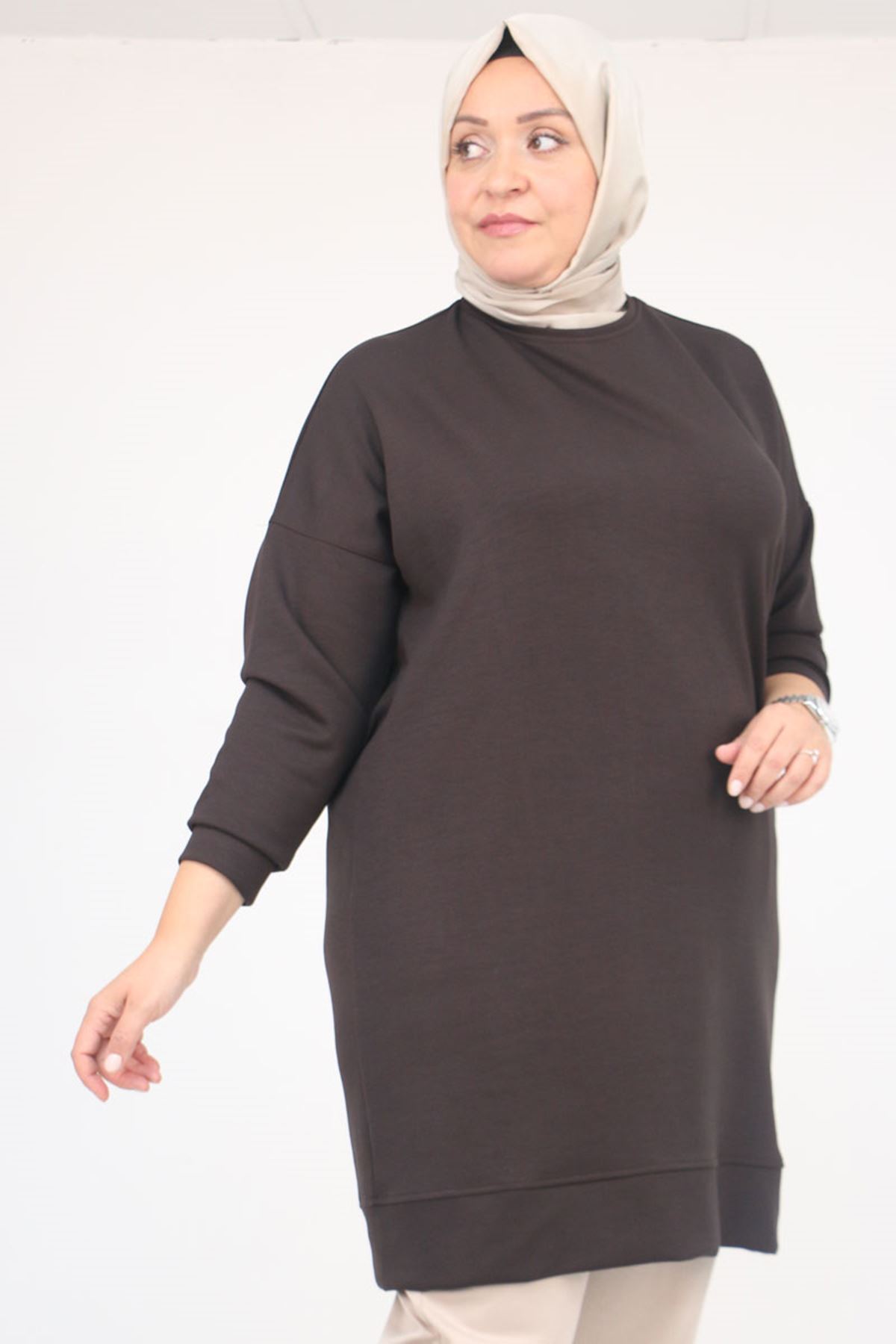 58151 Büyük Beden Kol Ve Etek Ucu Kendinden Ribanalı Modal Tunik - Kahve