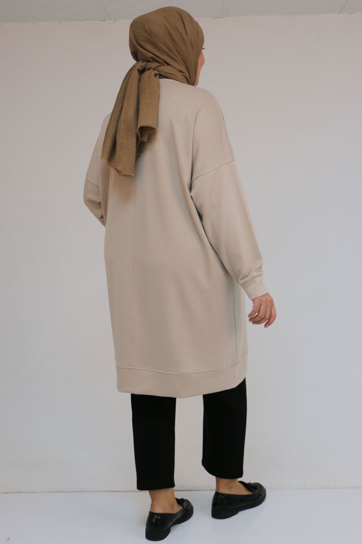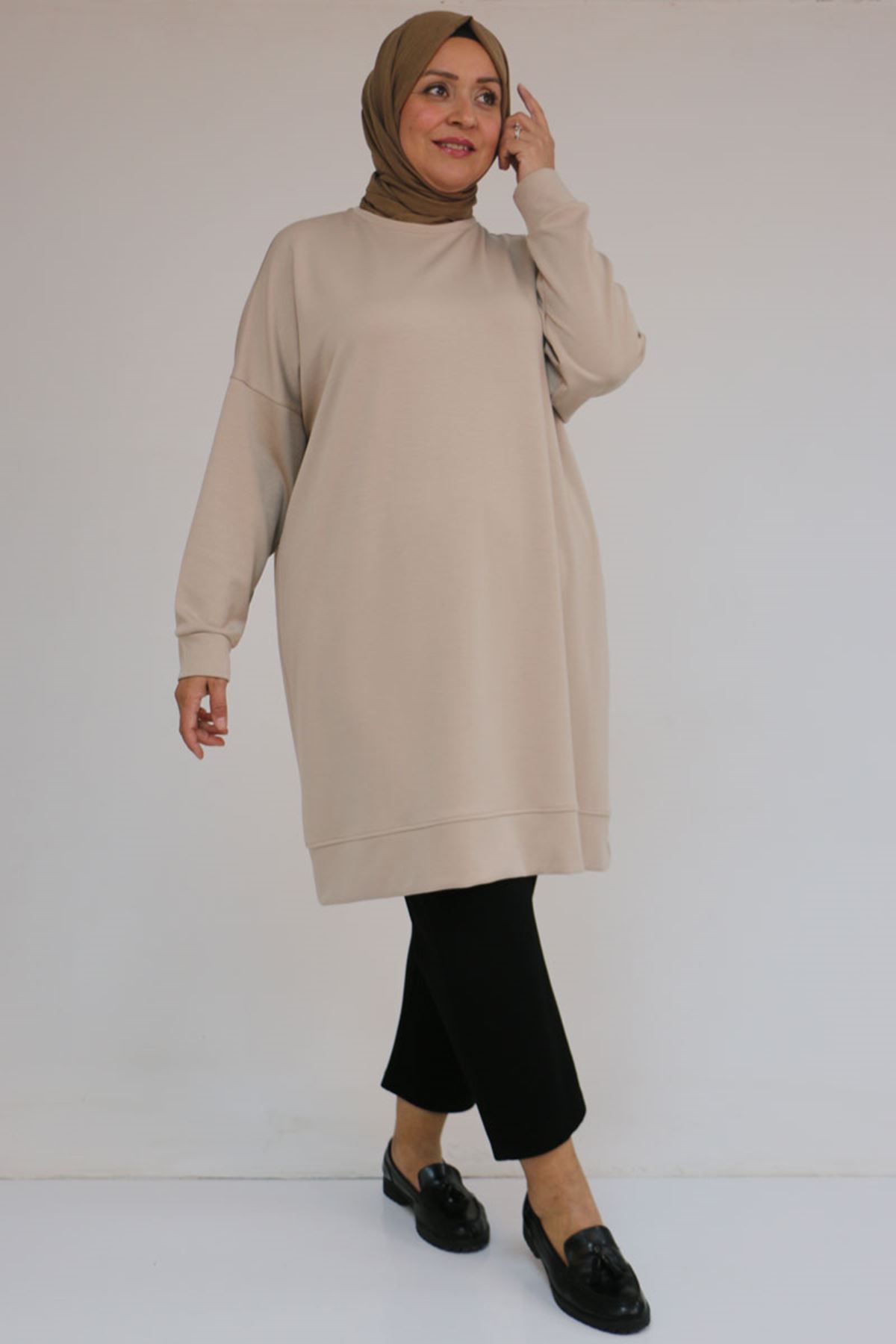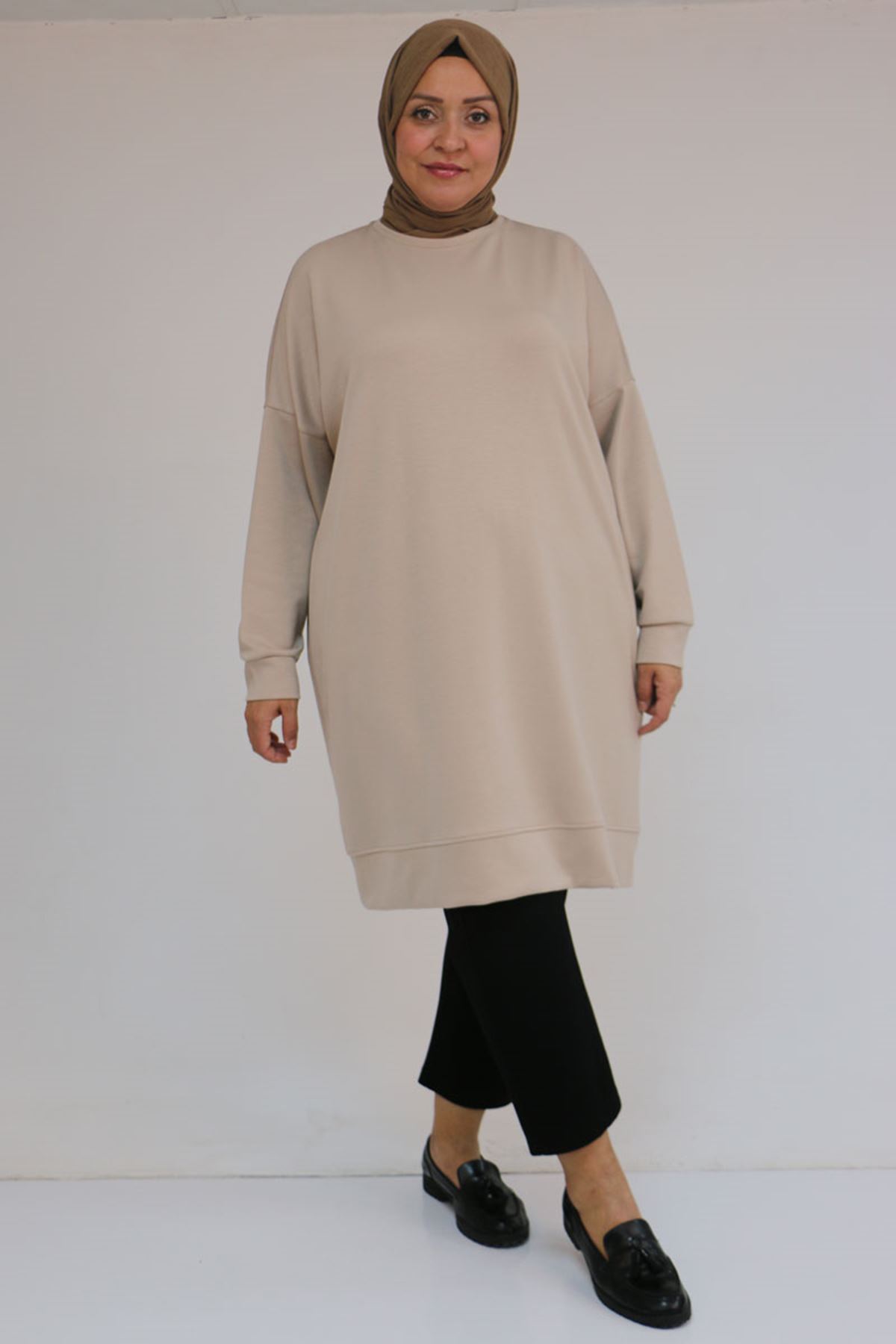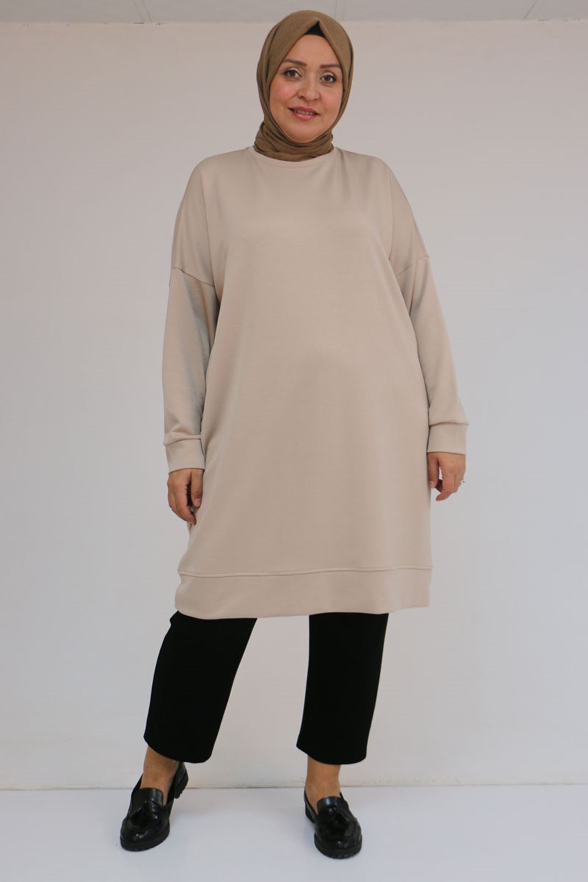 58151 Büyük Beden Kol Ve Etek Ucu Kendinden Ribanalı Modal Tunik - Vizon