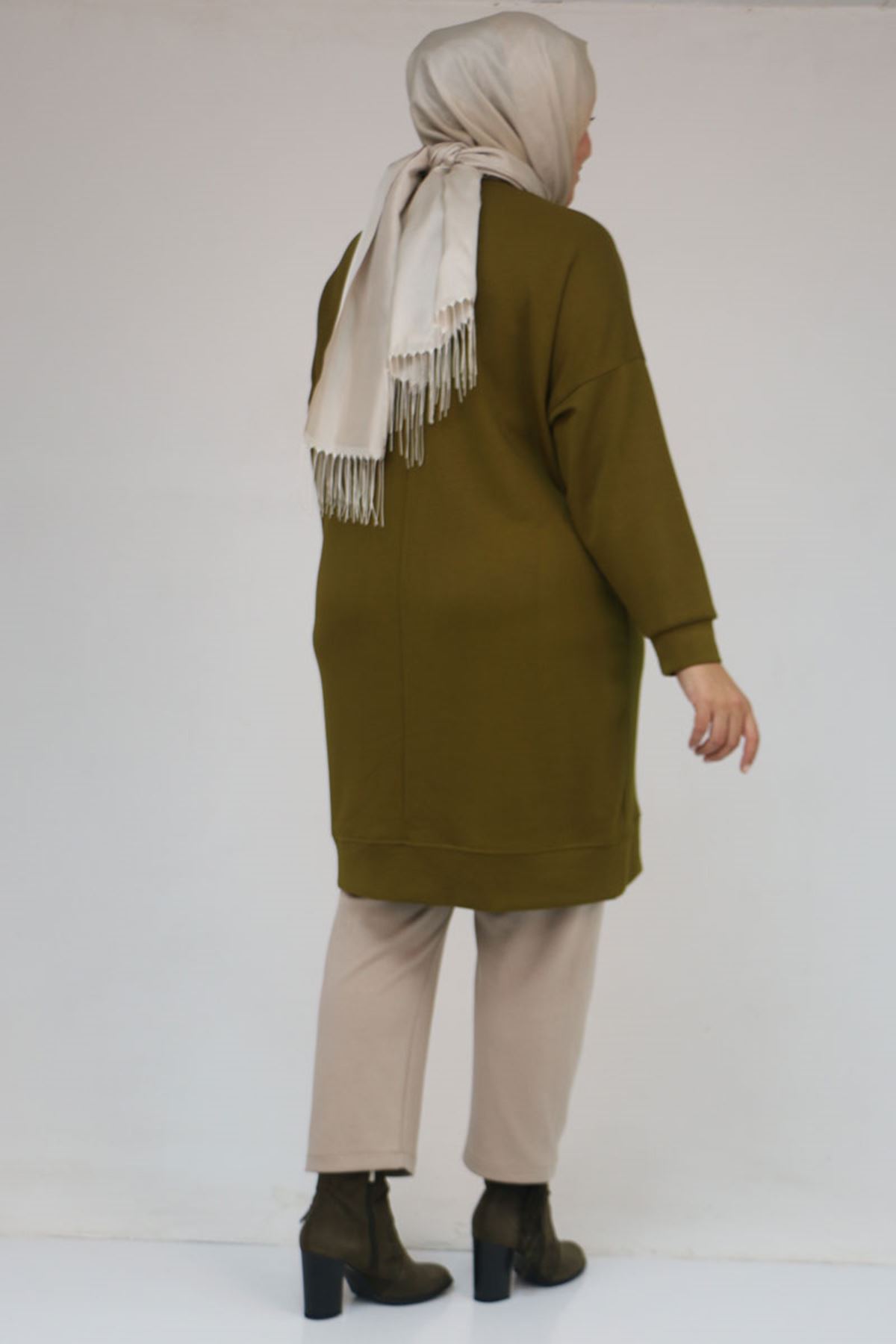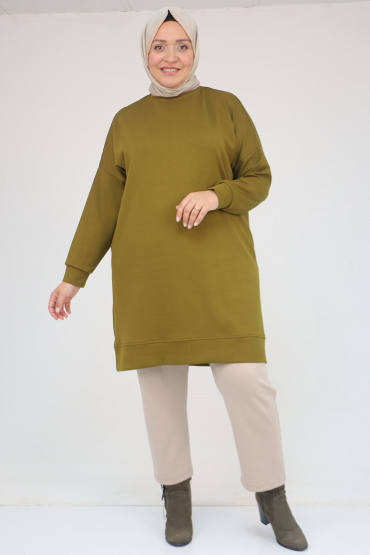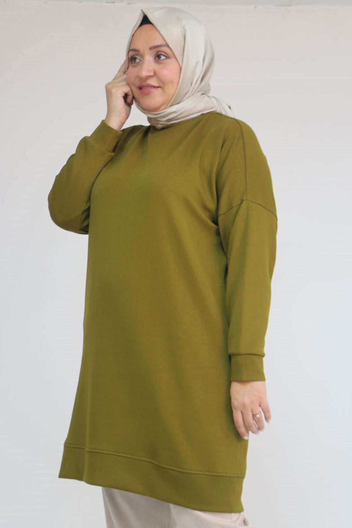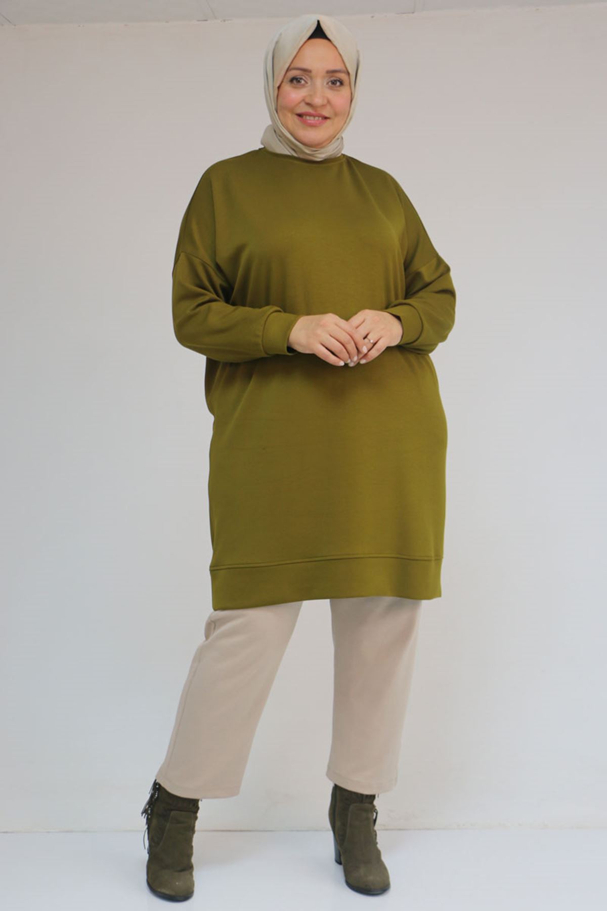 58151 Büyük Beden Kol Ve Etek Ucu Kendinden Ribanalı Modal Tunik - Yağ Yeşili