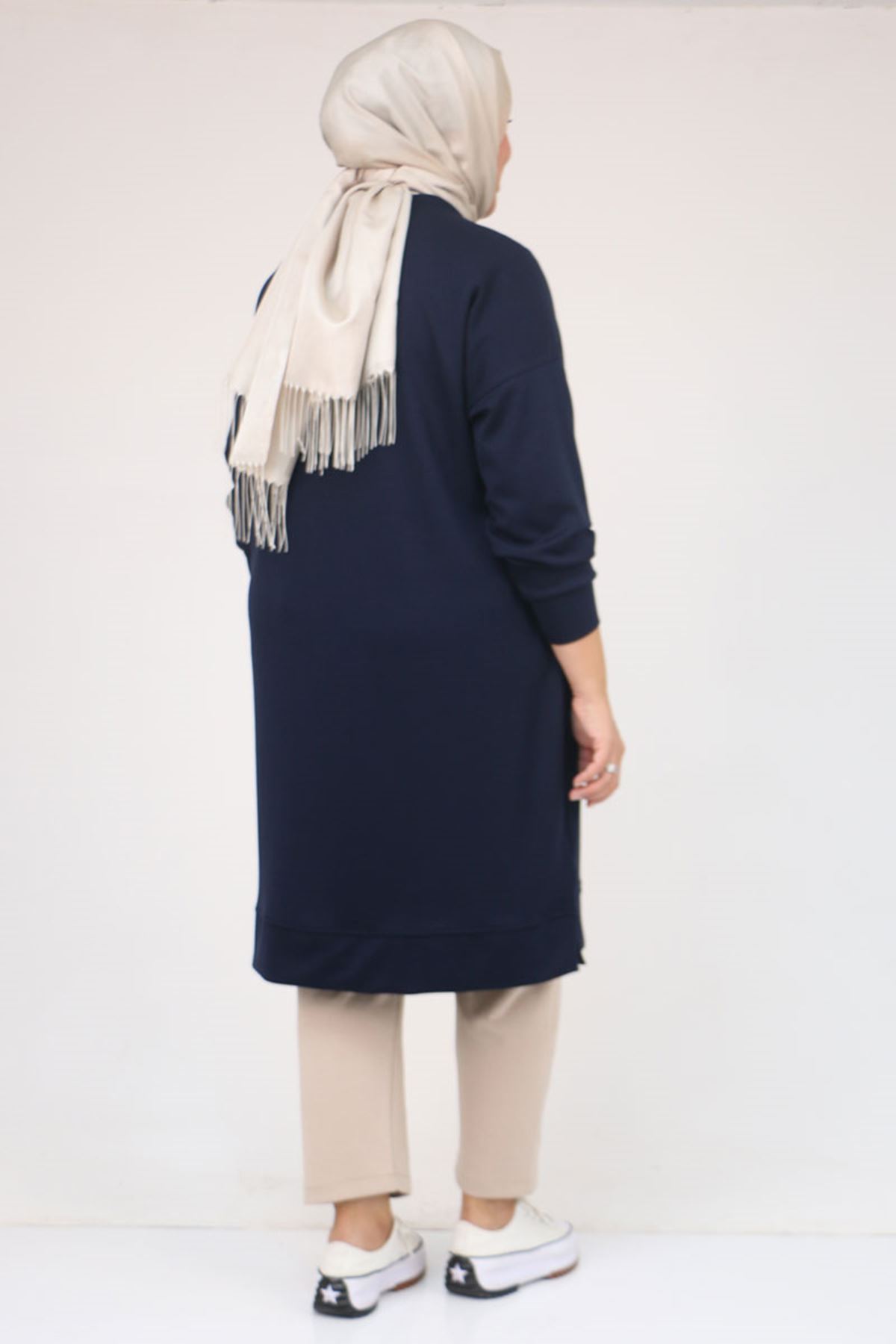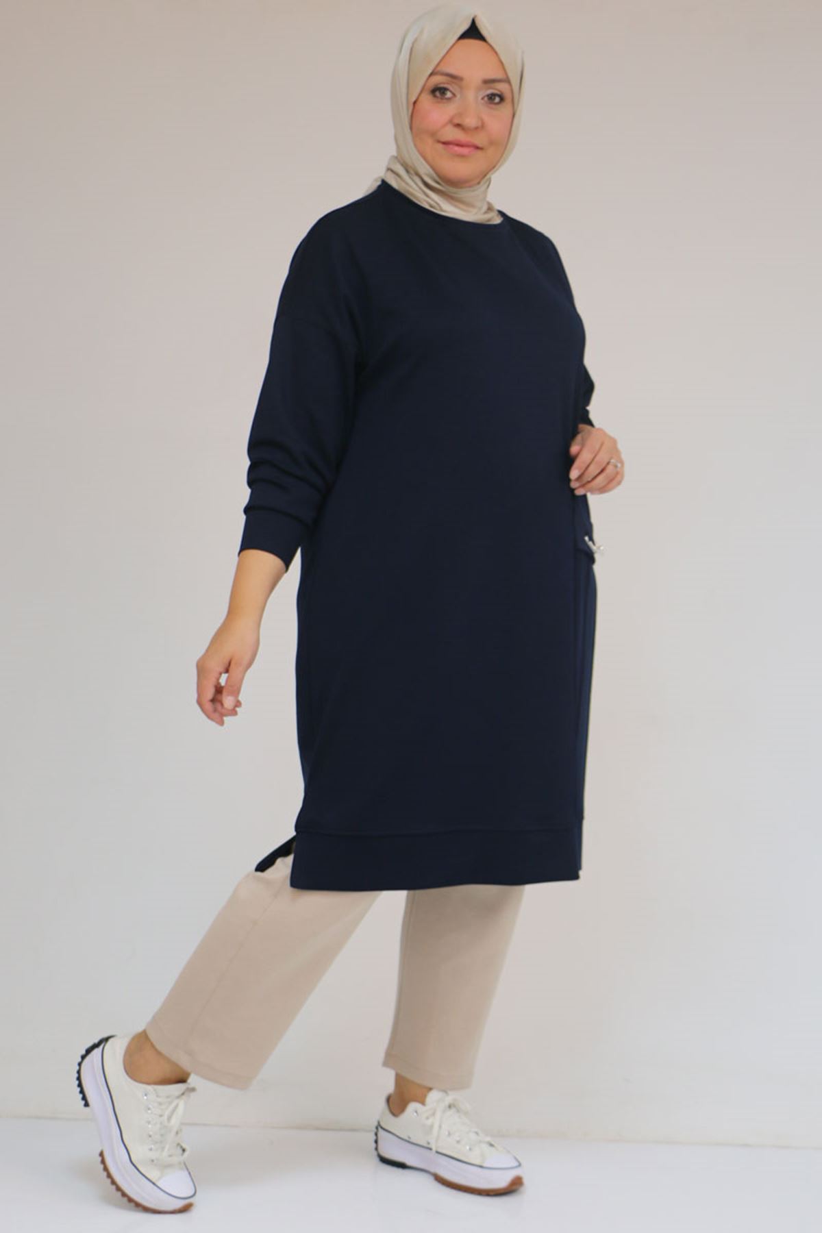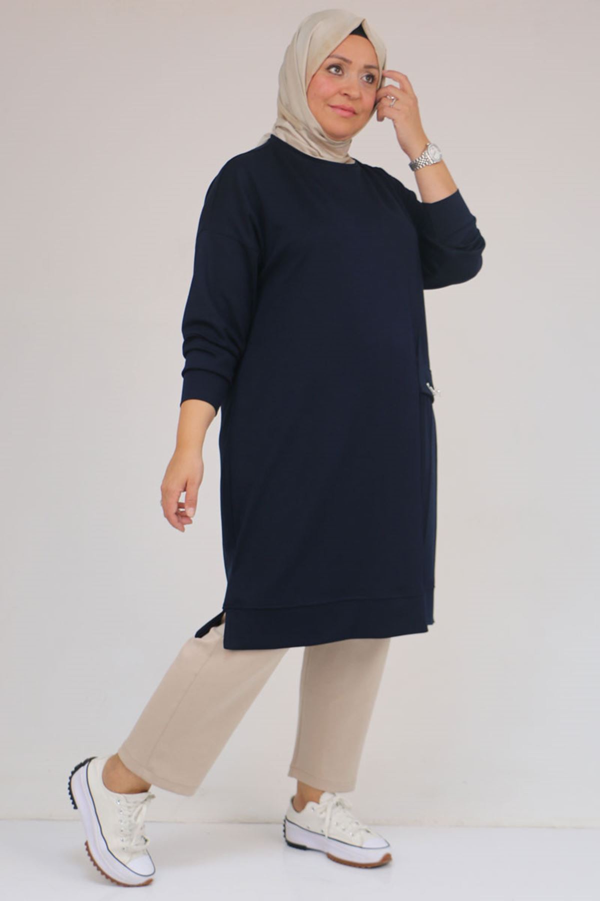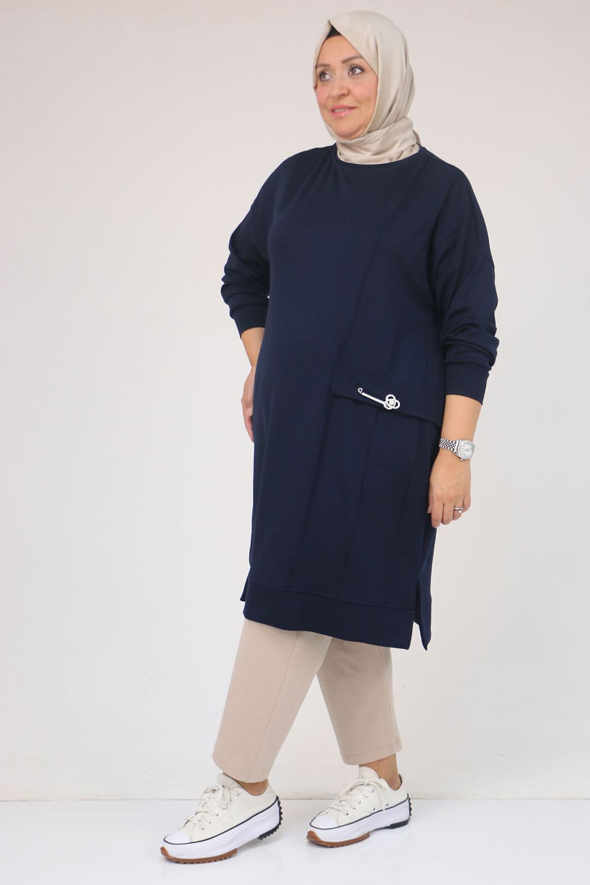 58160 - Büyük Beden İncili Bros Detaylı Modal Tunik - Lacivert
