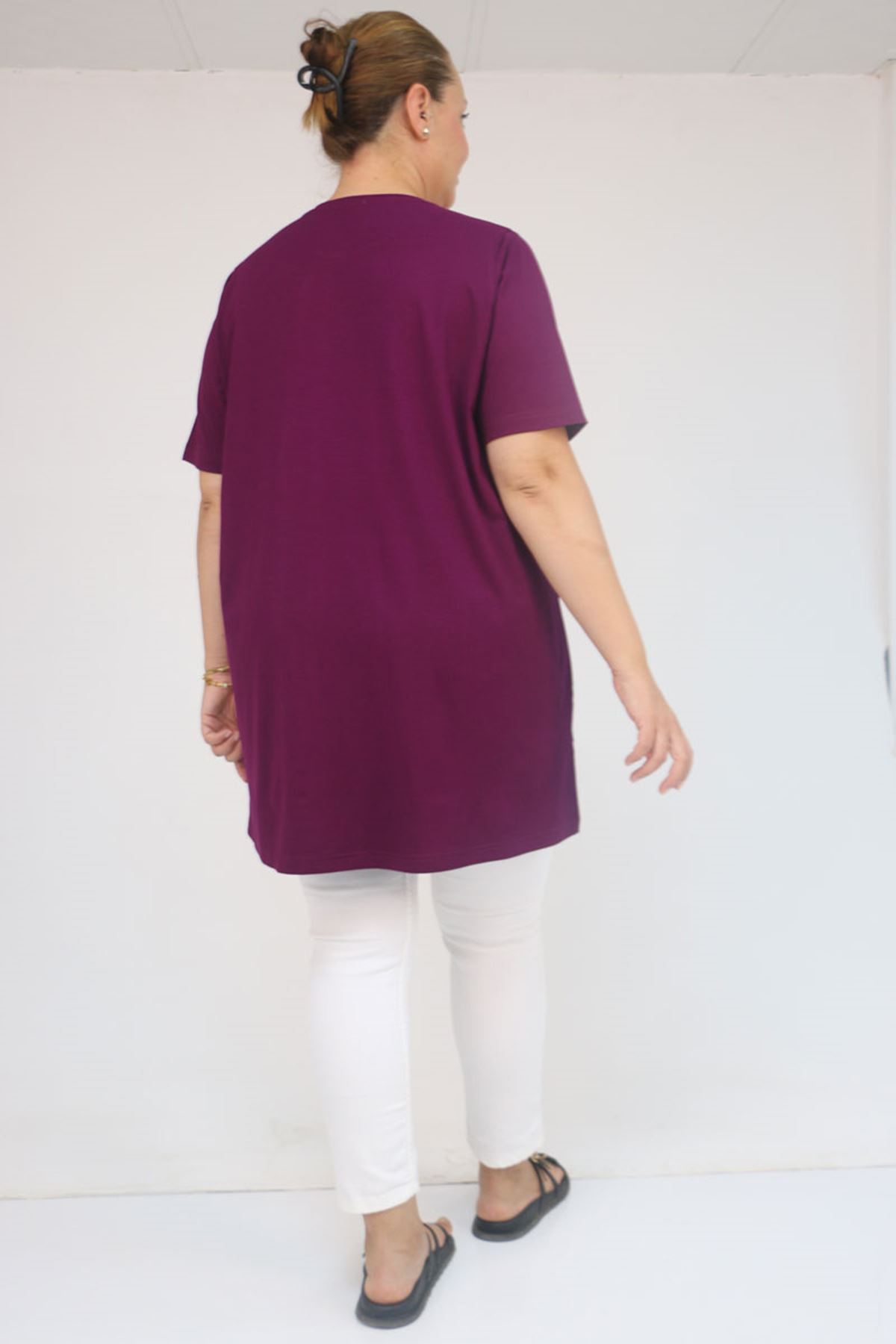 58507 Büyük Beden Yakası Biyeli Penye Tişört - Mürdüm