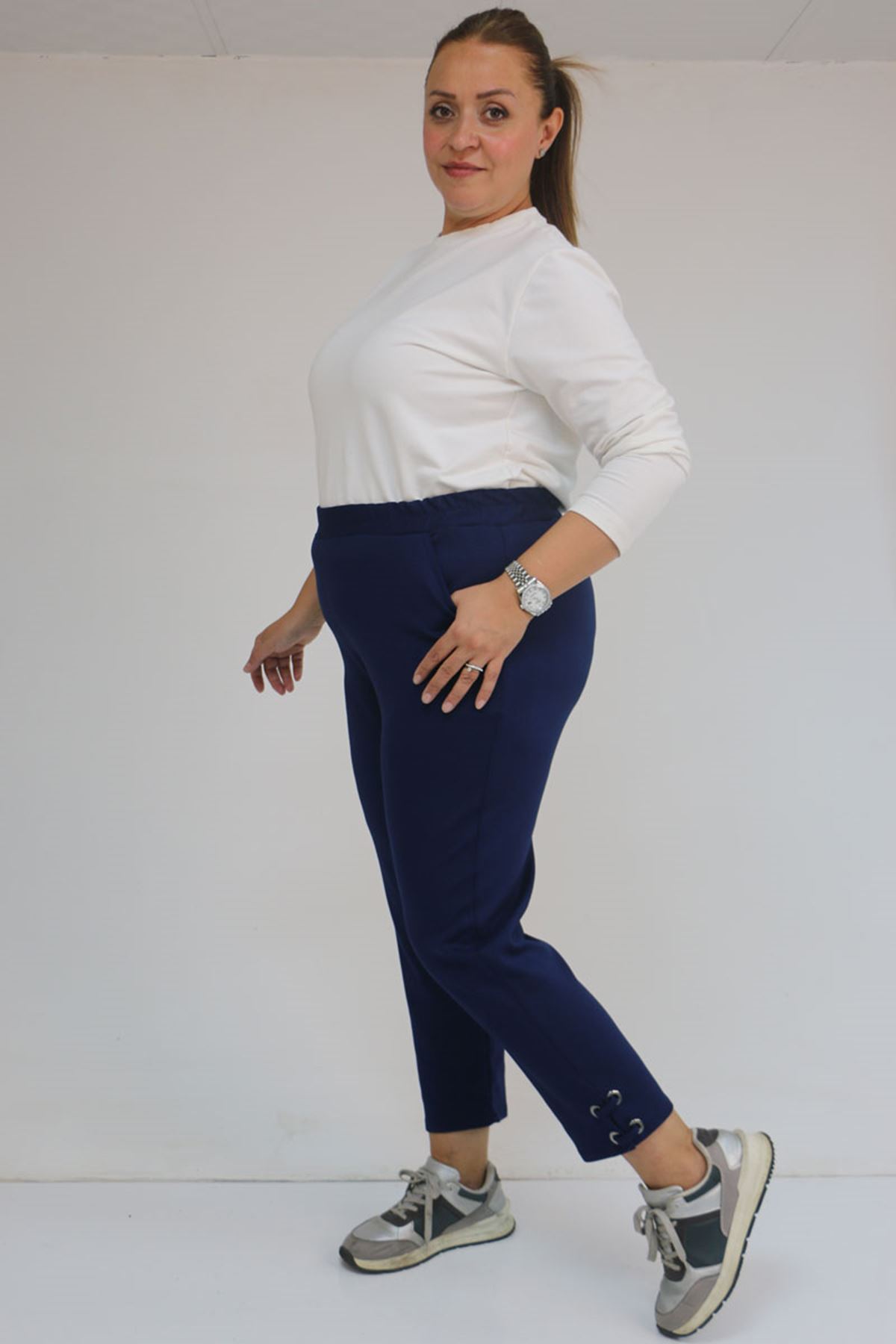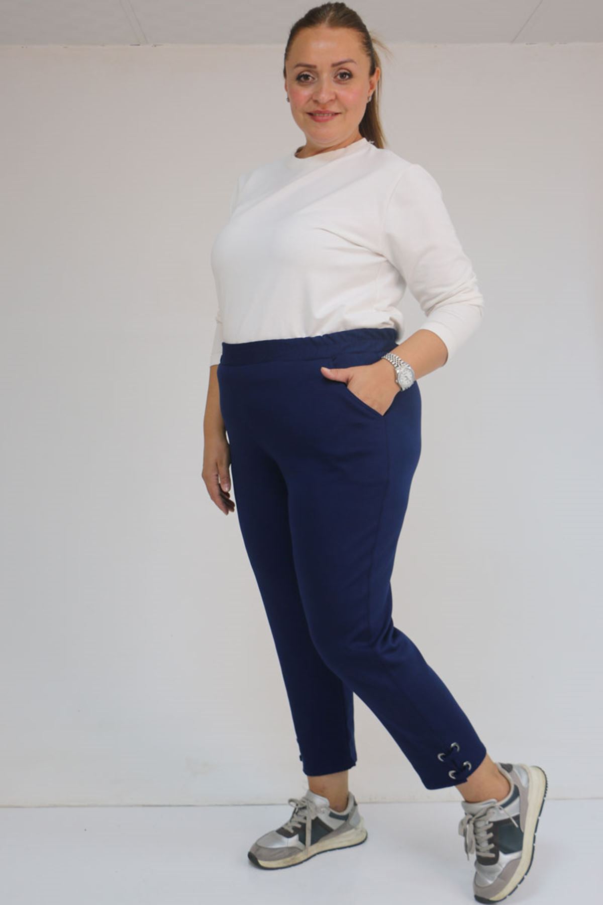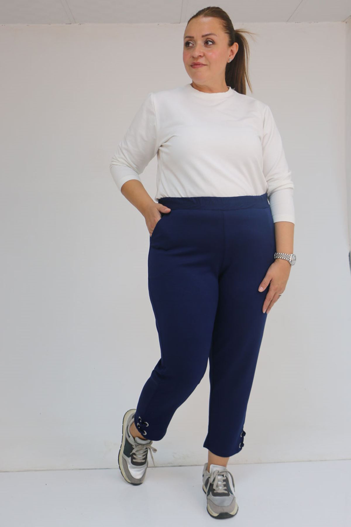 59012 Büyük Beden Paçasında Kuş Gözü Detaylı Modal Pantolon - İndigo