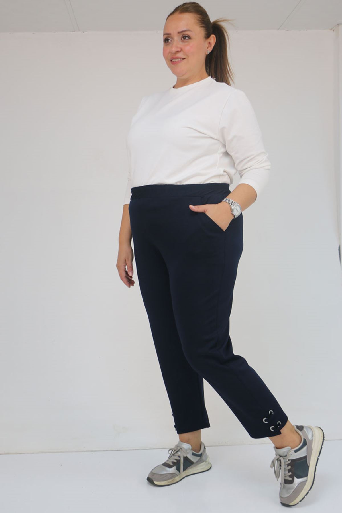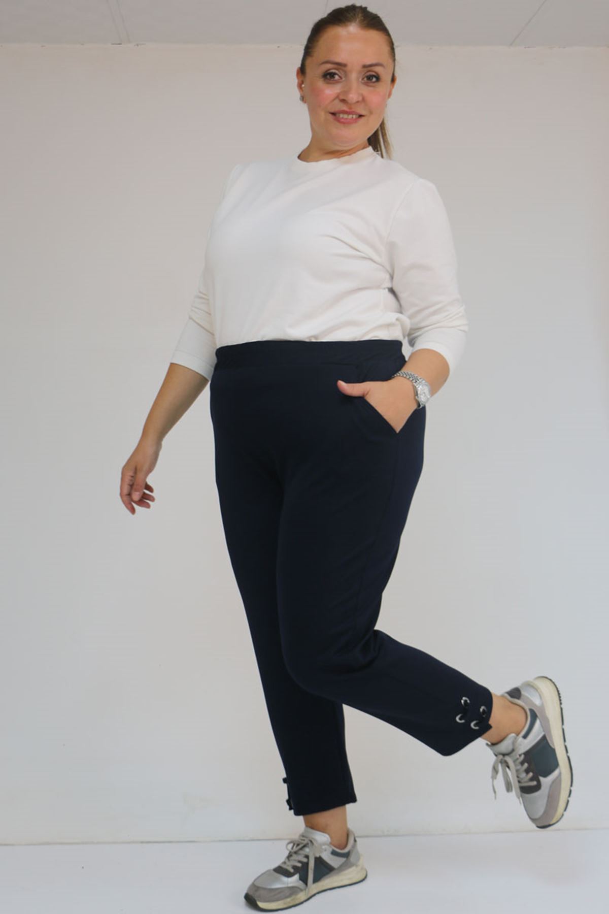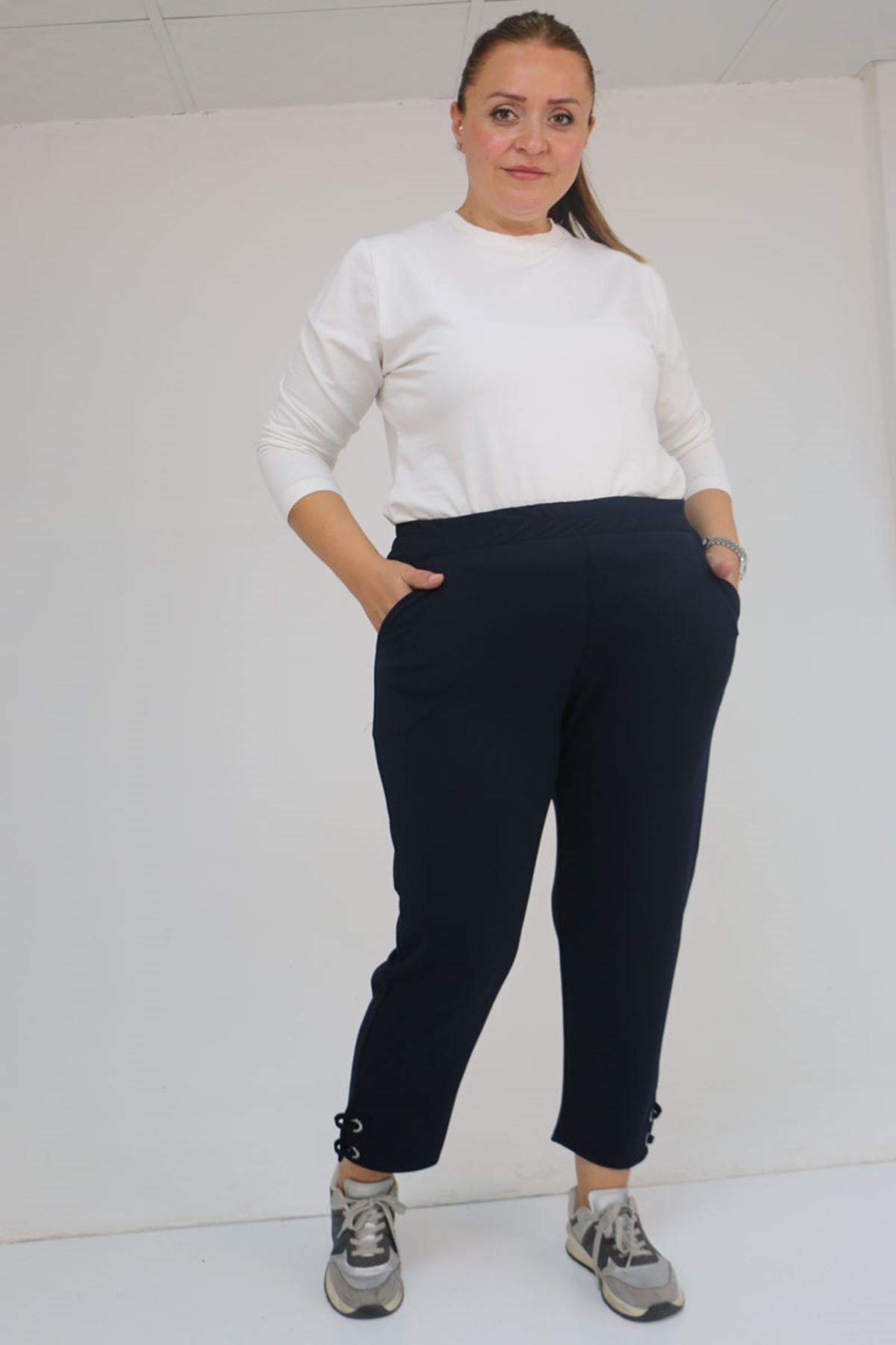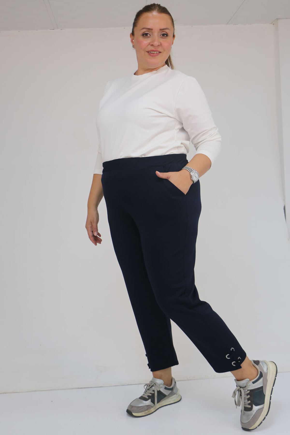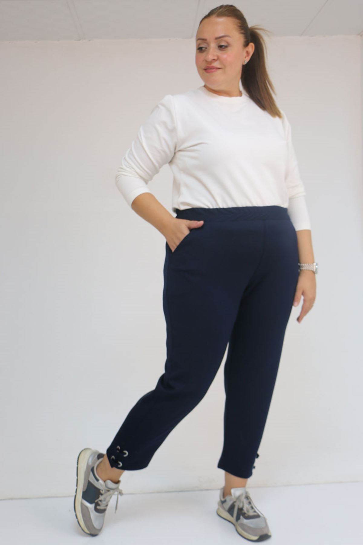 59012 Büyük Beden Paçasında Kuş Gözü Detaylı Modal Pantolon - Lacivert