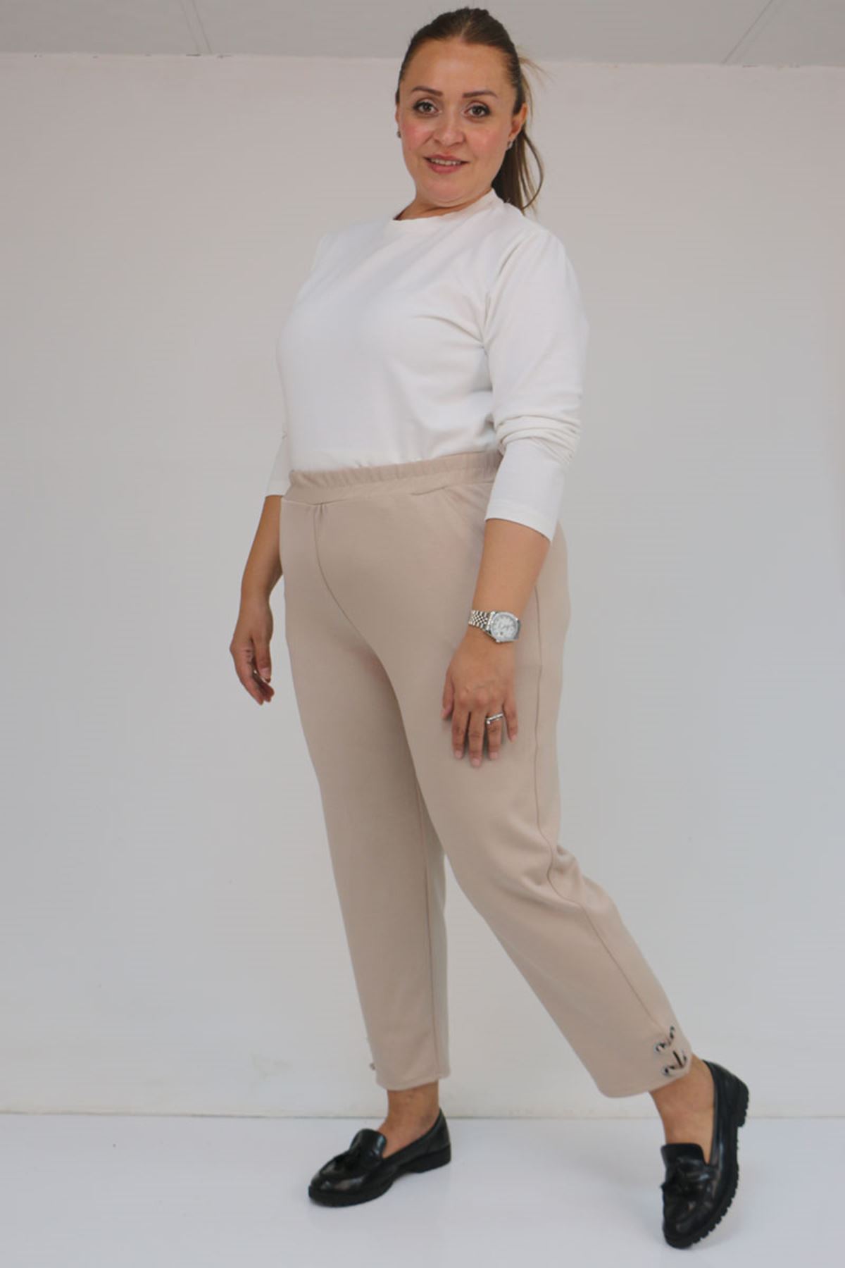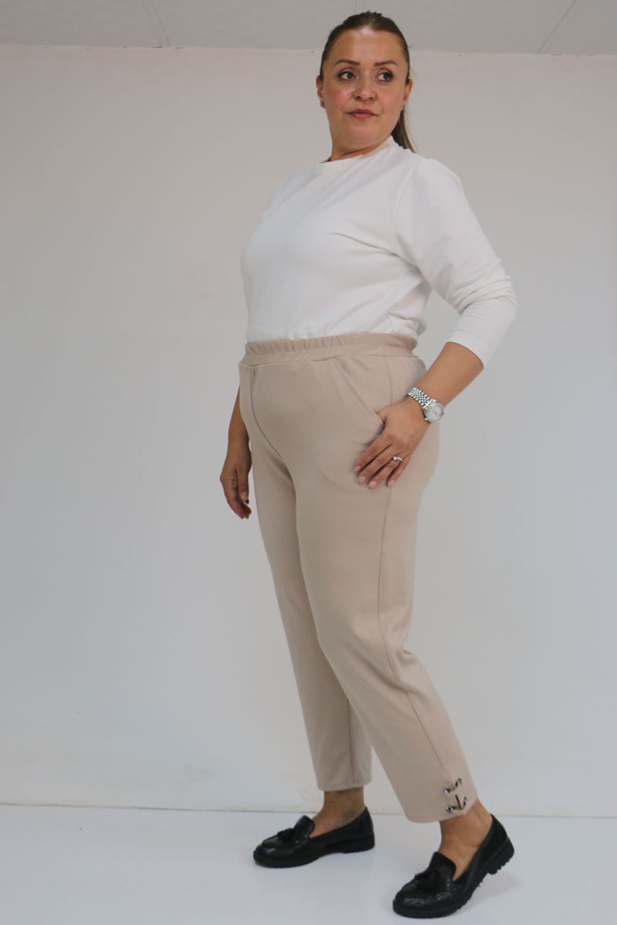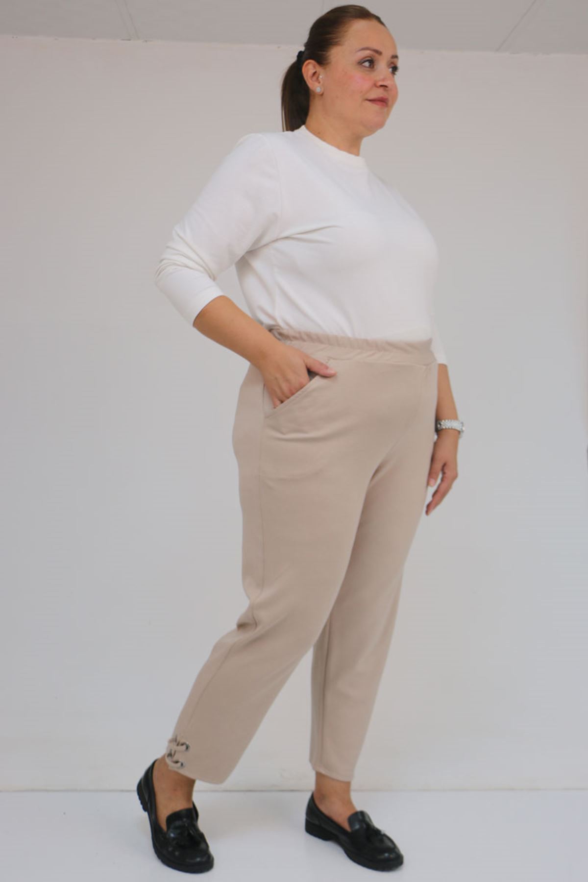 59012 Büyük Beden Paçasında Kuş Gözü Detaylı Modal Pantolon - Vizon