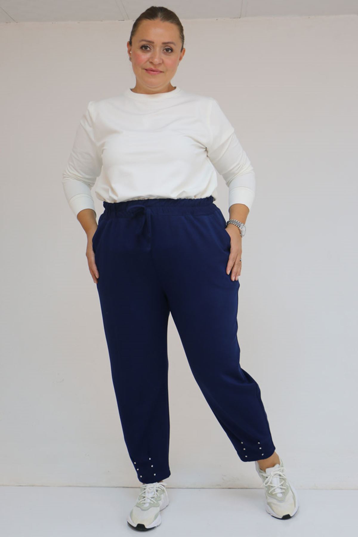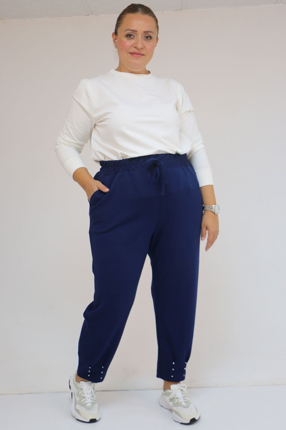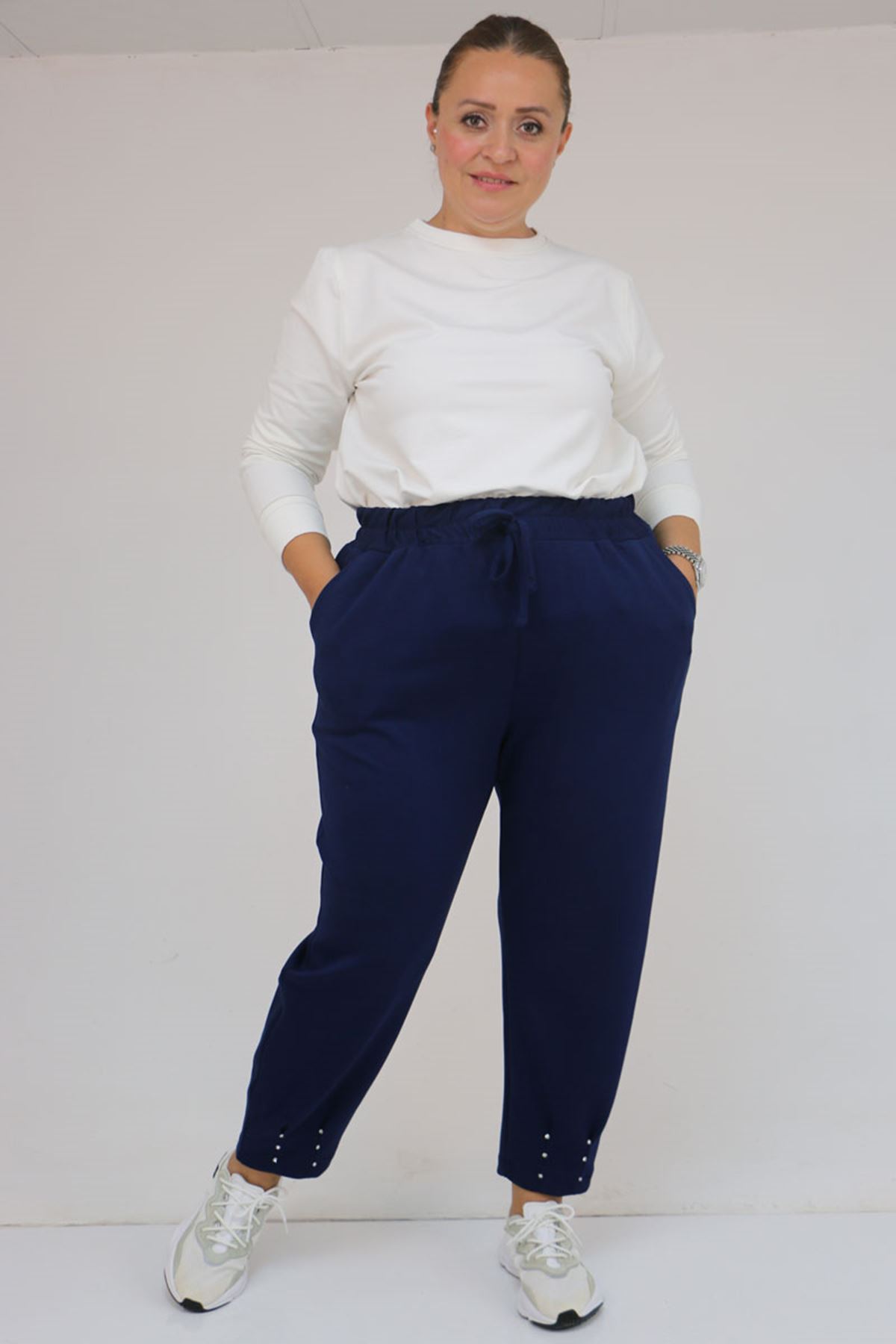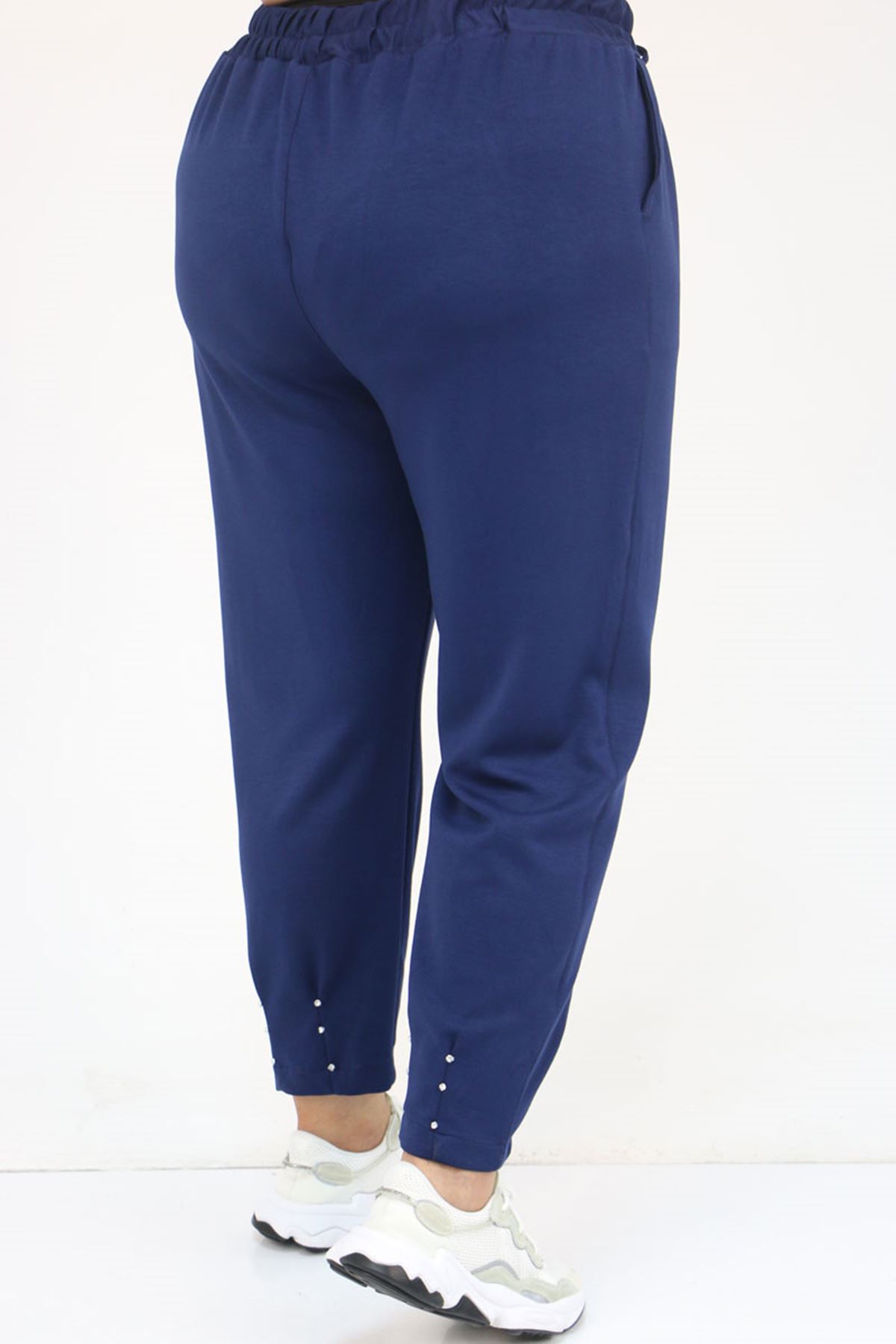 59027 Büyük Beden Paçasında İnci Çakma Modal Pantolon - İndigo