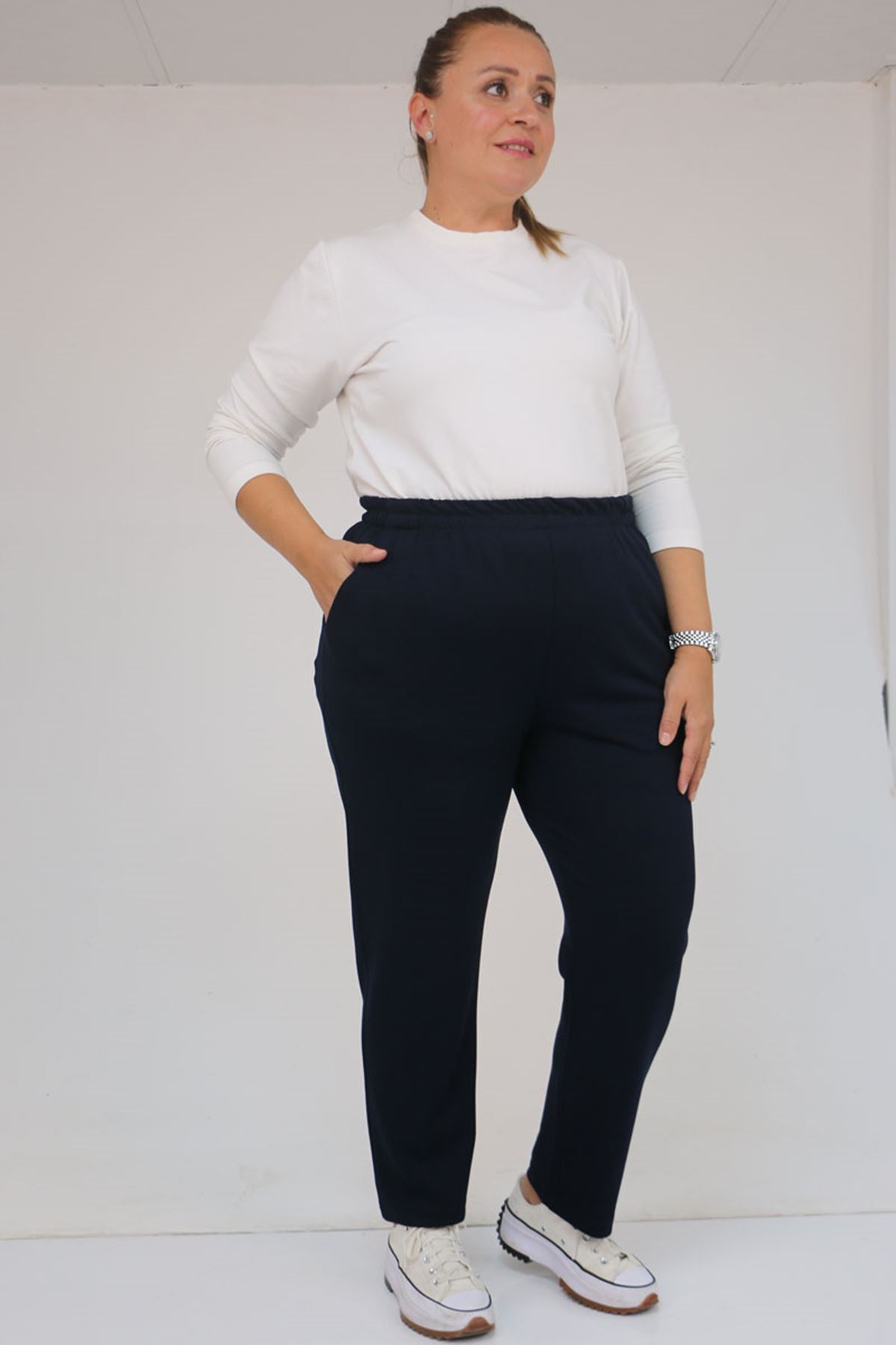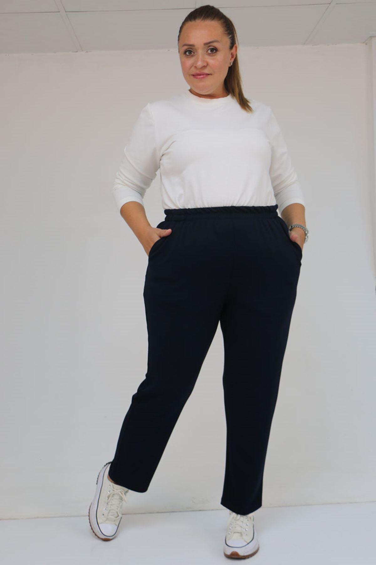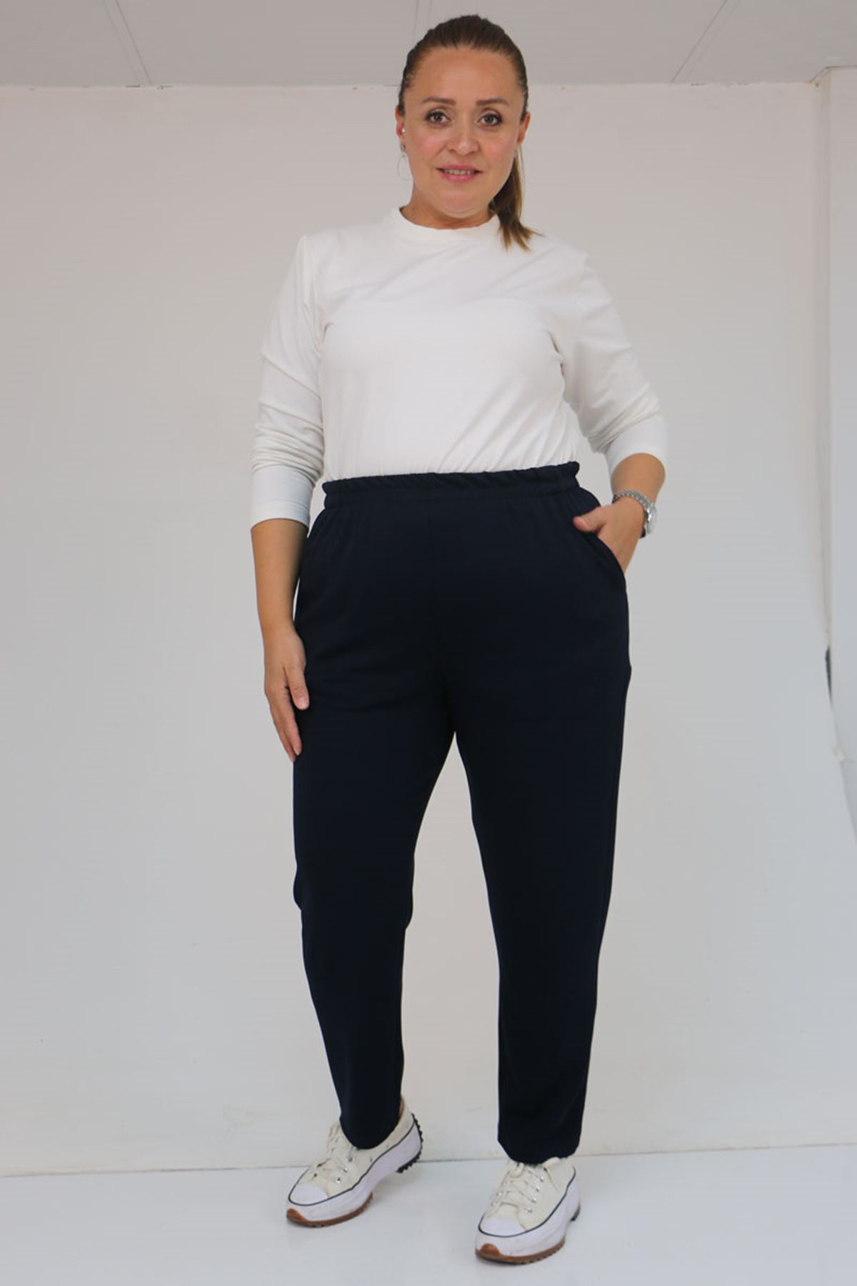59029 Büyük Beden Beli Lastikli Boru Paça Modal Pantolon - Lacivert