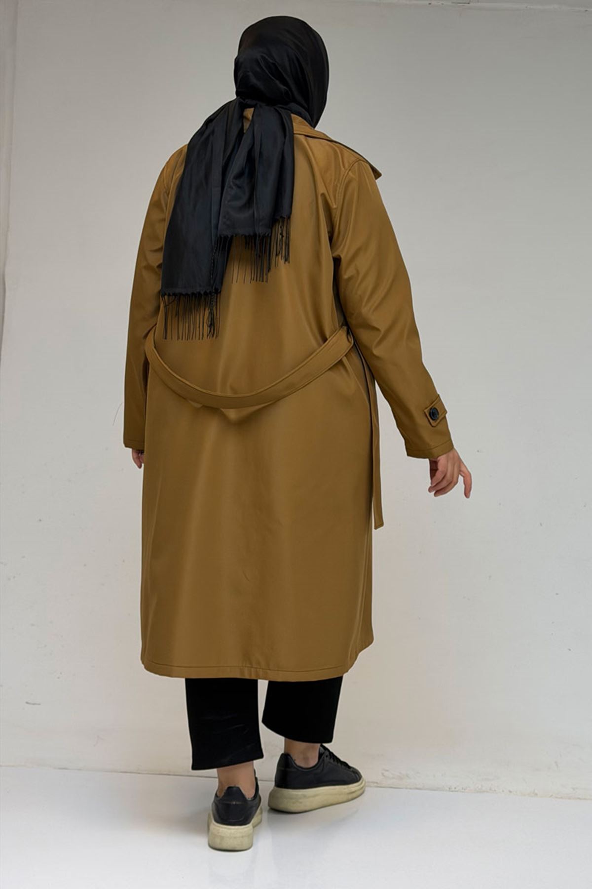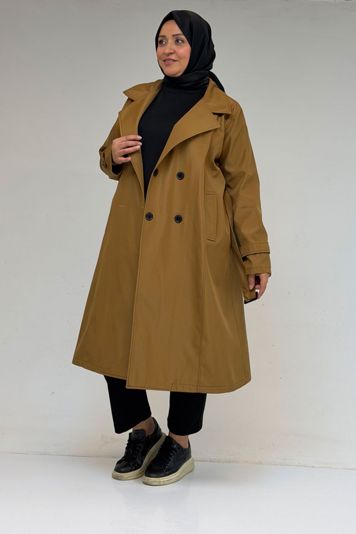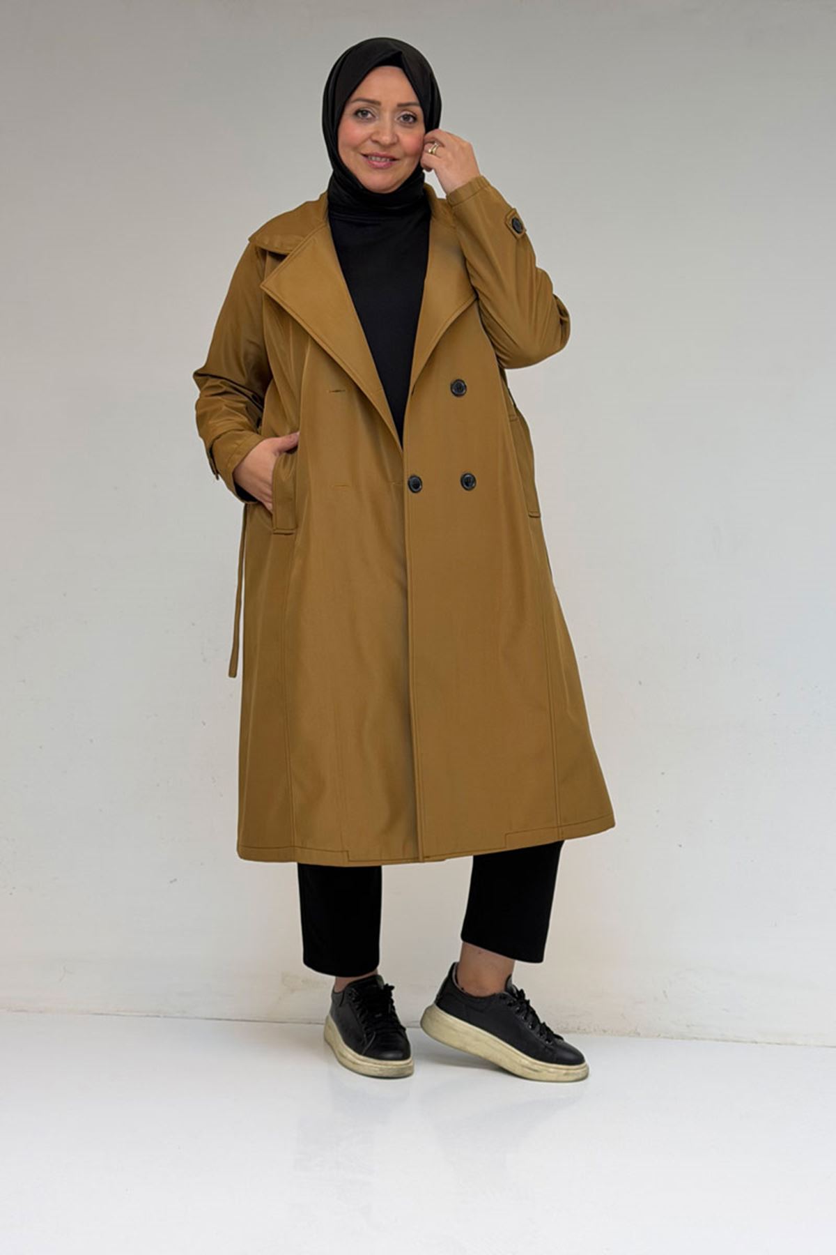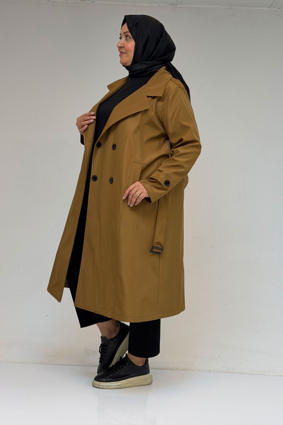 33094 Büyük Beden Bondit Kemerli Trençkot - Açık Taba