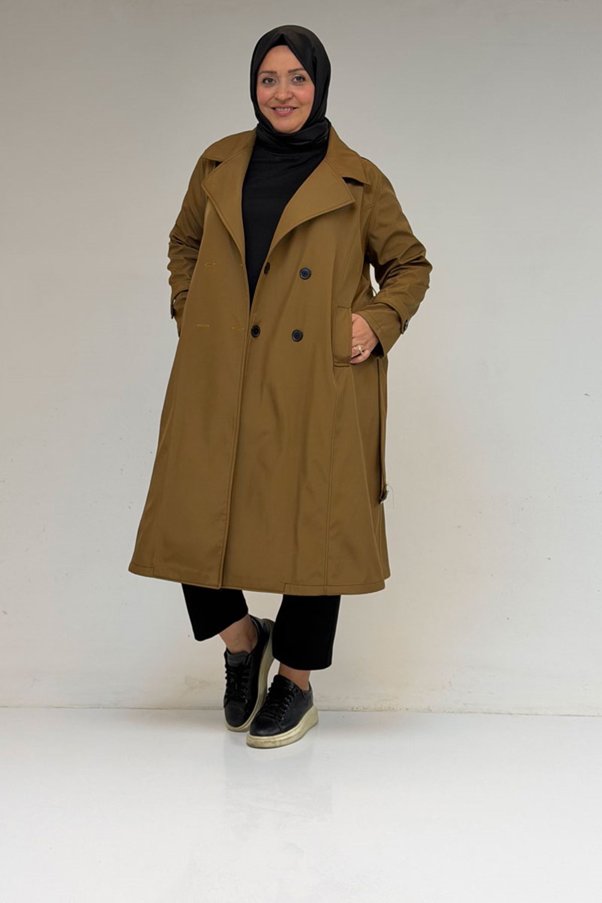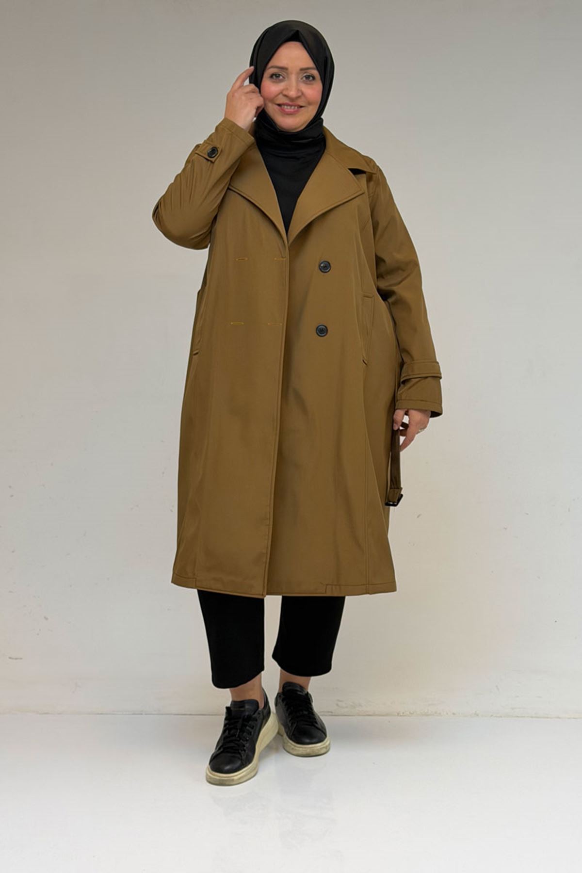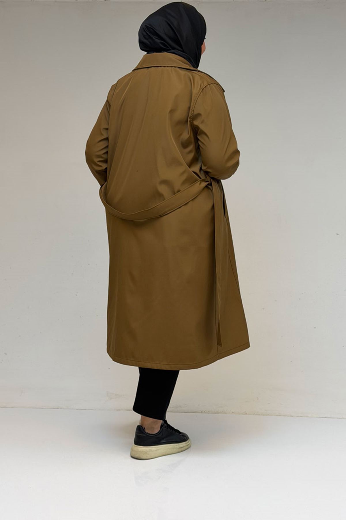 33094 Büyük Beden Bondit Kemerli Trençkot - Taba