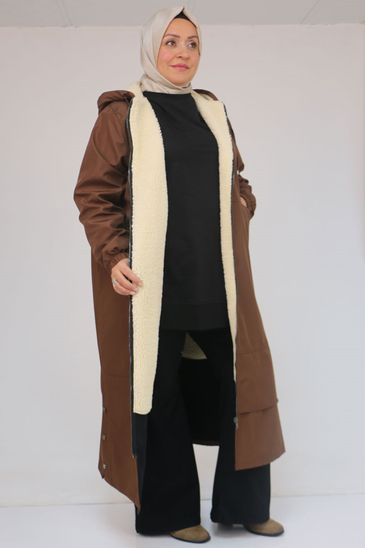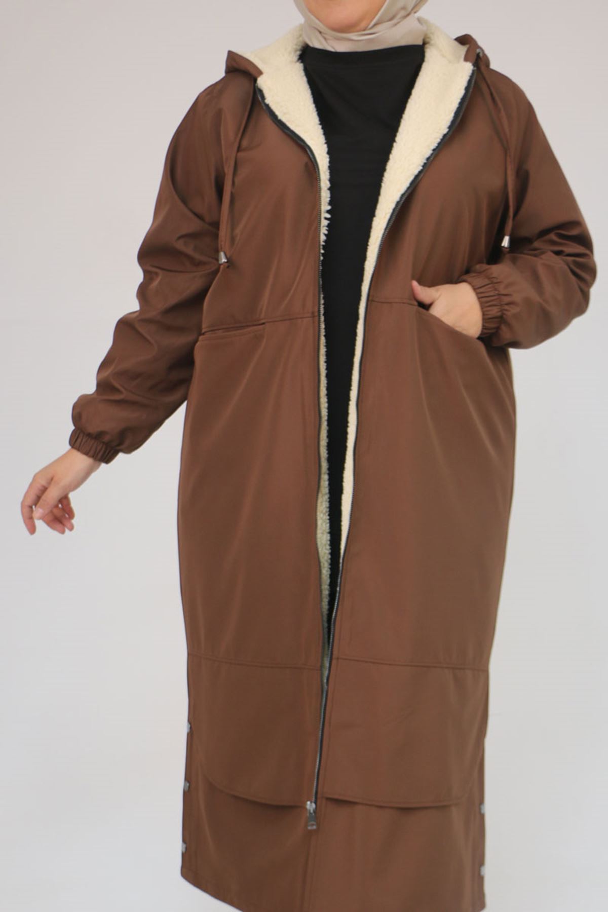 43062 Büyük Beden Kolları Lastikli Kapşonlu Bondit Kap - Kahve