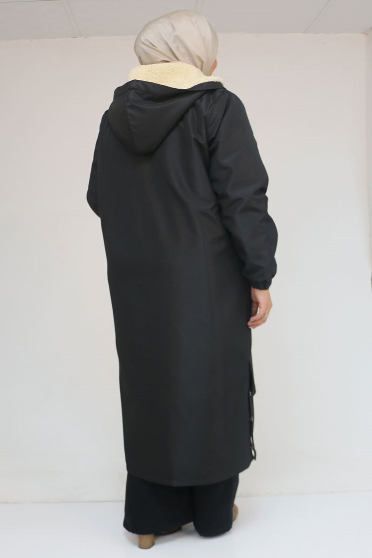 43062 Büyük Beden Kolları Lastikli Kapşonlu Bondit Kap - Siyah