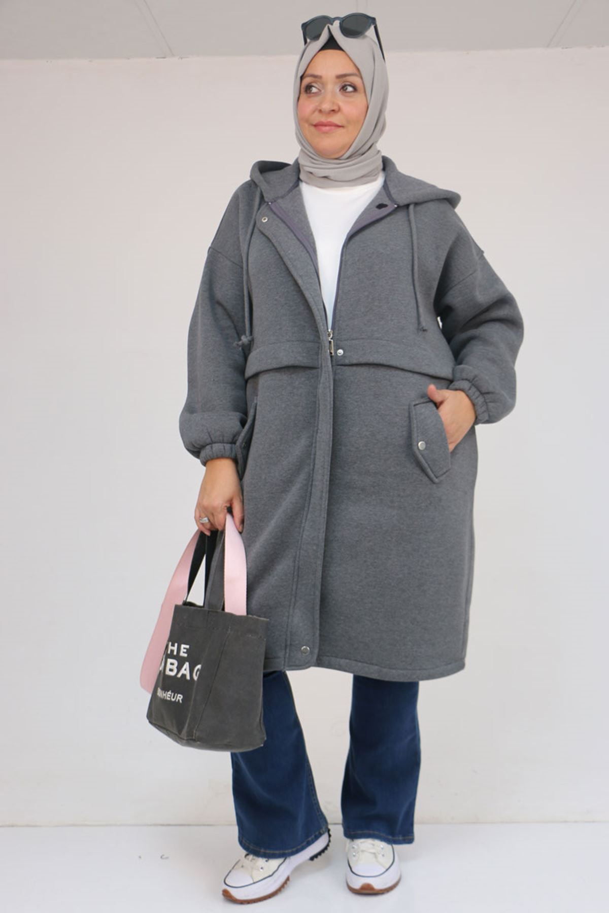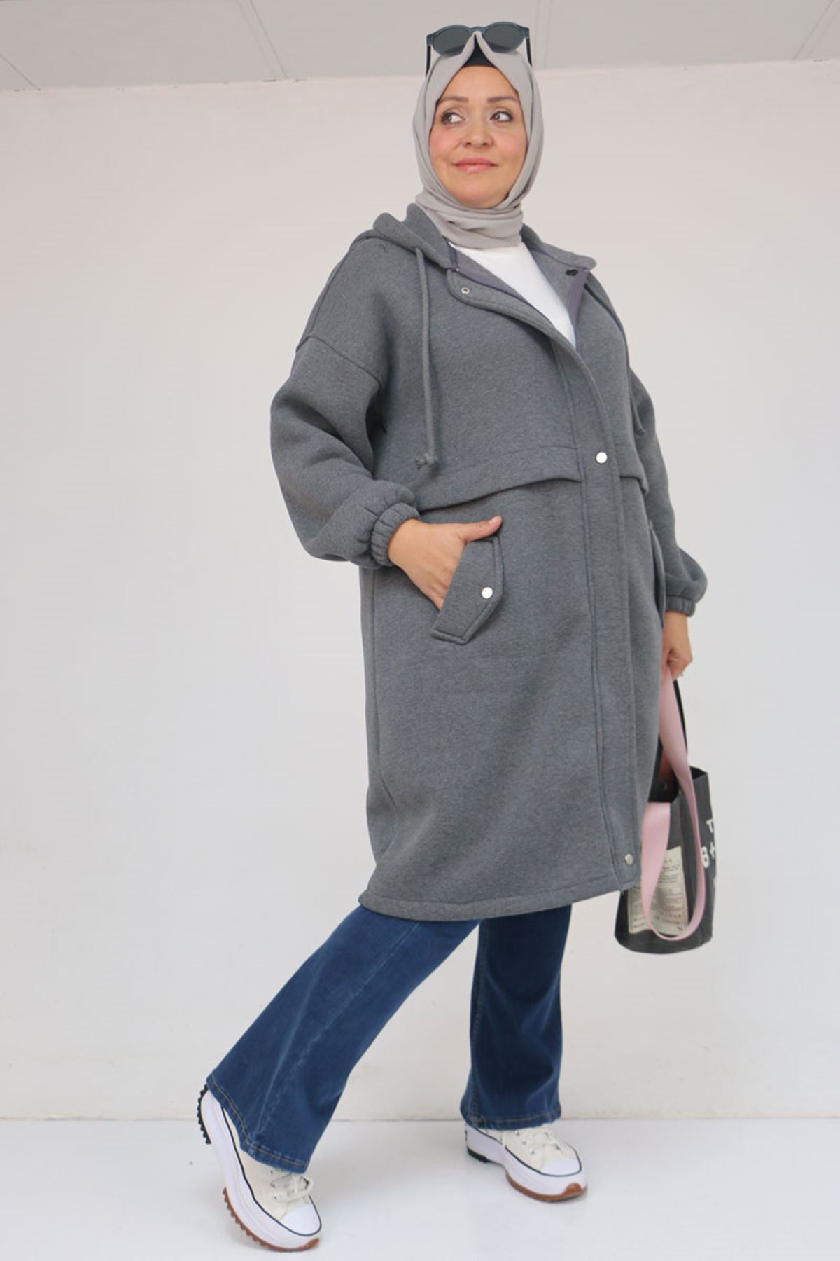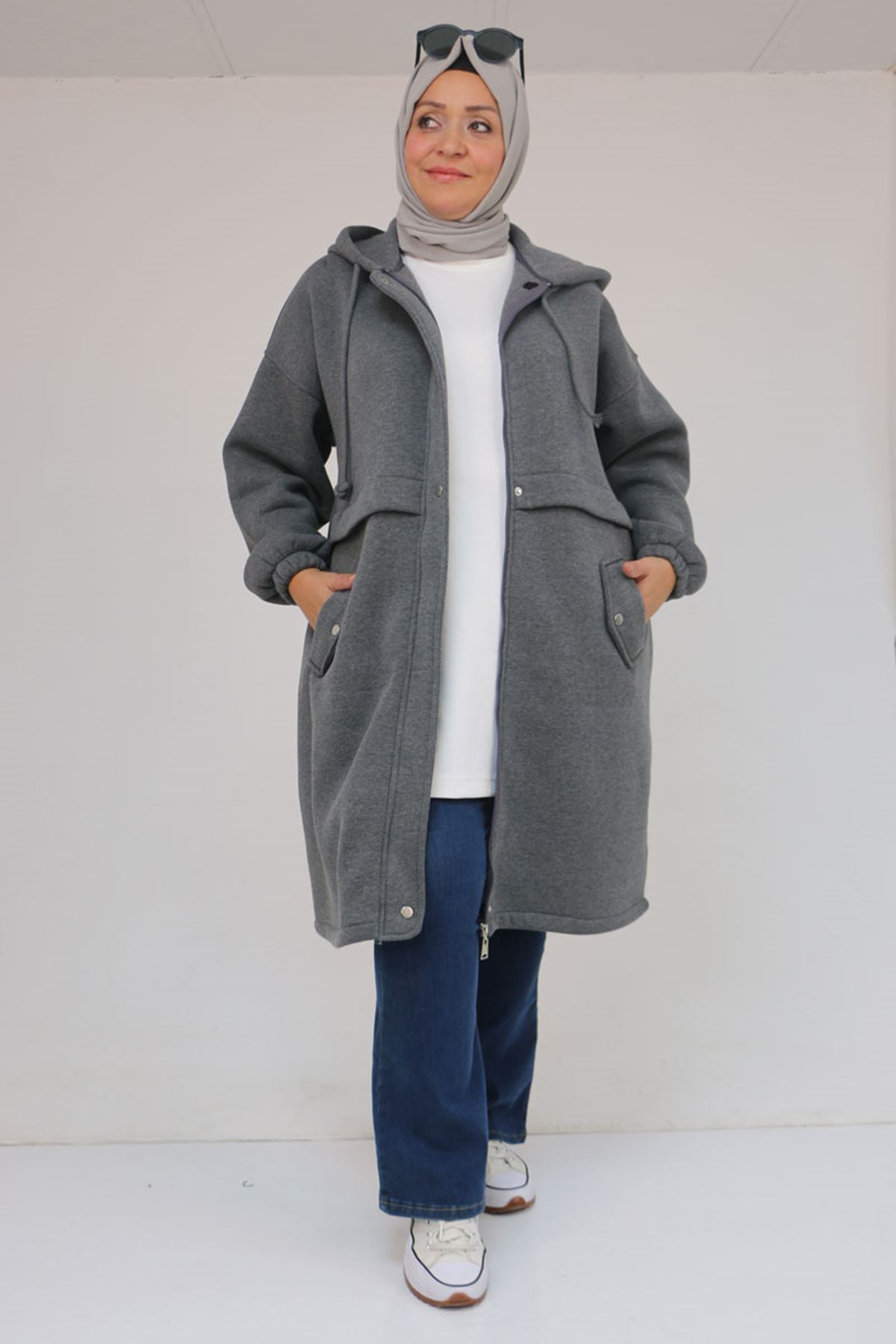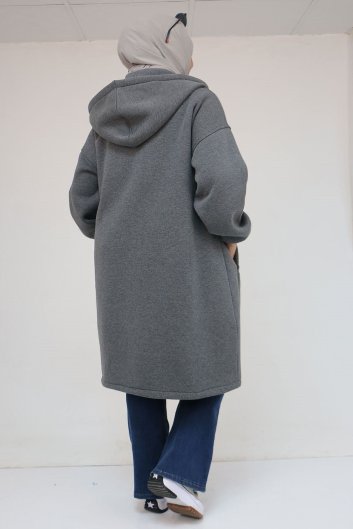 43076 Büyük Beden Cepli Kapşonlu Üç İplik Kap - Antrasit