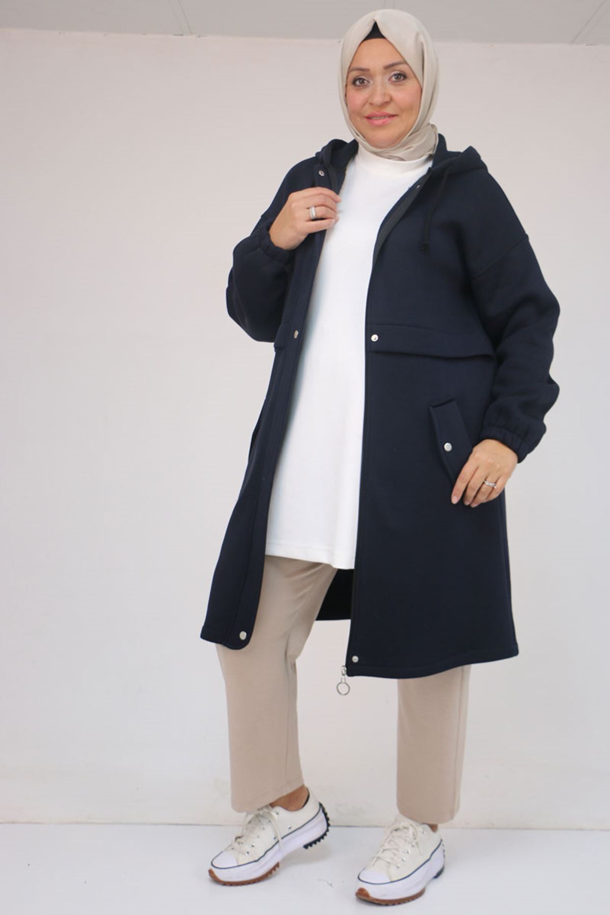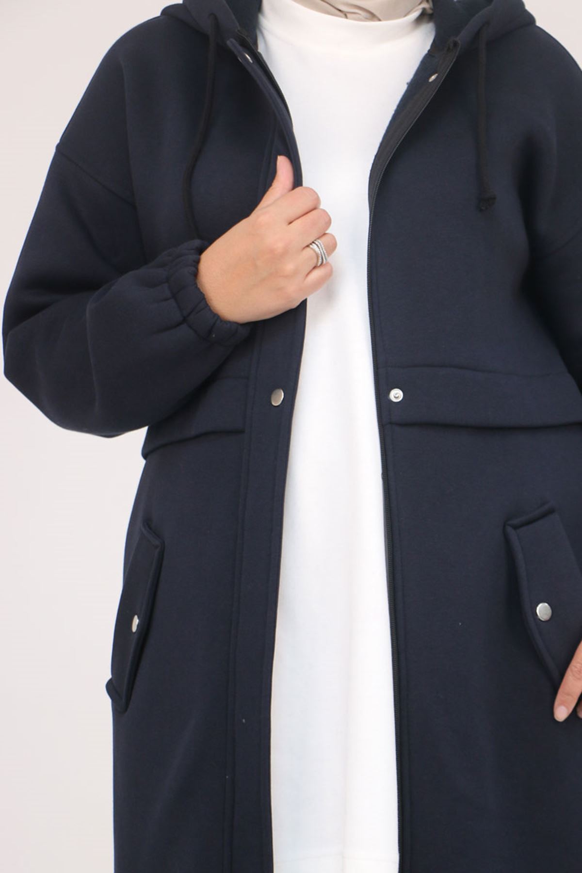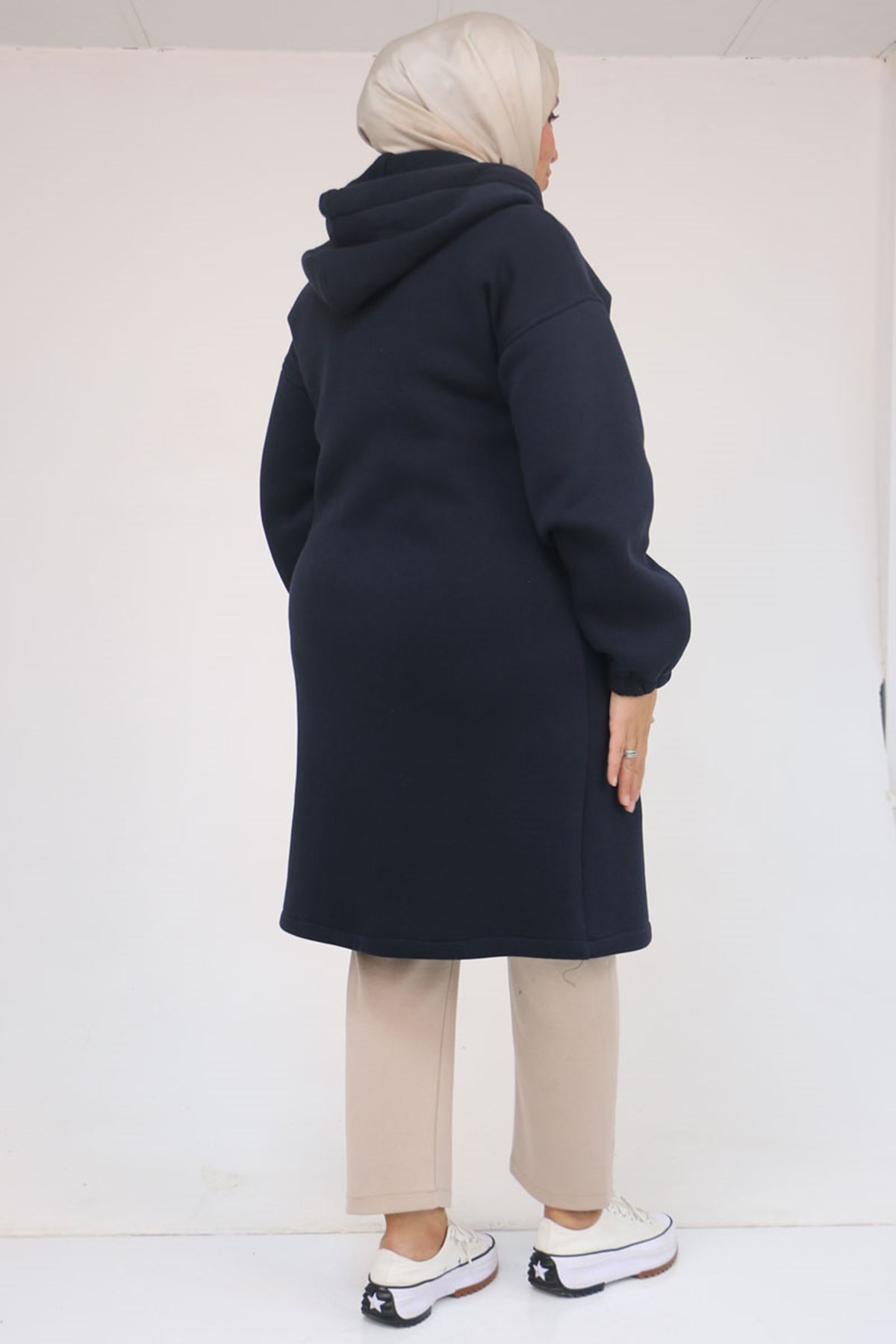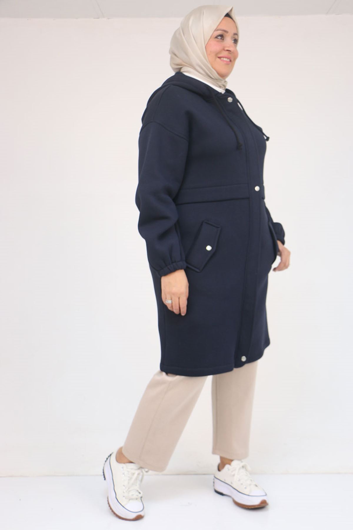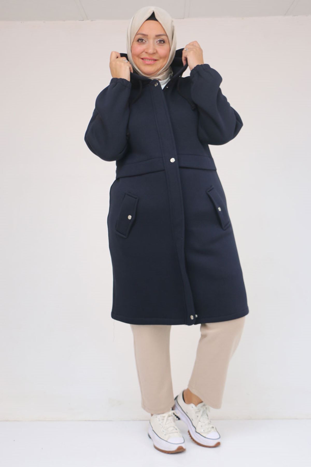 43076 Büyük Beden Cepli Kapşonlu Üç İplik Kap - Lacivert