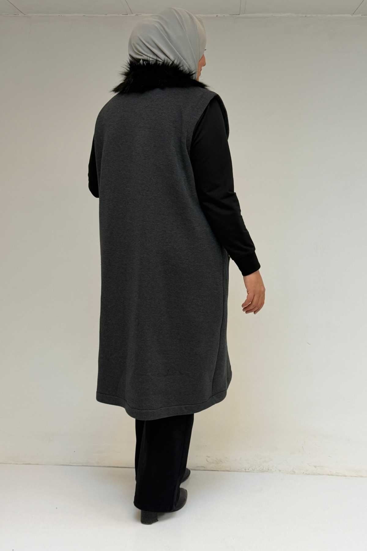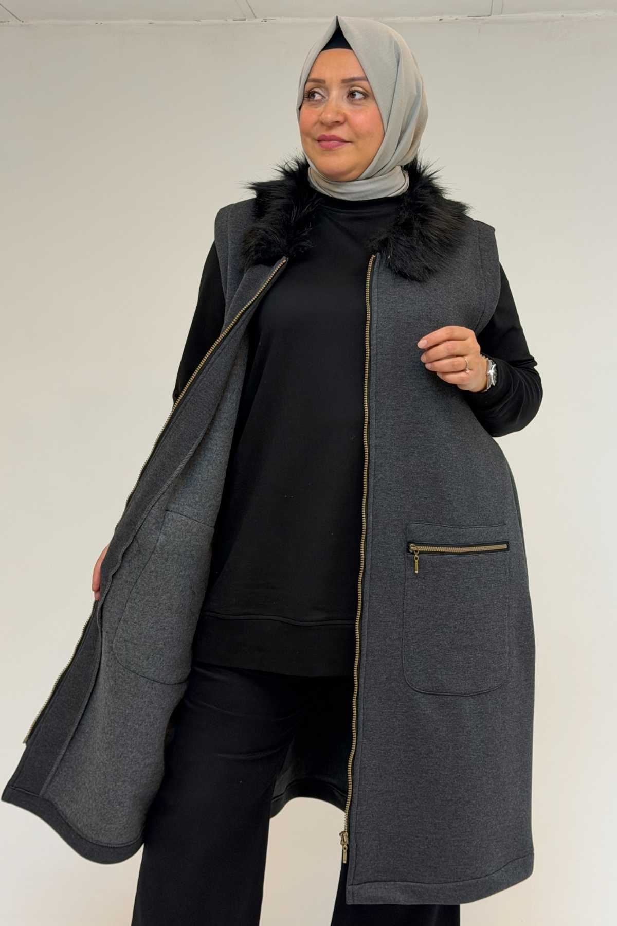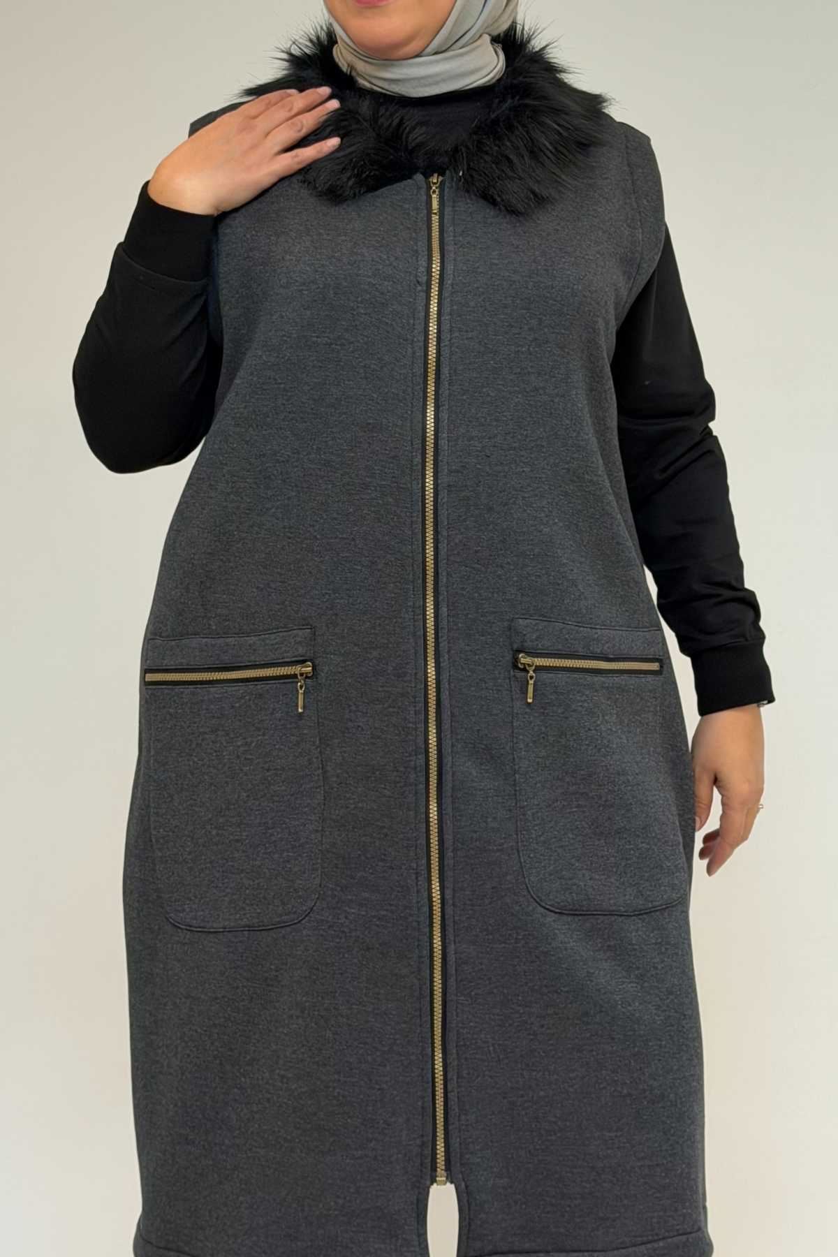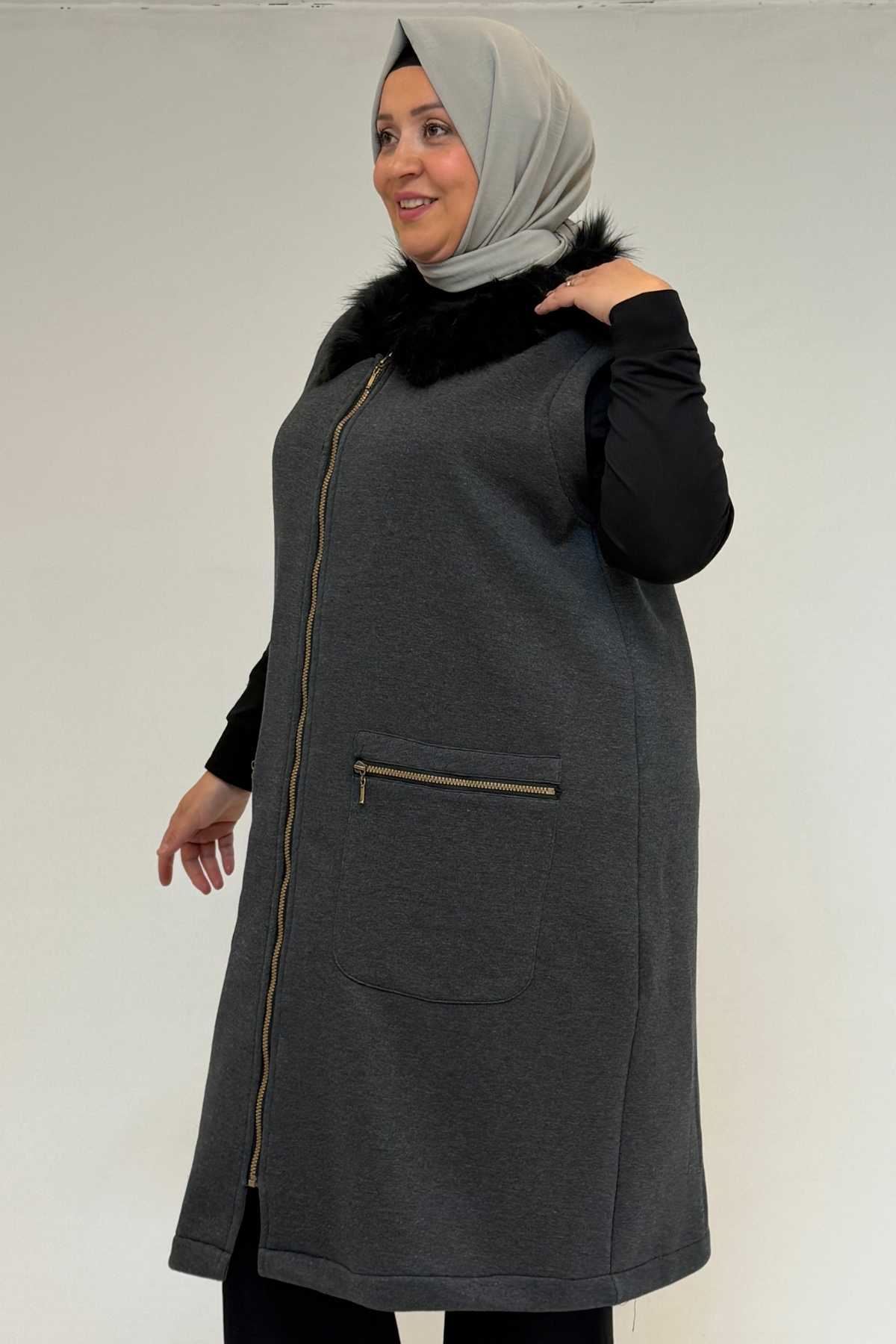 44006 Büyük Beden Cepleri Fermuarlı Üç İplik Yelek - Antrasit