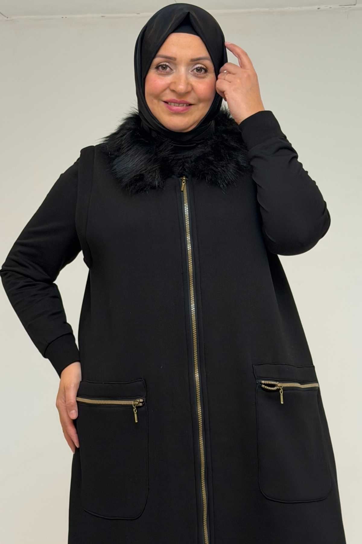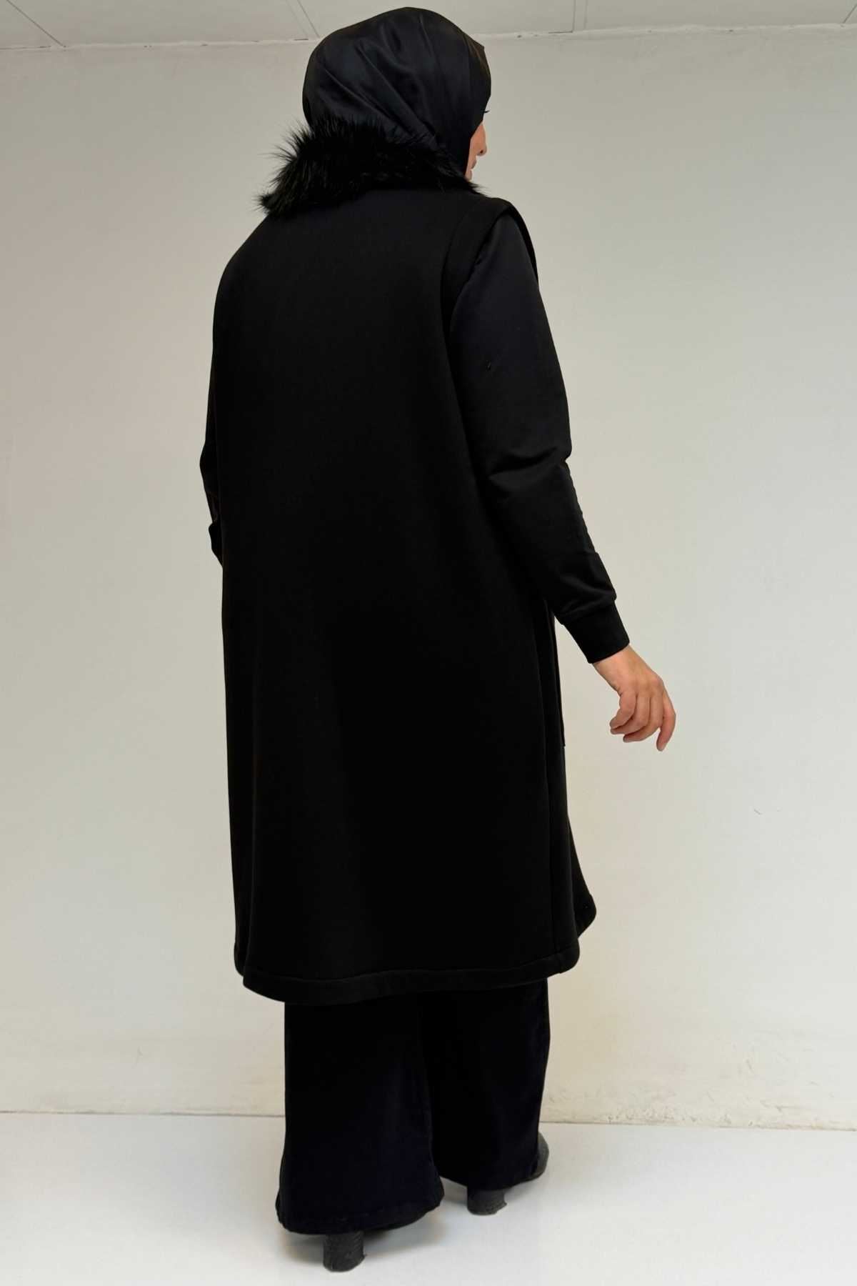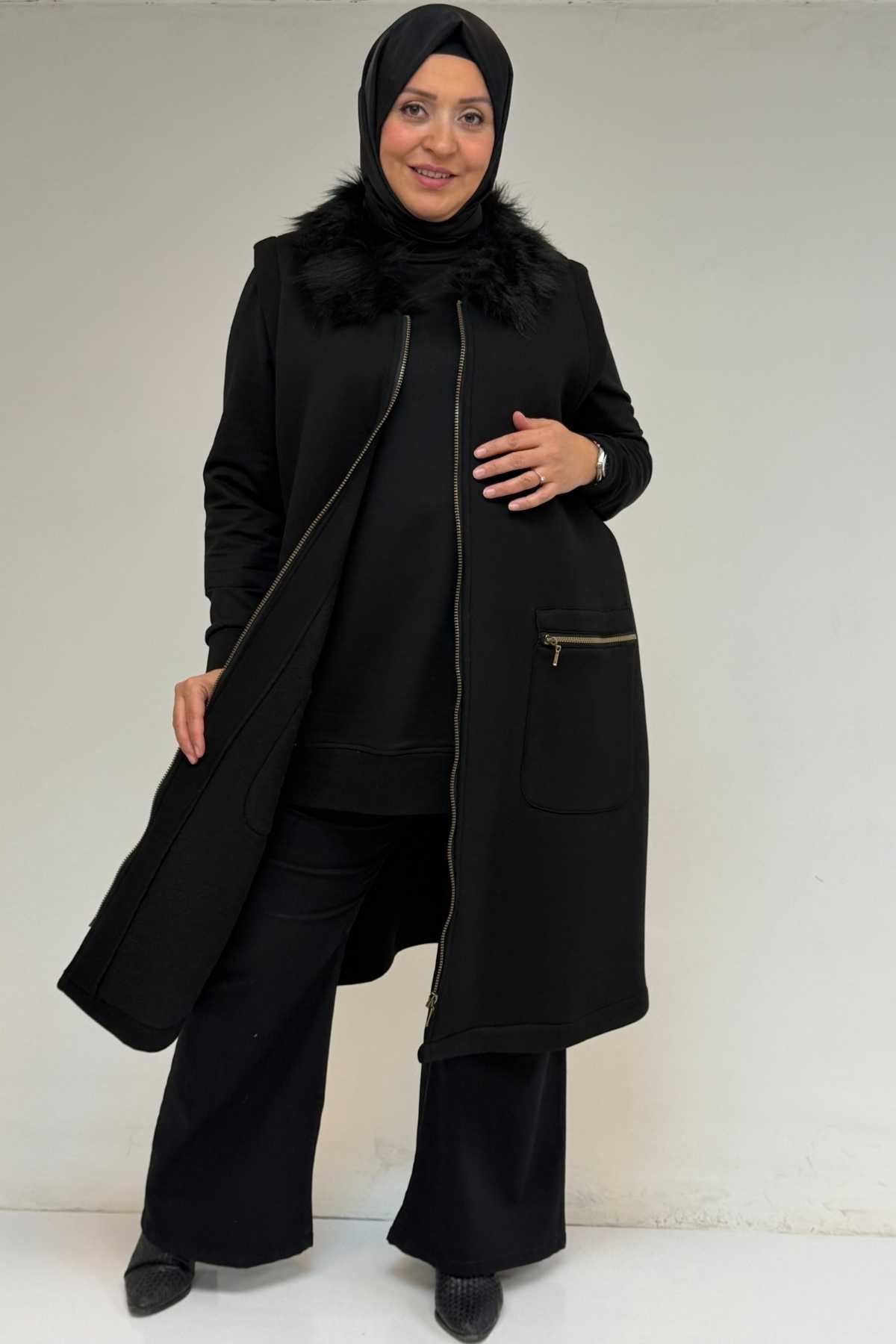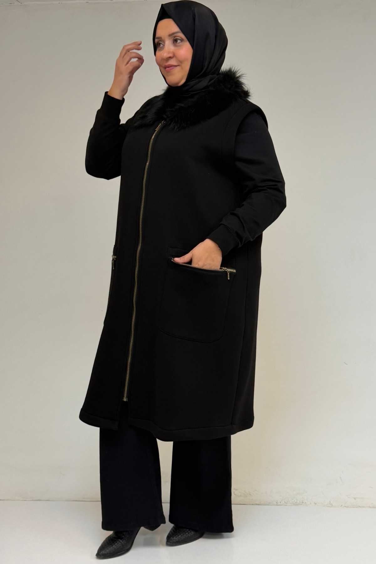 44006 Büyük Beden Cepleri Fermuarlı Üç İplik Yelek - Siyah