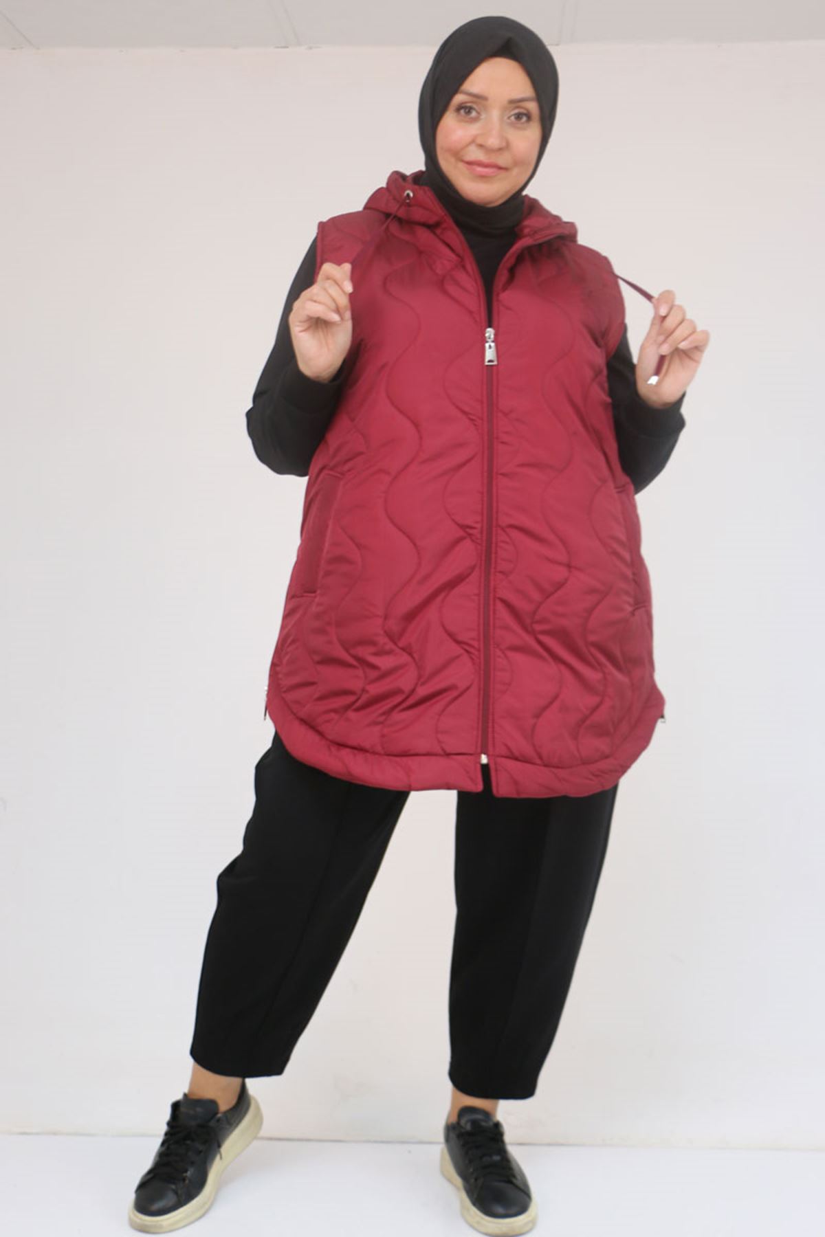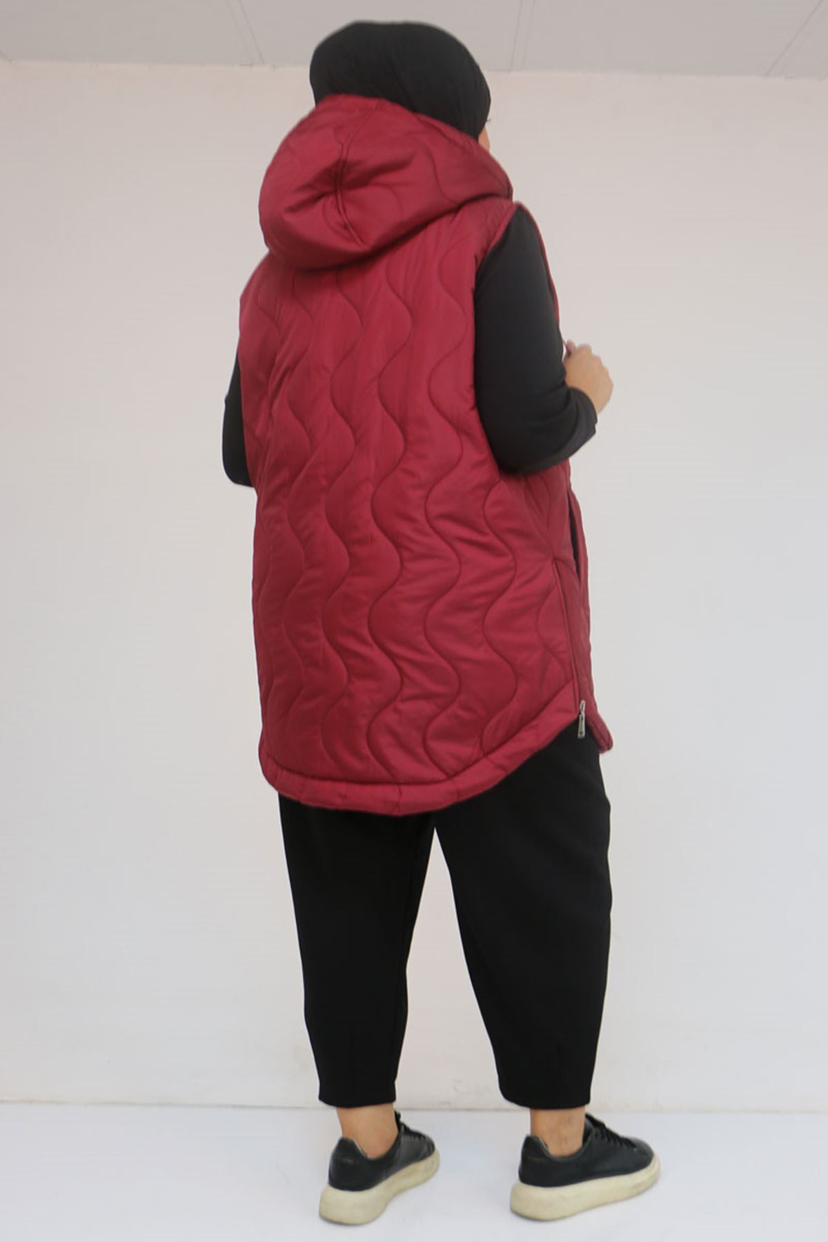 44007 Büyük Beden Yanı Yırtaçlı Oval Kesim Kapitone Yelek - Bordo