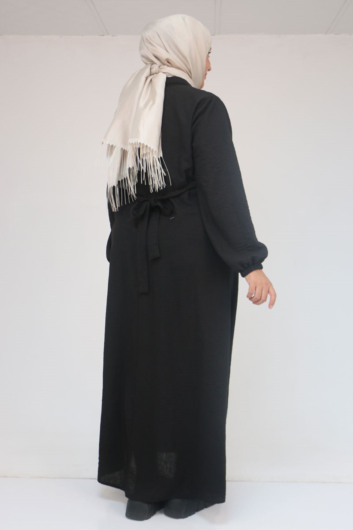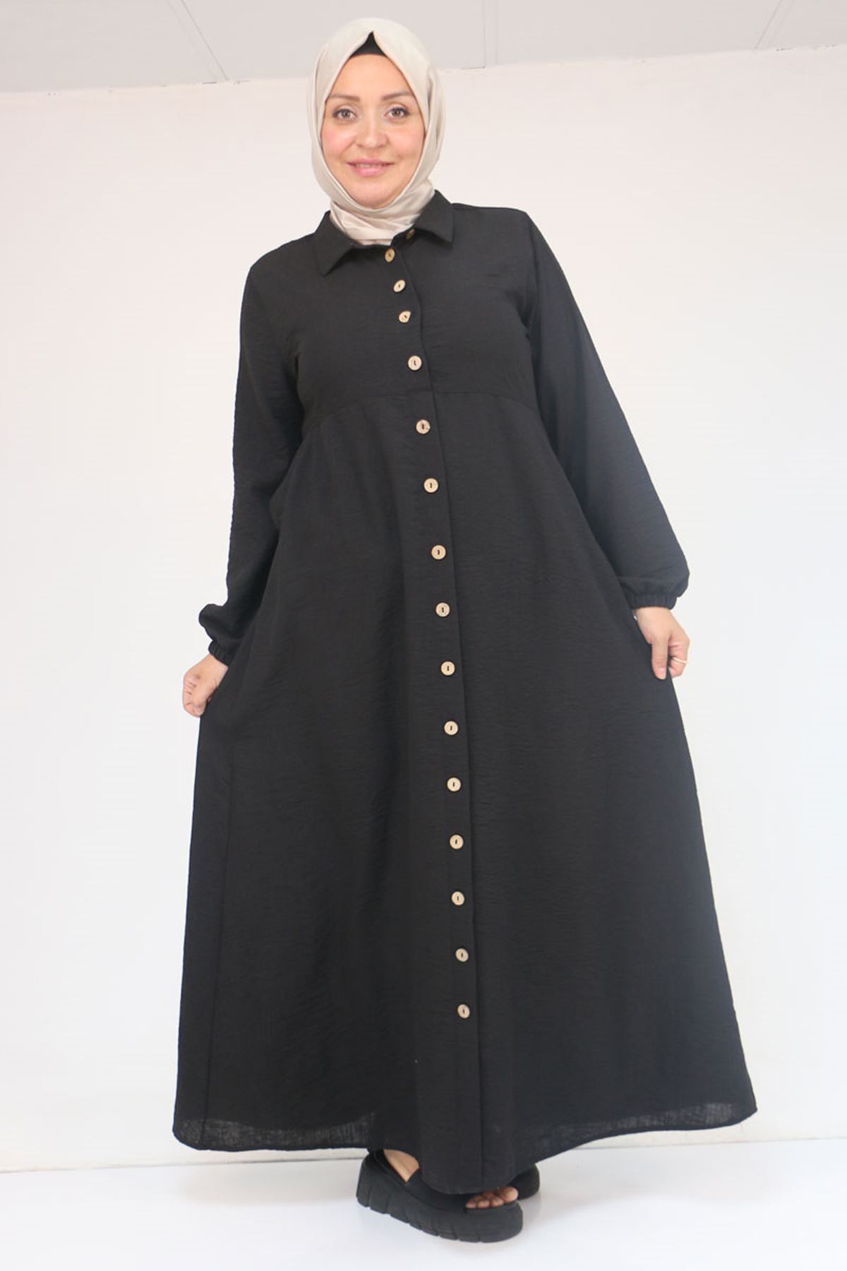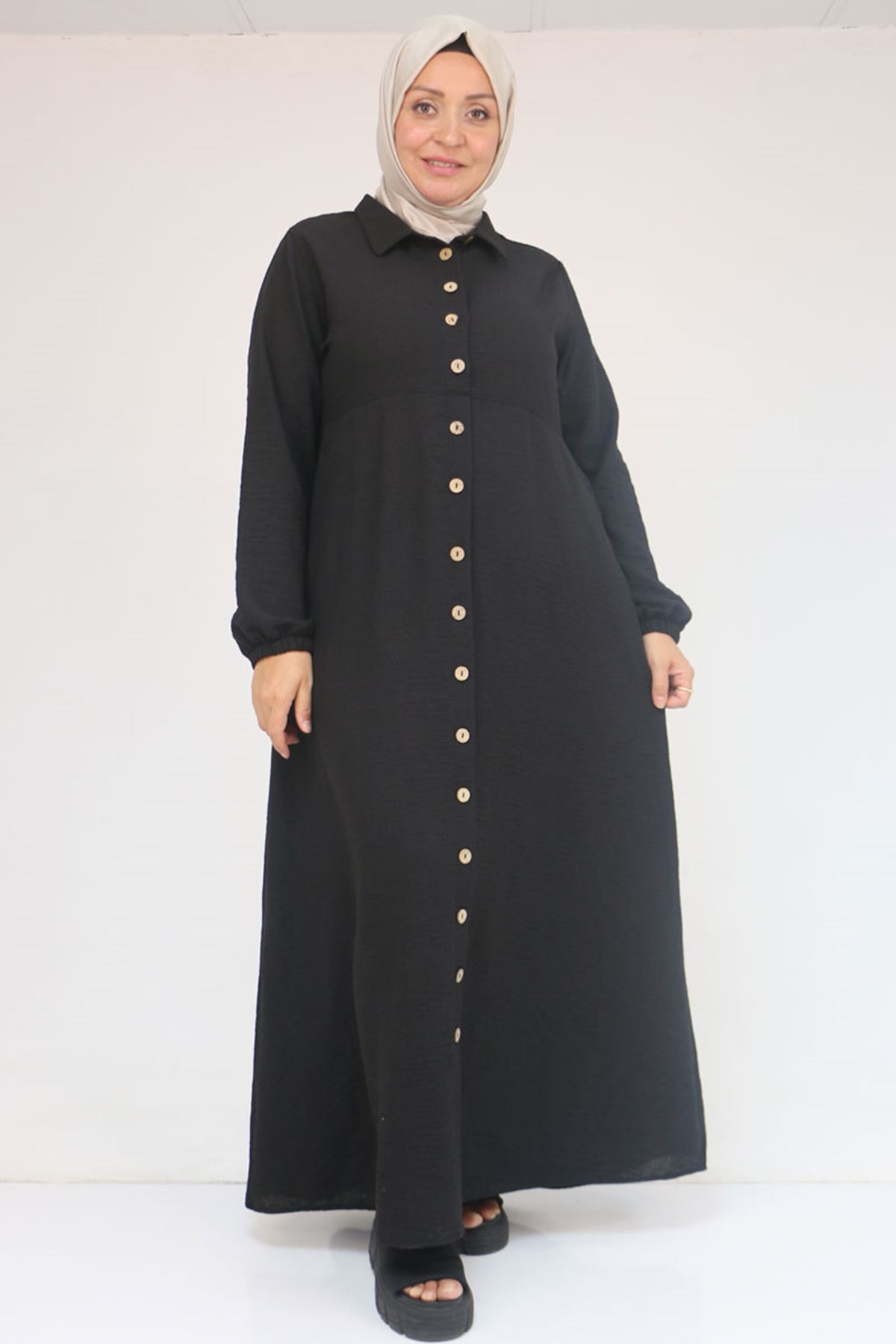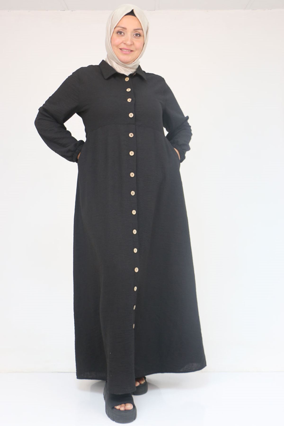 F-52024 Büyük Beden Desenli Keten Erkek Yakalı Elbise - Siyah