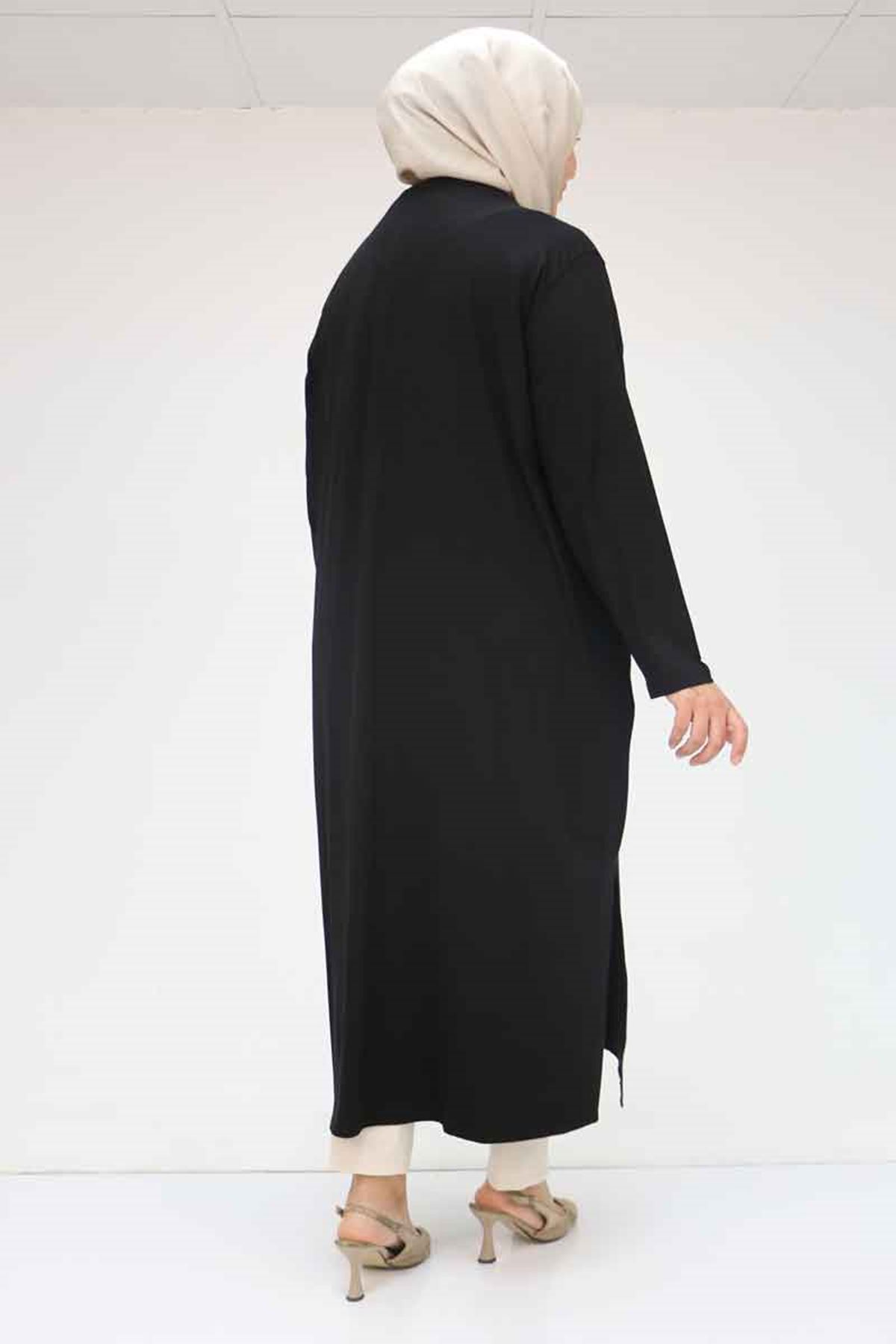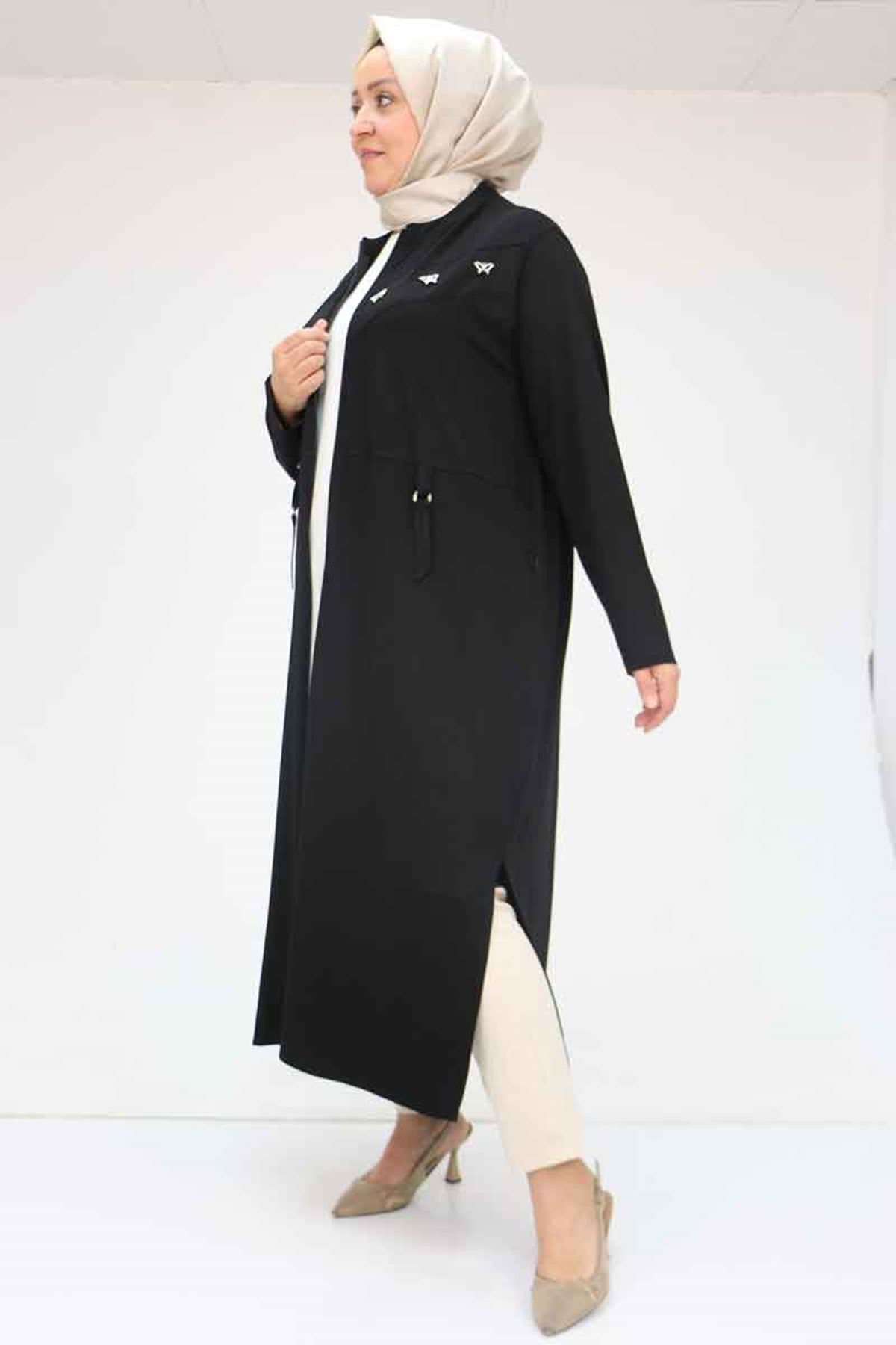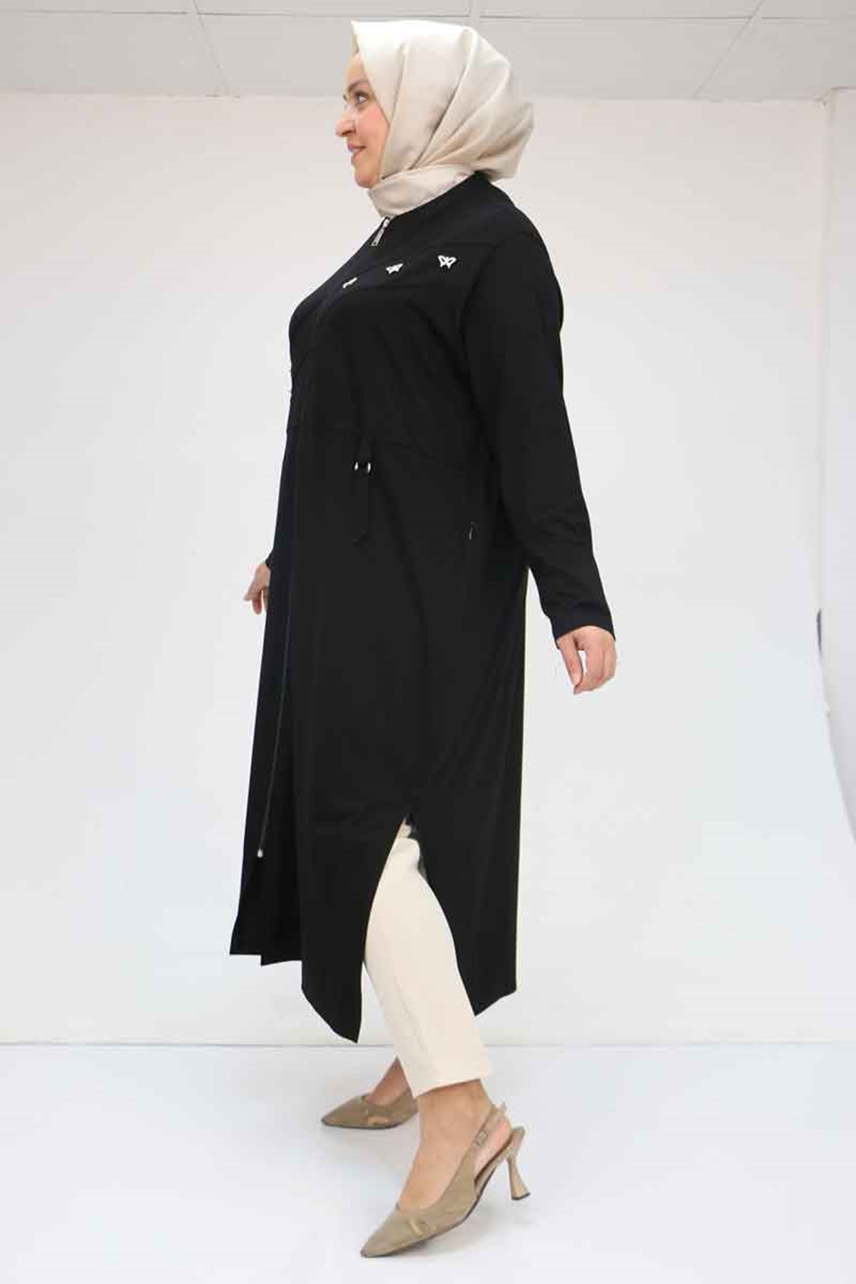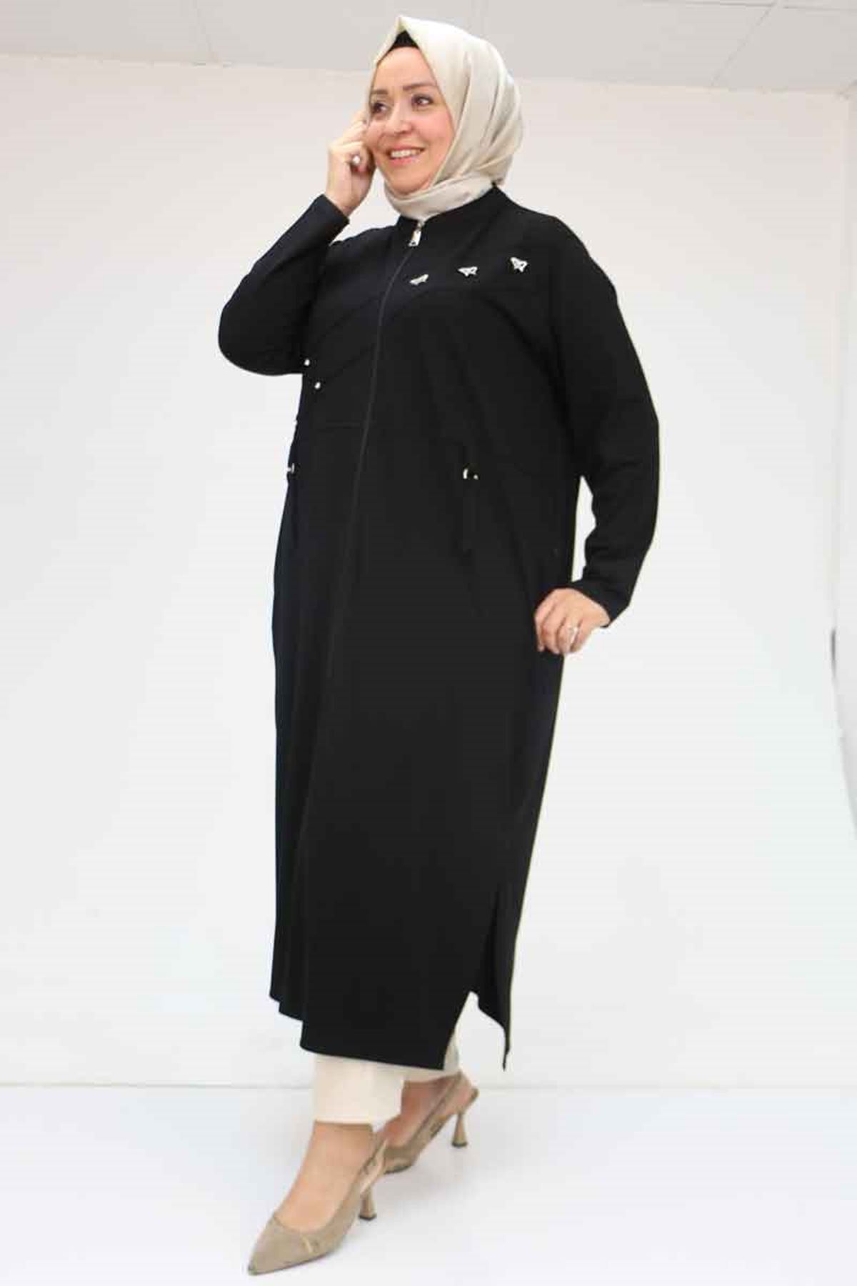 F-53012 Büyük Beden Beyoğlu Taş Detaylı Fermuarlı Penye Ceket - Siyah
