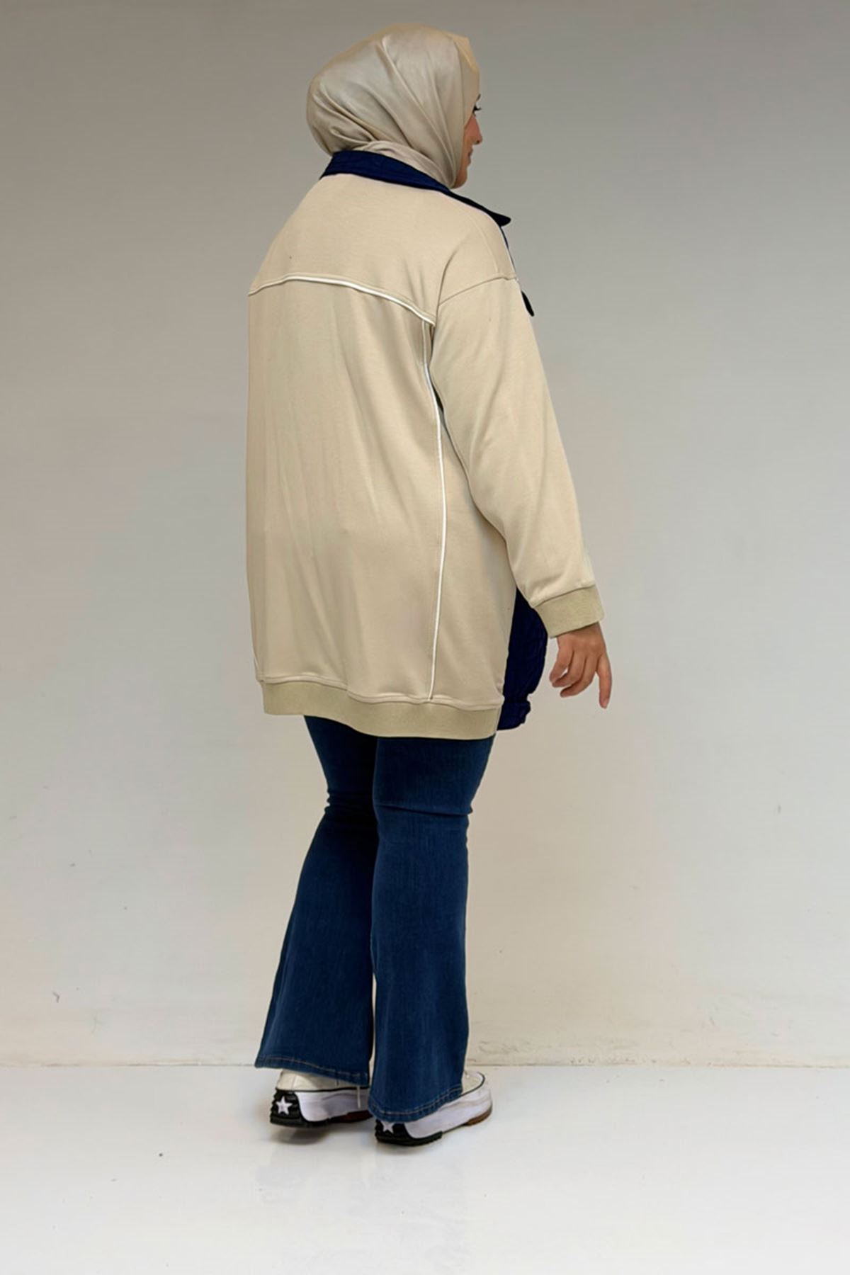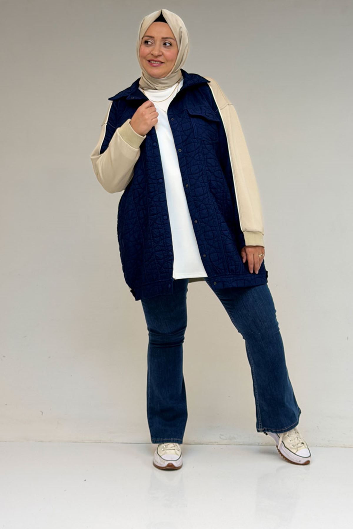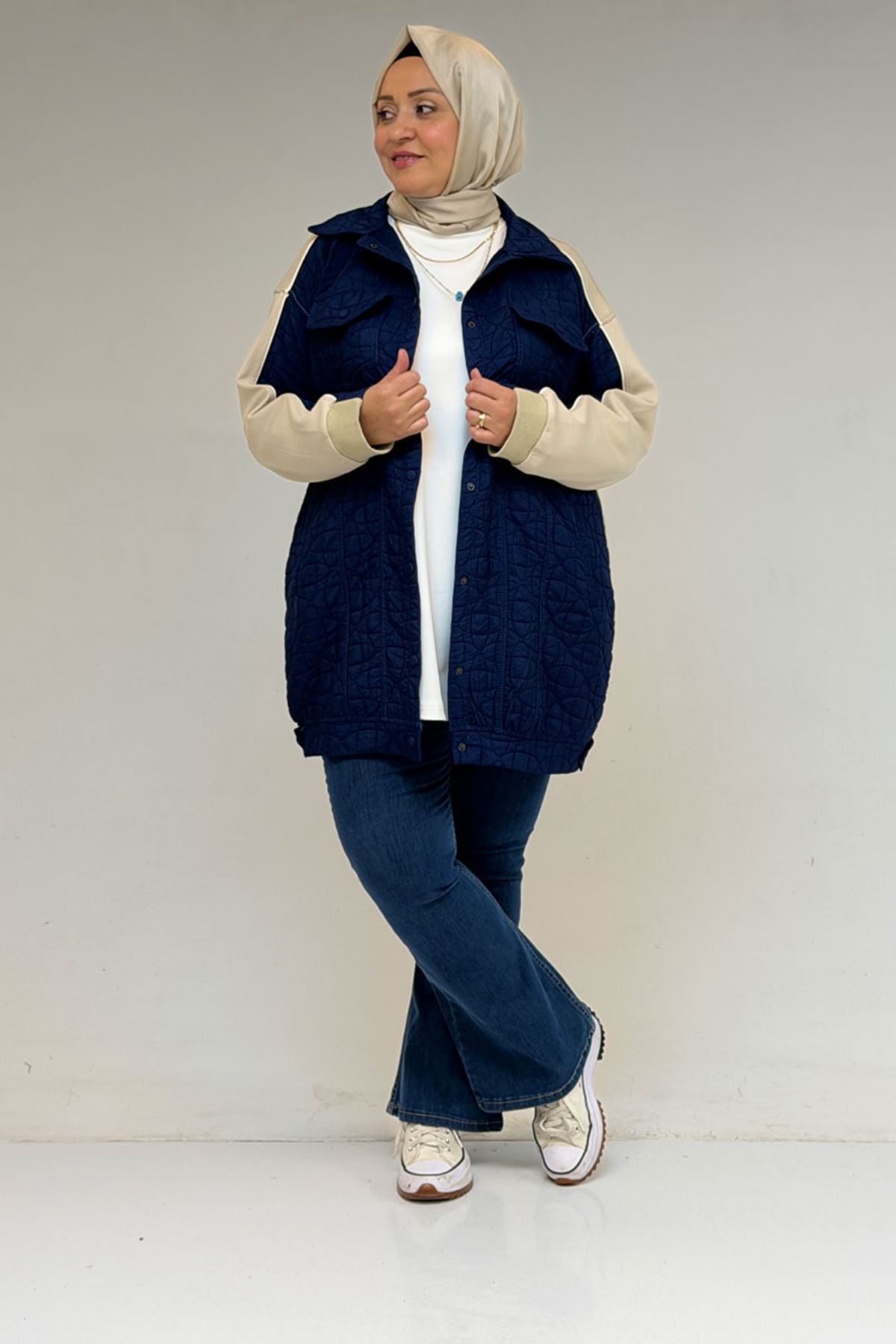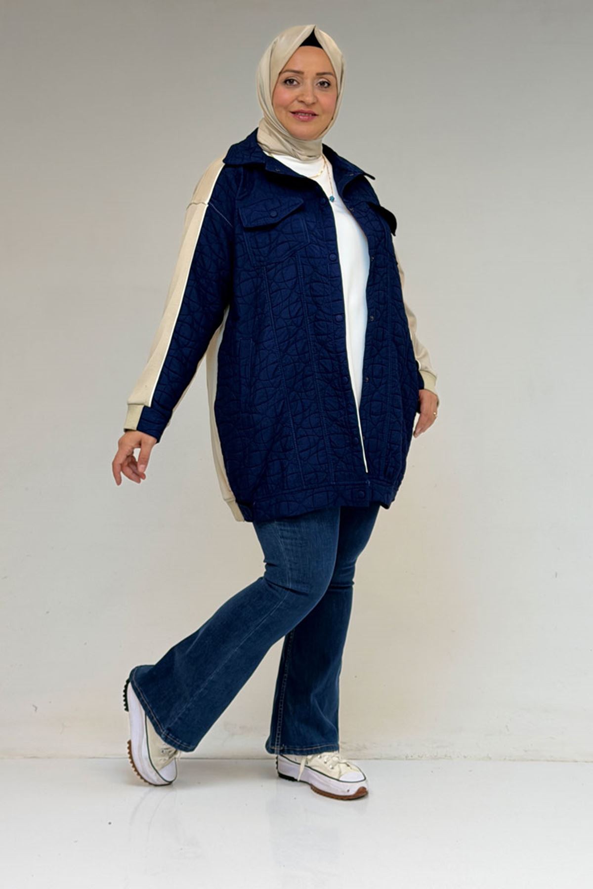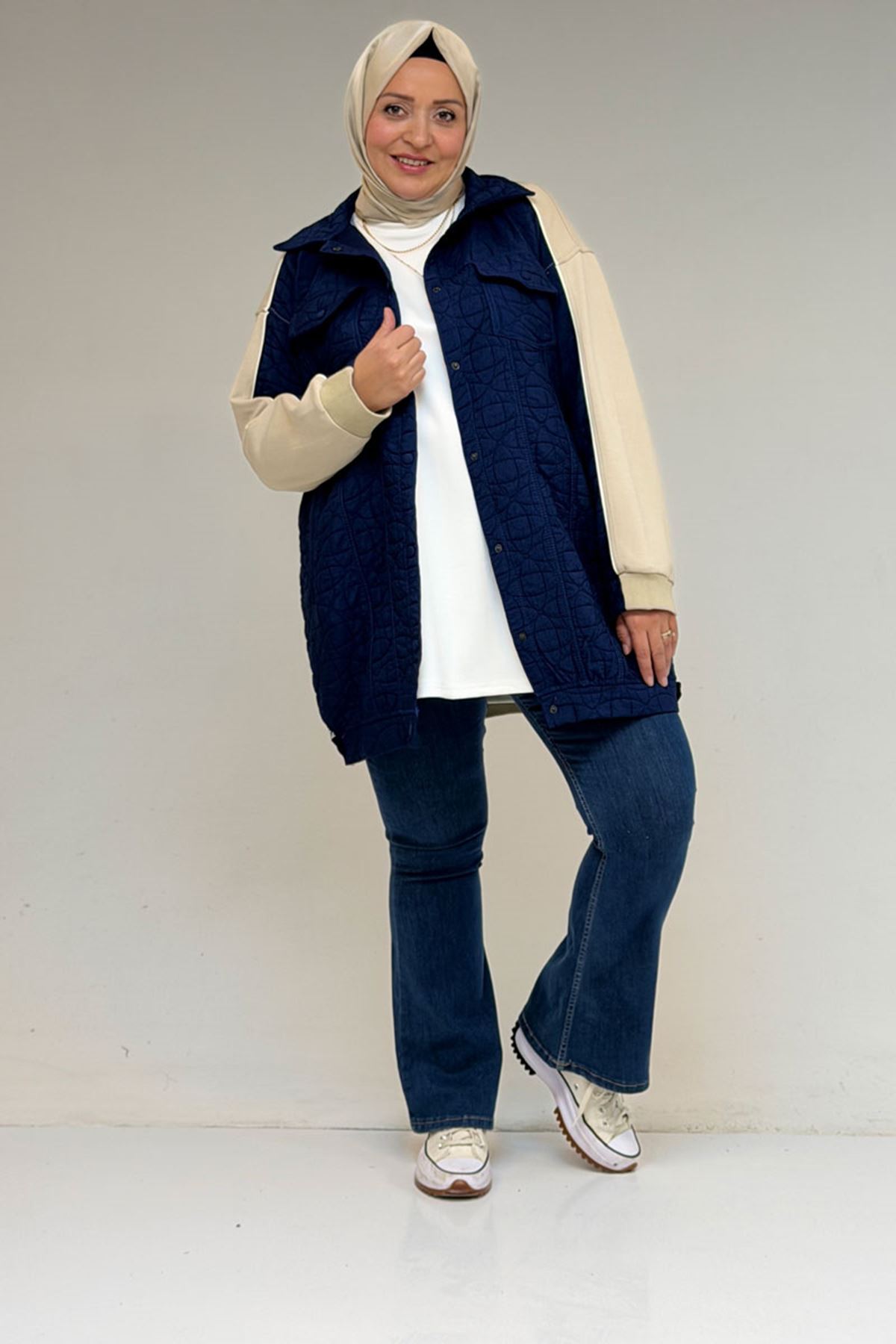 53029 Büyük Beden Biye Detaylı Kombinli Modal-Kapitone Ceket - İndigo-Bej