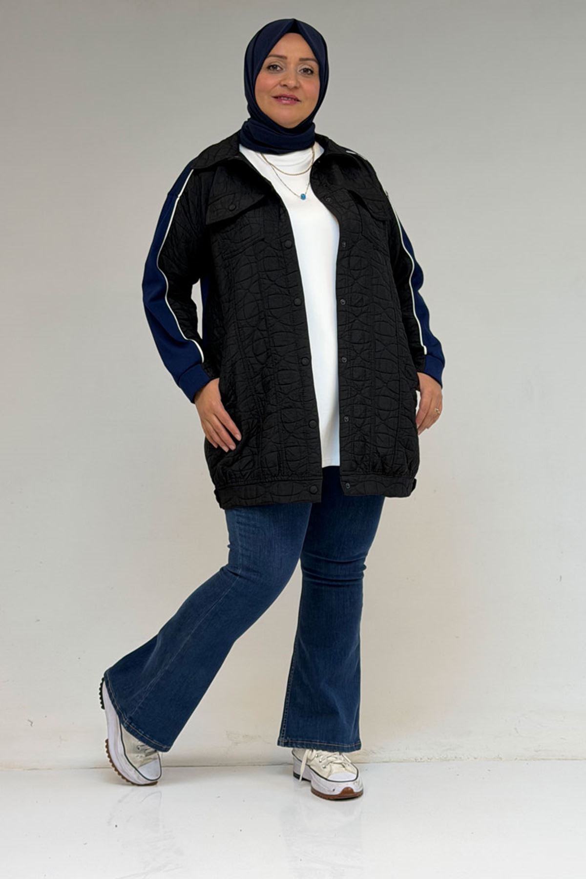 53029 Büyük Beden Biye Detaylı Kombinli Modal-Kapitone Ceket - Siyah-İndigo