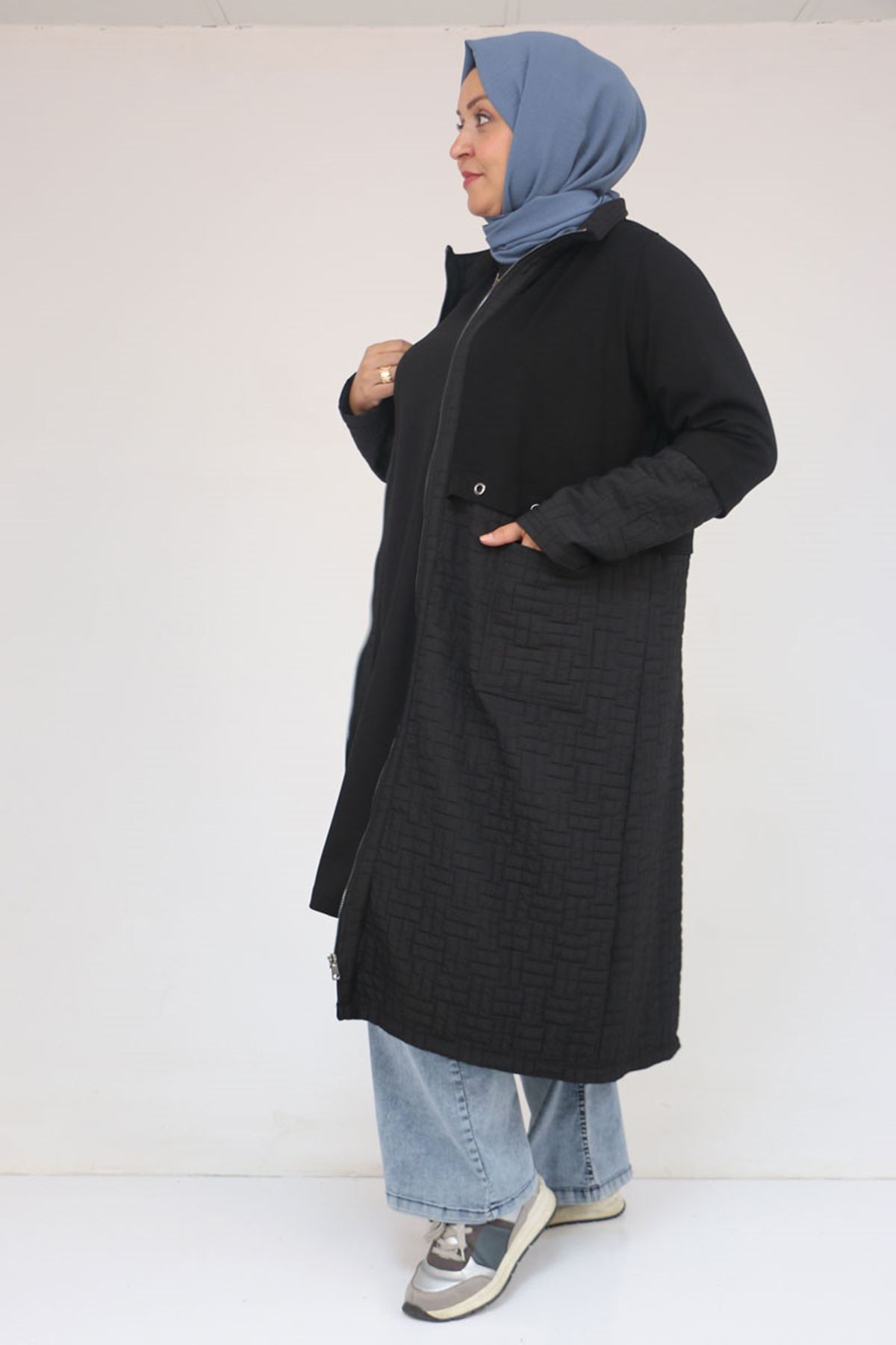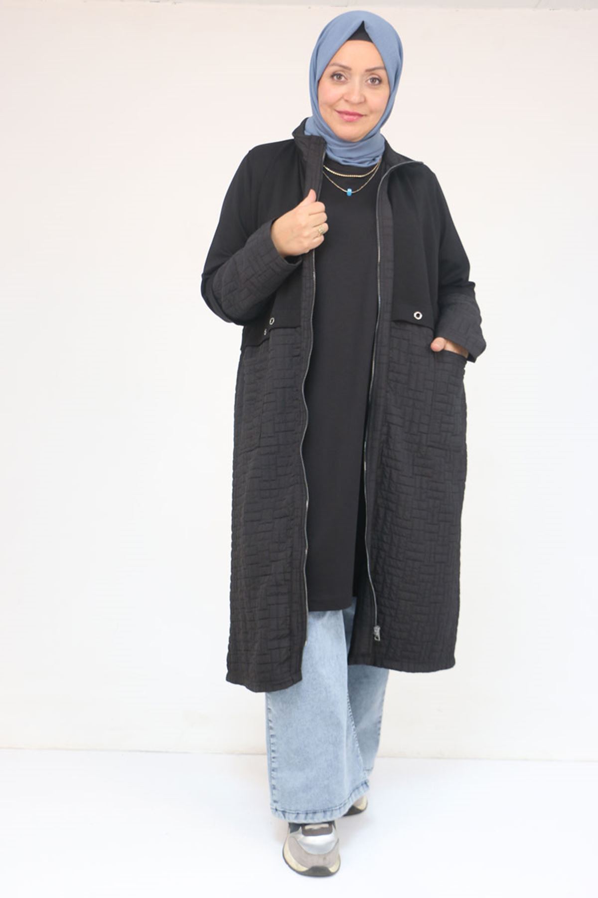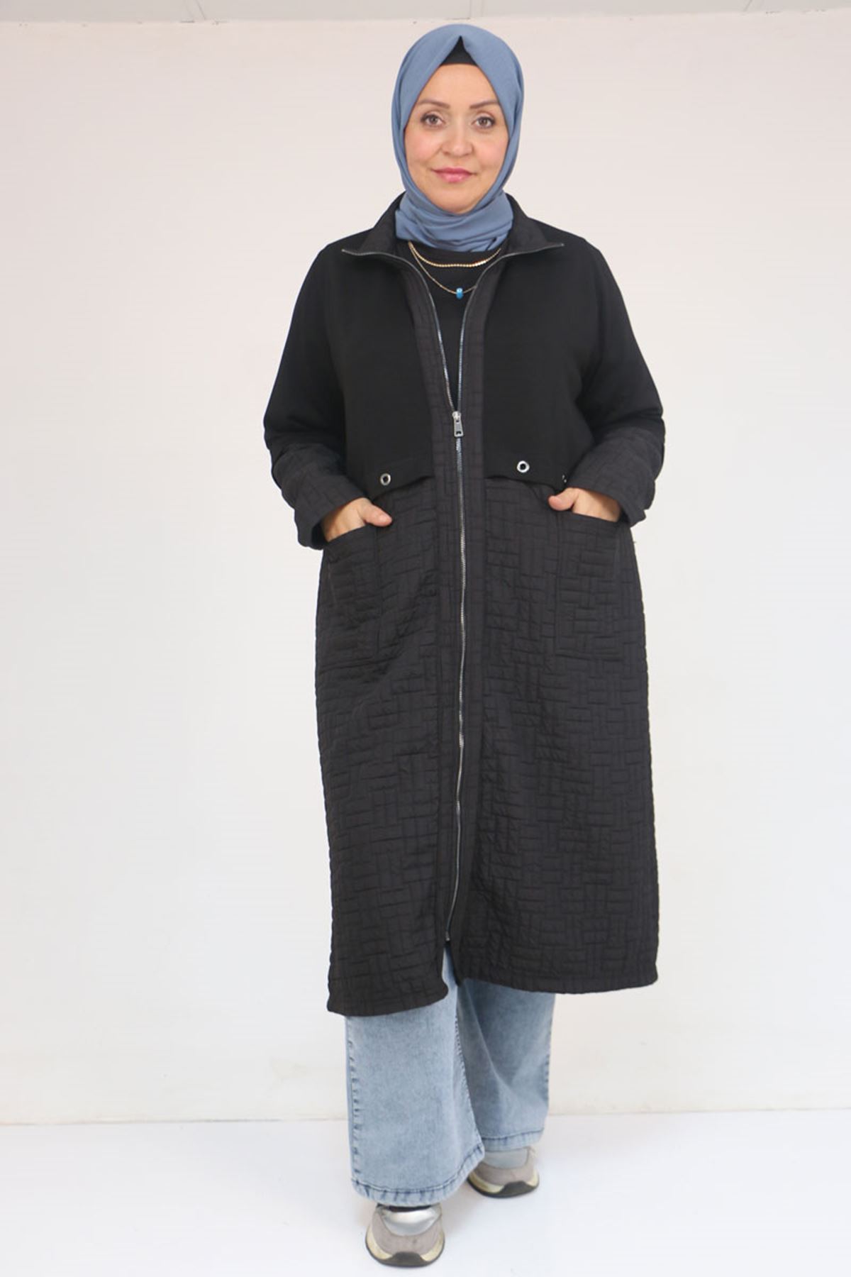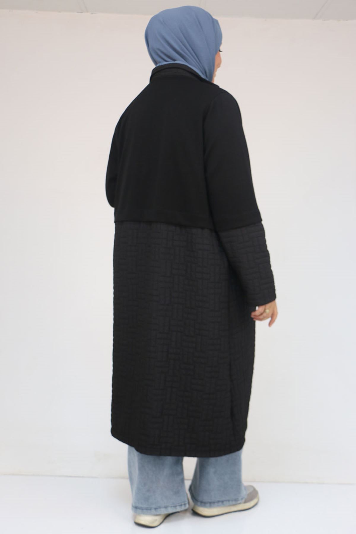 53039 Büyük Beden Kapitone - Modal Kombinli Trençkot - Siyah