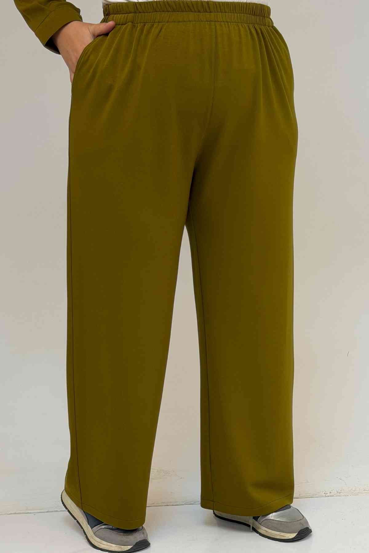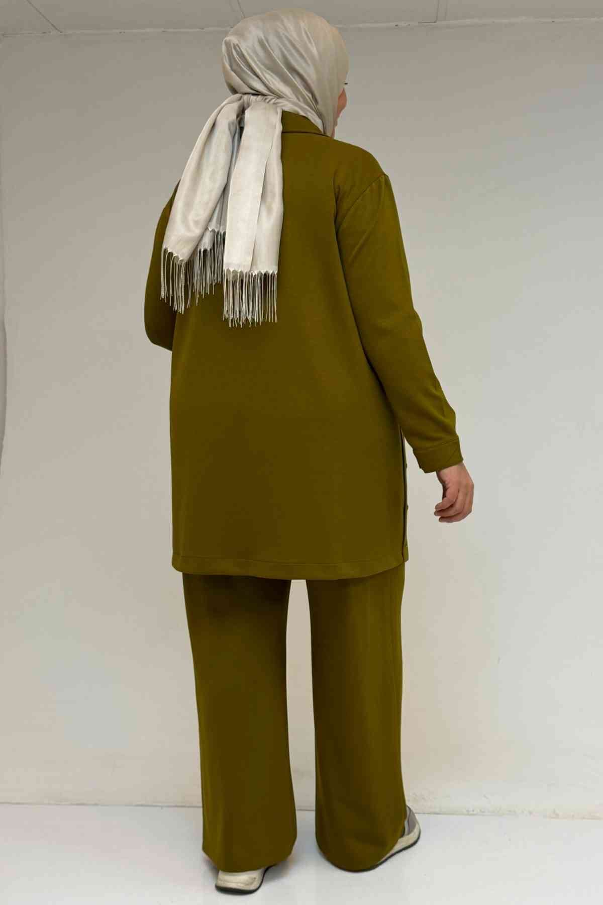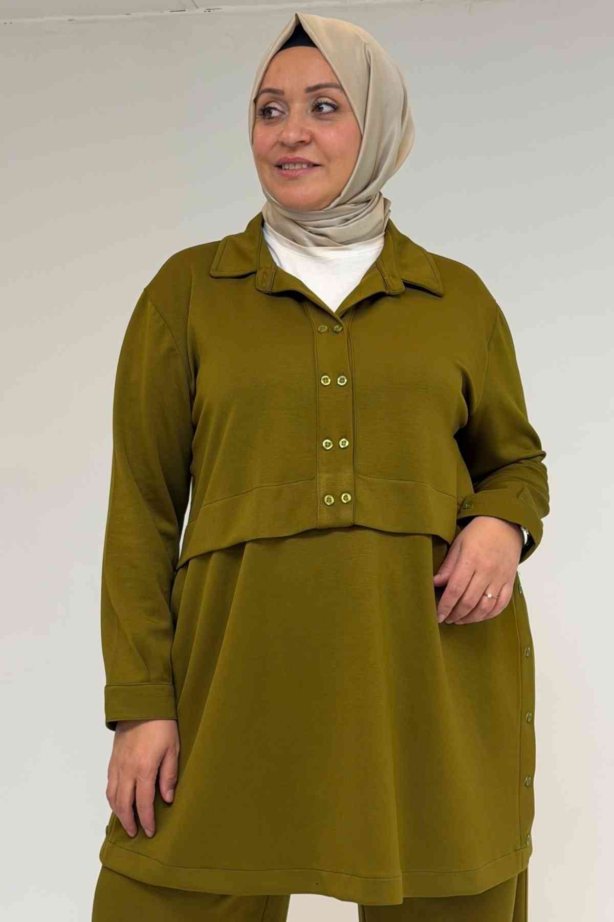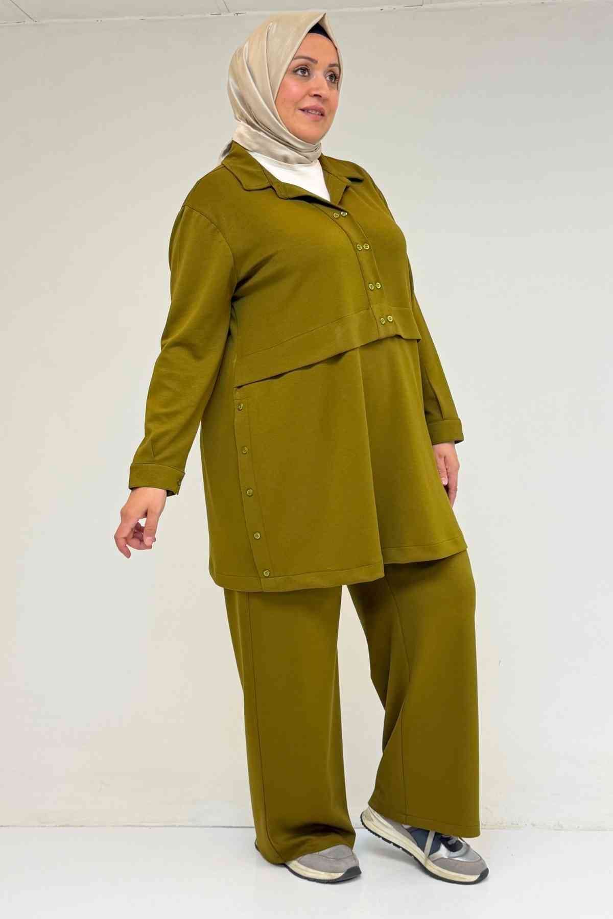 57038 Büyük Beden Erkek Yaka Düğme Detaylı Modal Pantolonlu Takım - Yağ Yeşili
