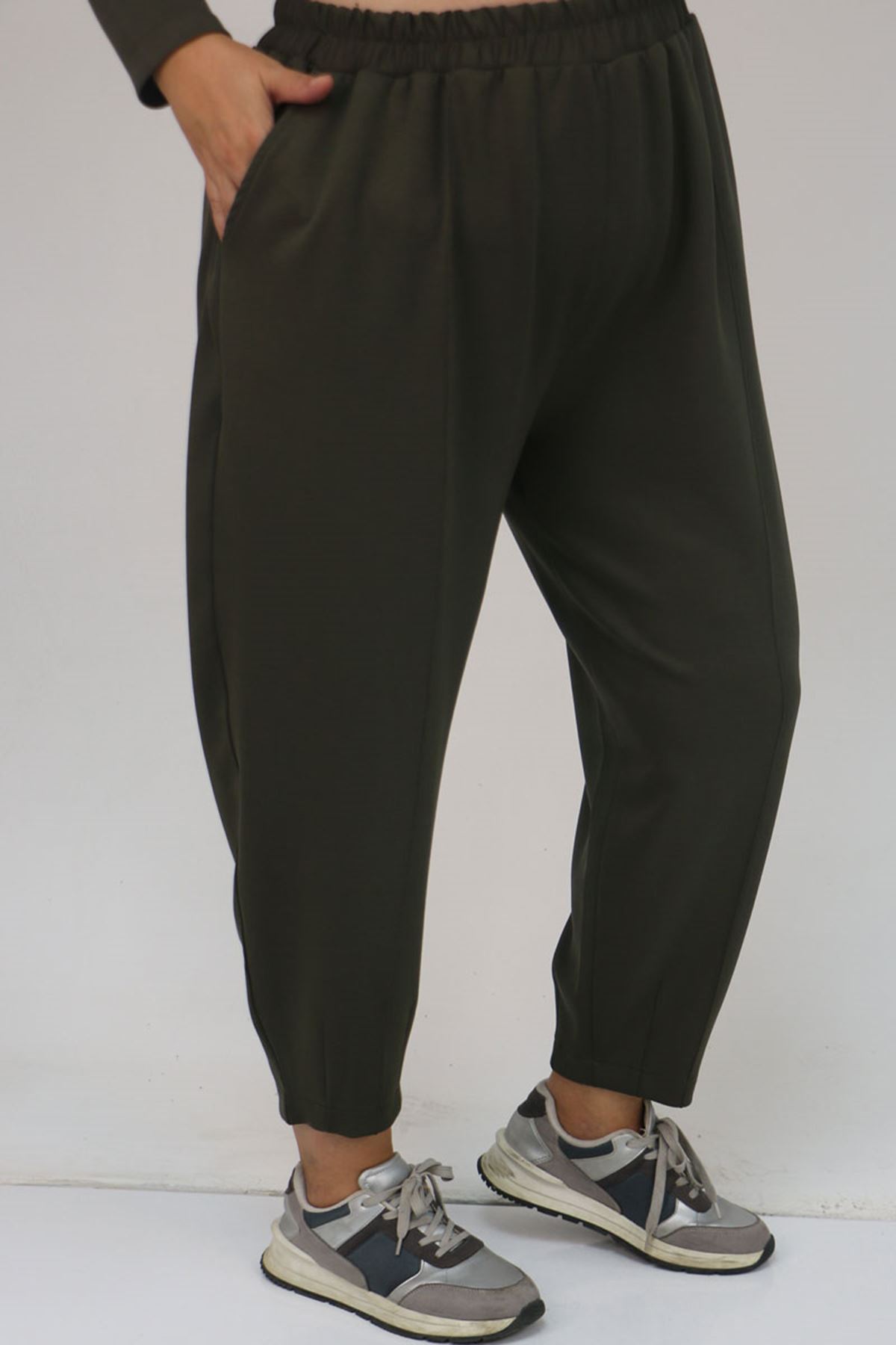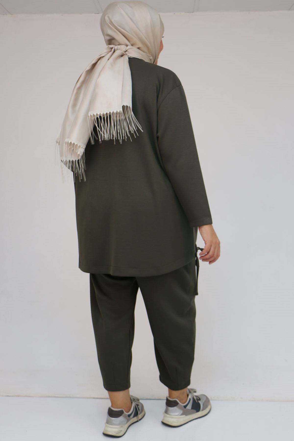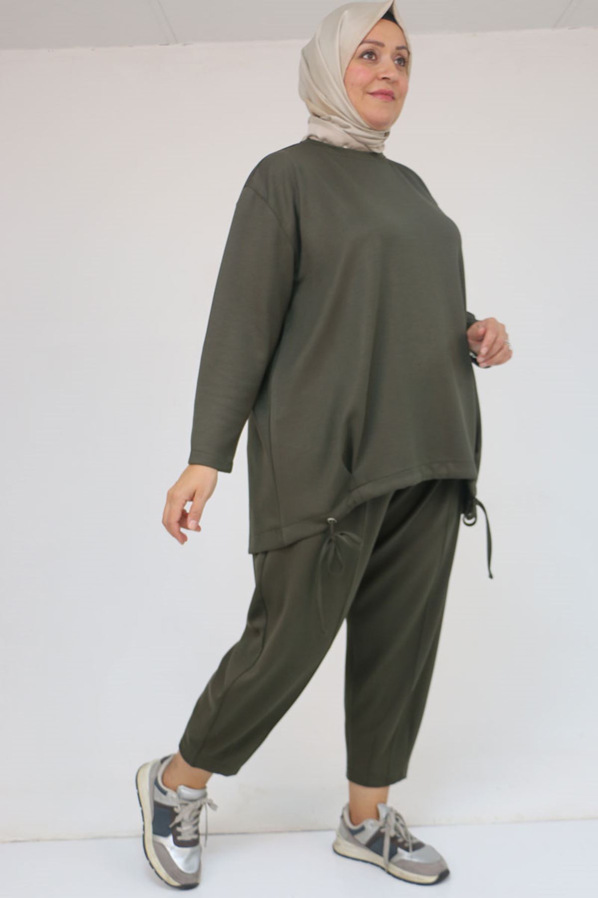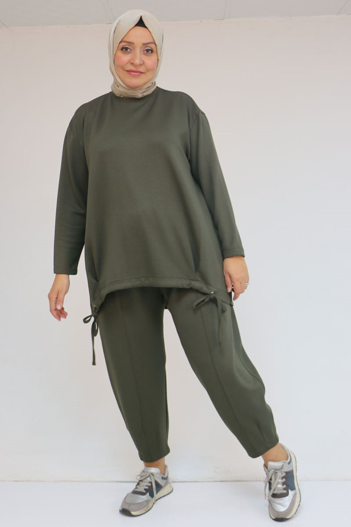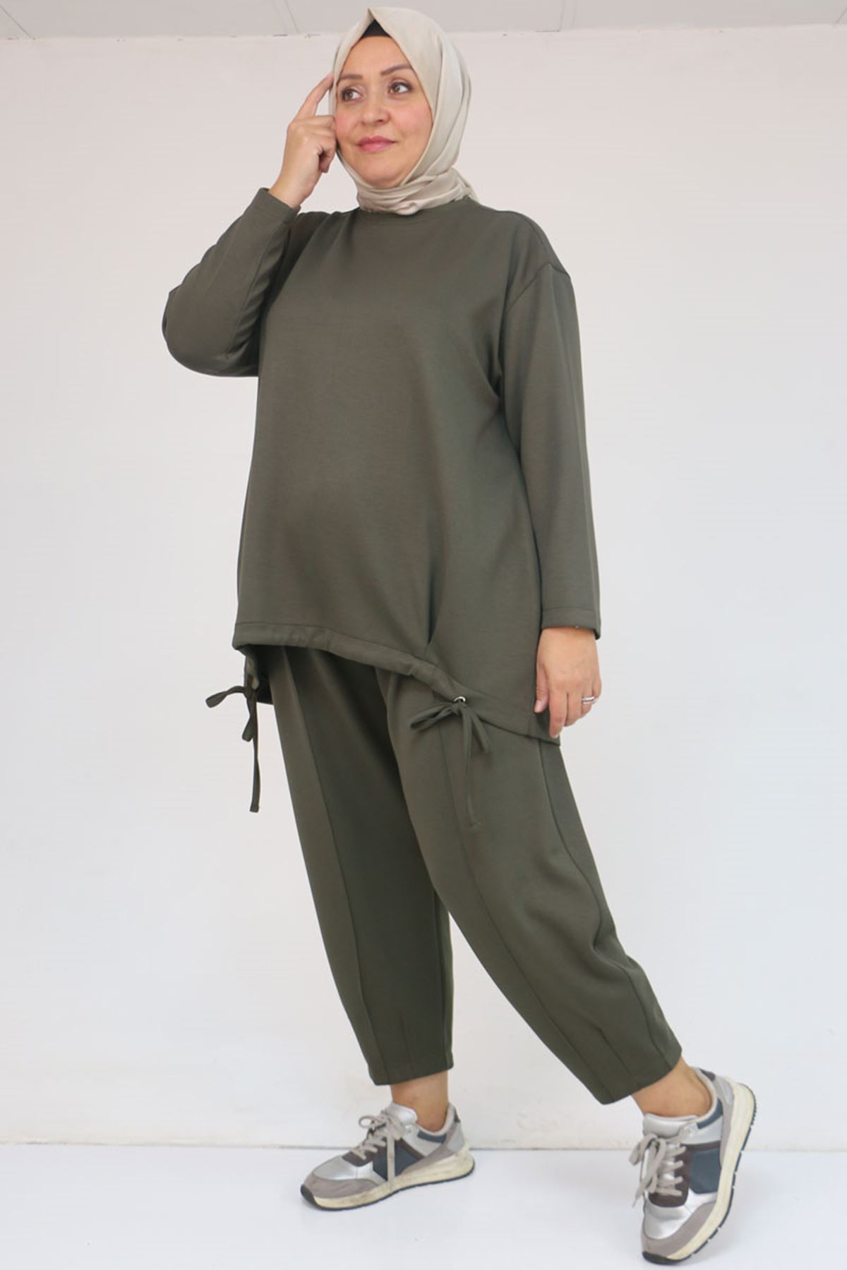 57045 Büyük Beden Önü Bağlama İp Detaylı Modal Pantolonlu Takım - Haki
