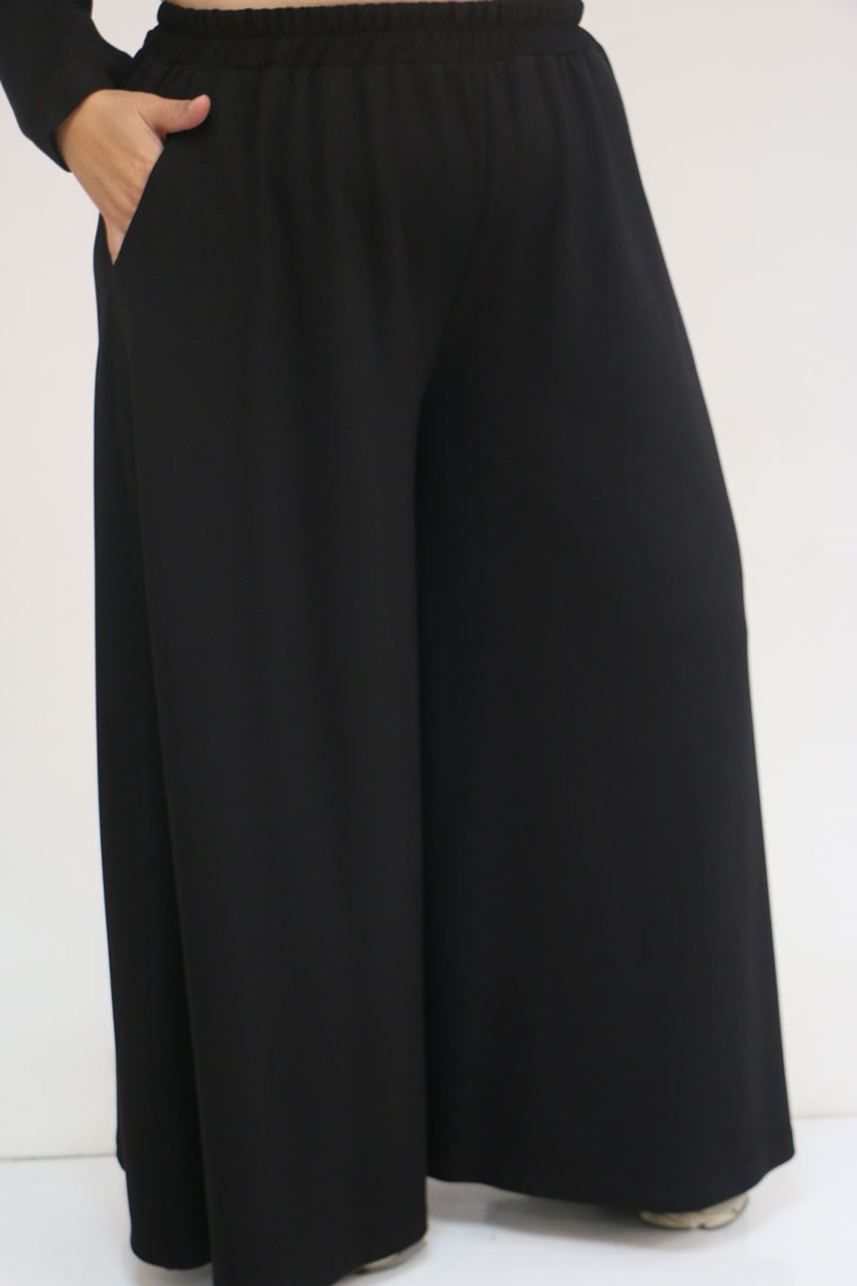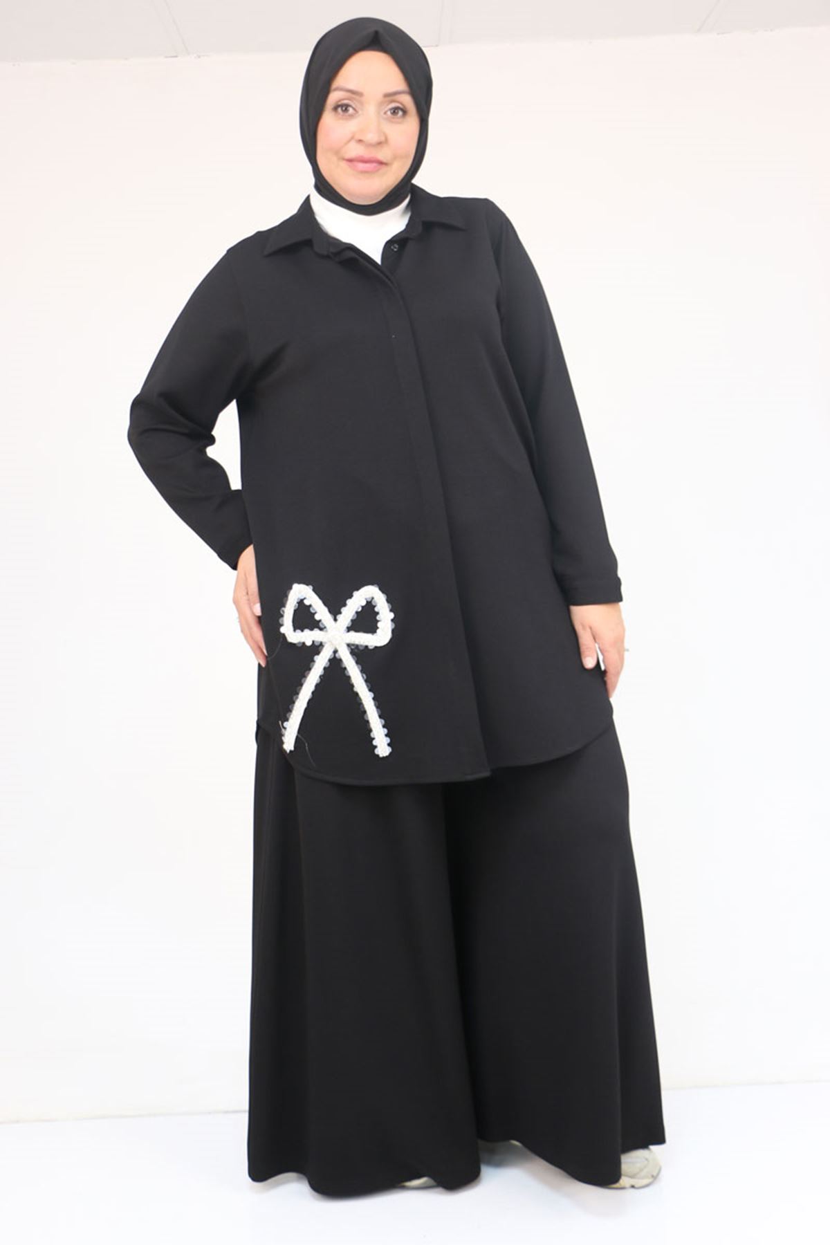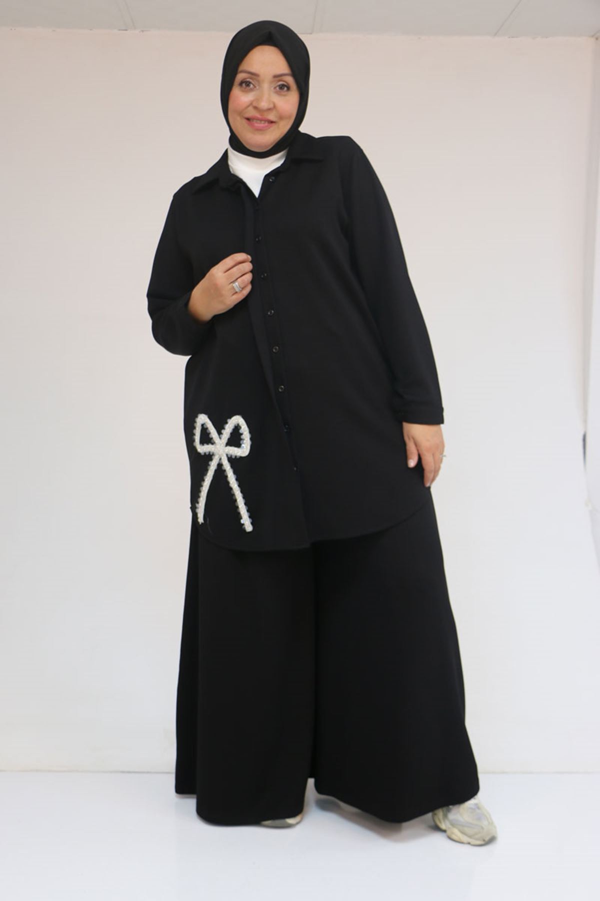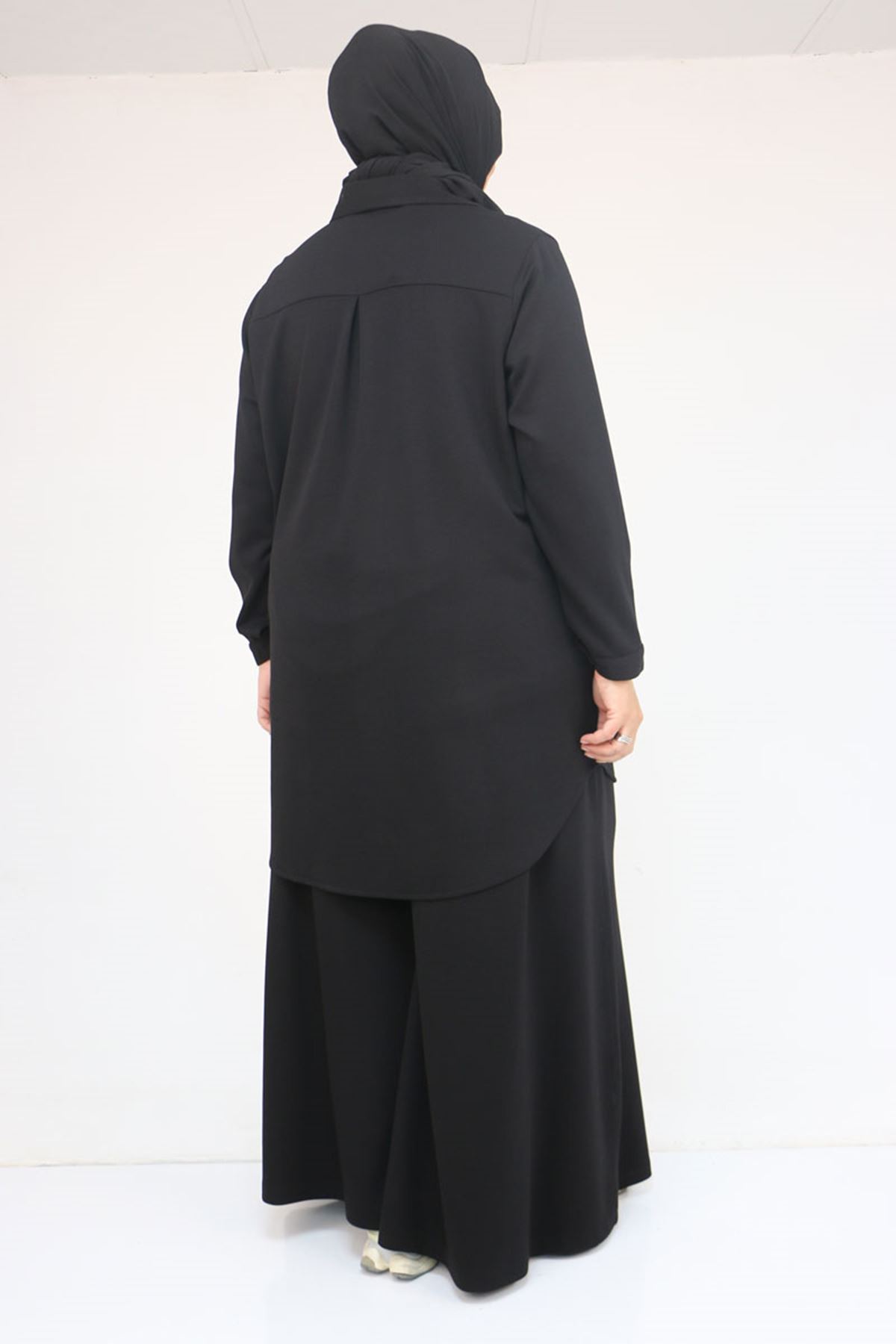 57055 Büyük Beden Gömleği Düğmeli Pantolonlu Modal Takım - Siyah