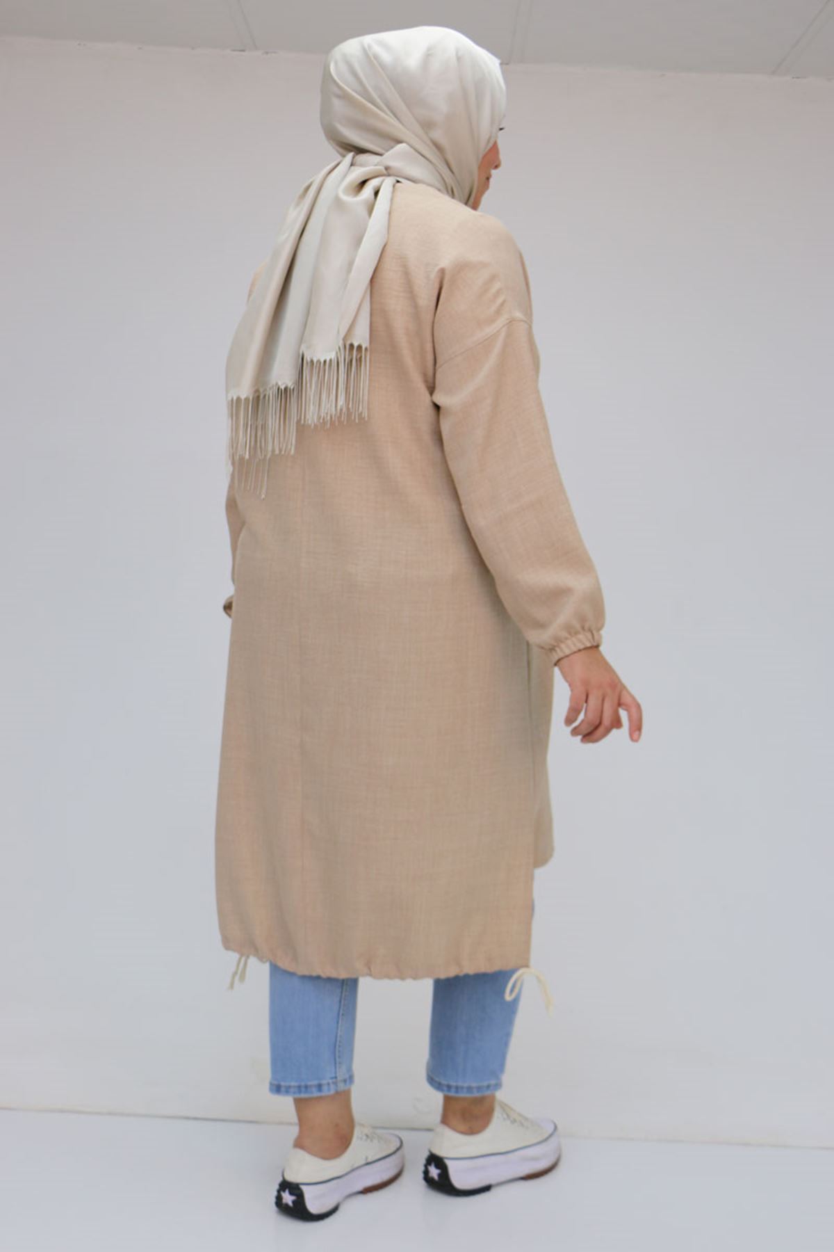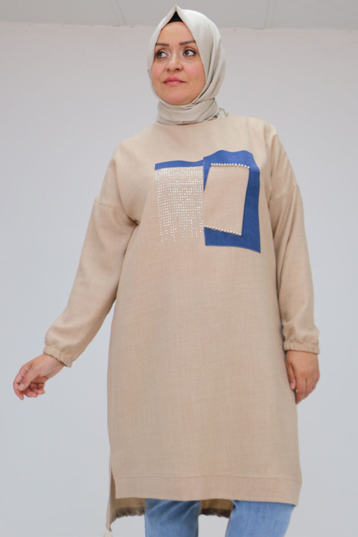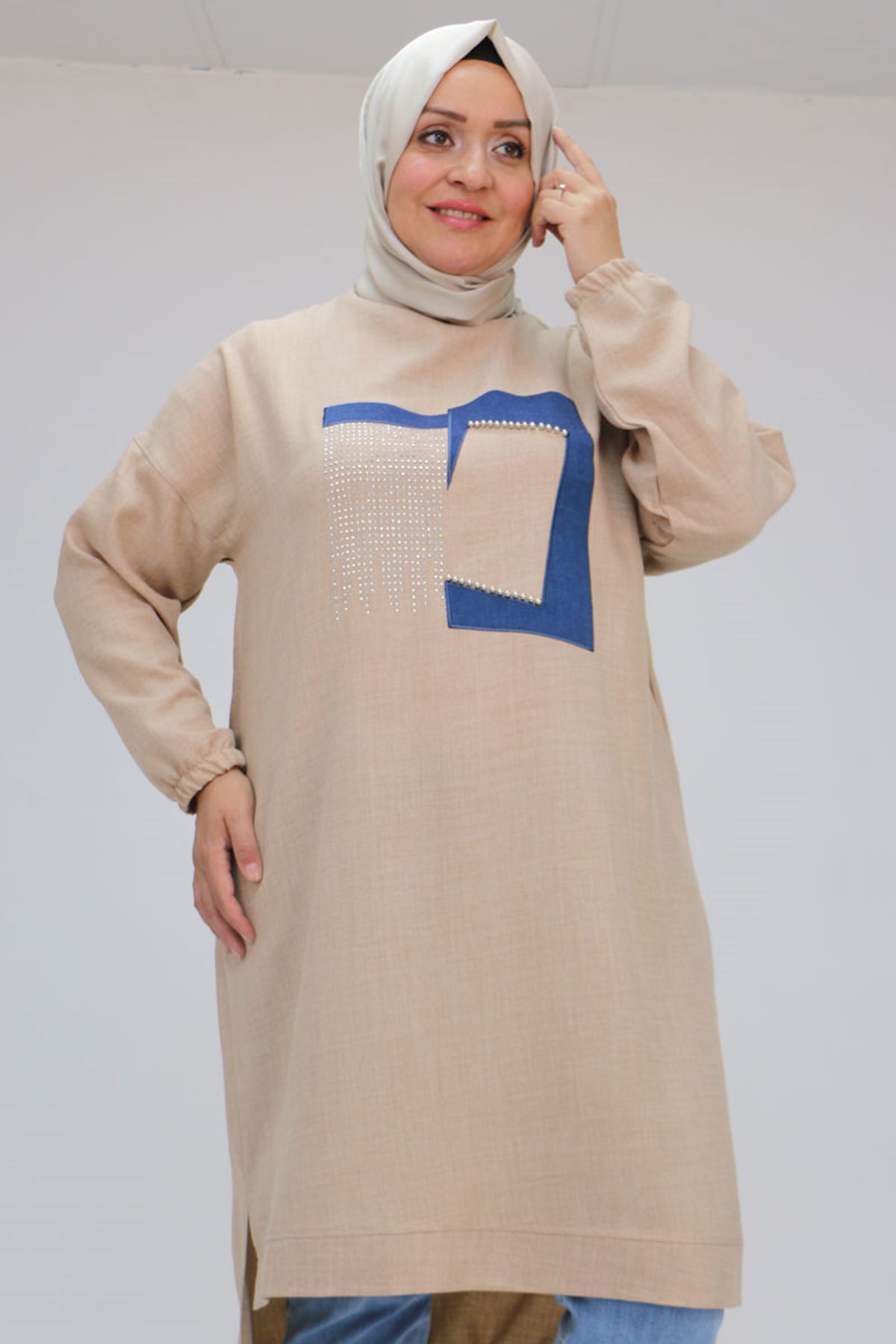 F-58011 Büyük Beden Etek Ucu Bağlamalı Önü Taş Detaylı Keten Tunik - Bej