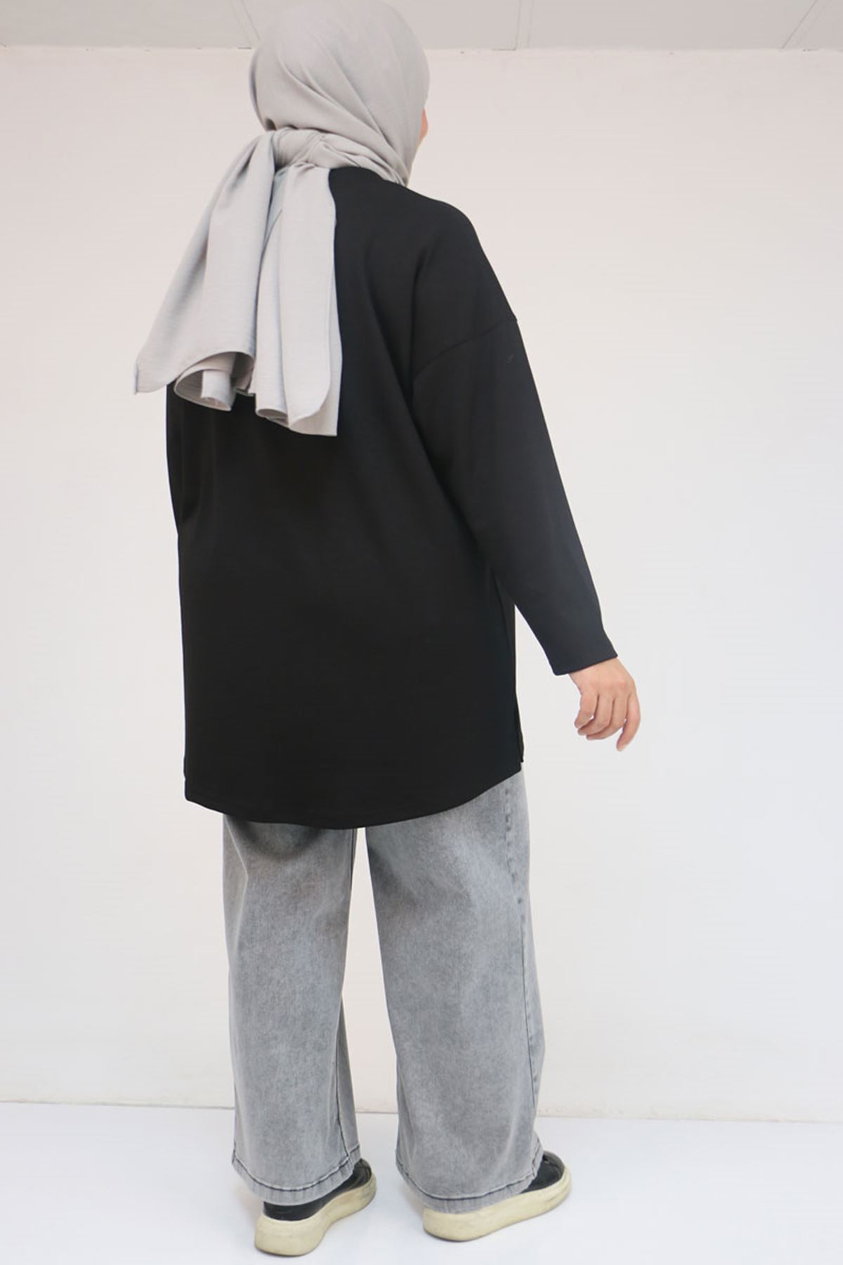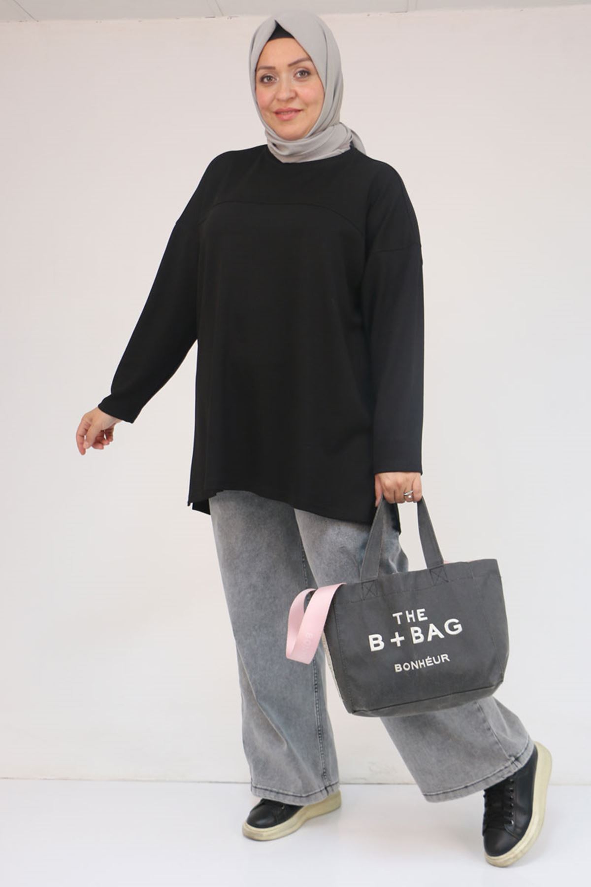 58132 Büyük Beden Önü Çıma Detaylı Yanı Yırtmaçlı Modal Tunik - Siyah