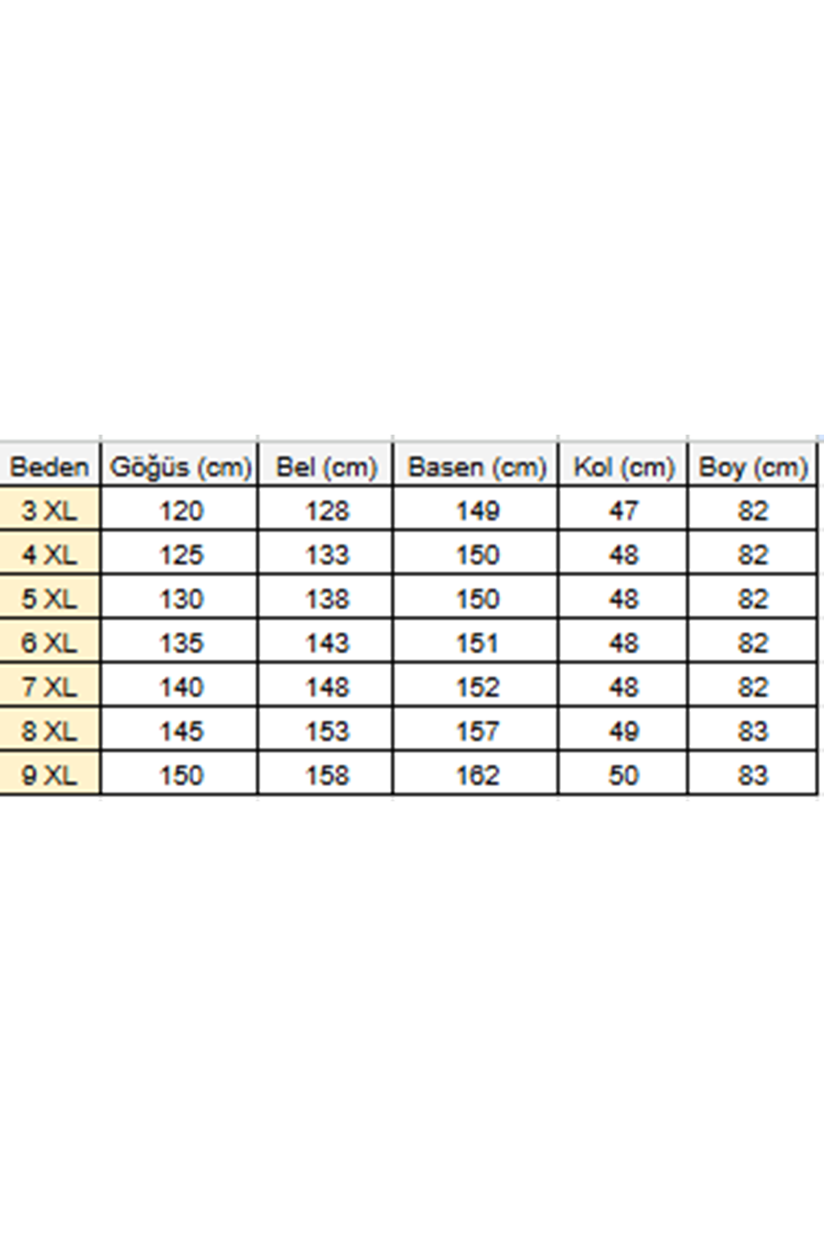 BEL GENİŞLİĞİ :88 cm GÖĞÜS GENİŞLİĞİ :103 cm BASEN :116 cm