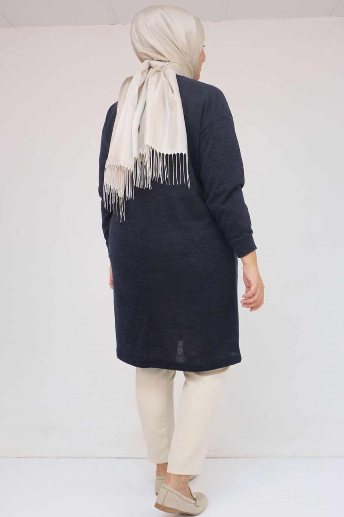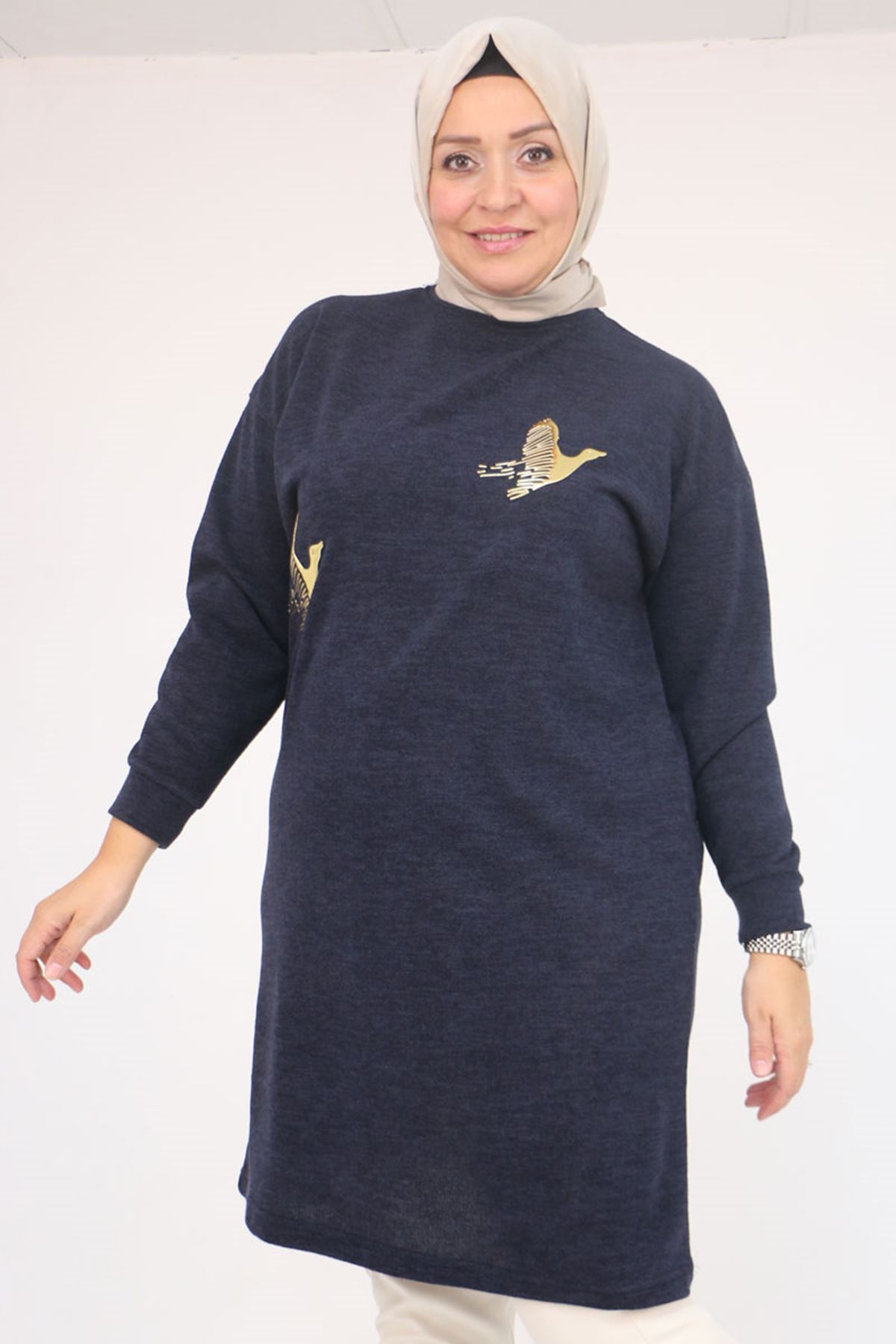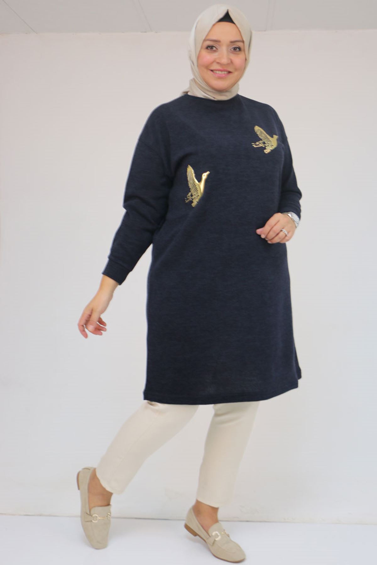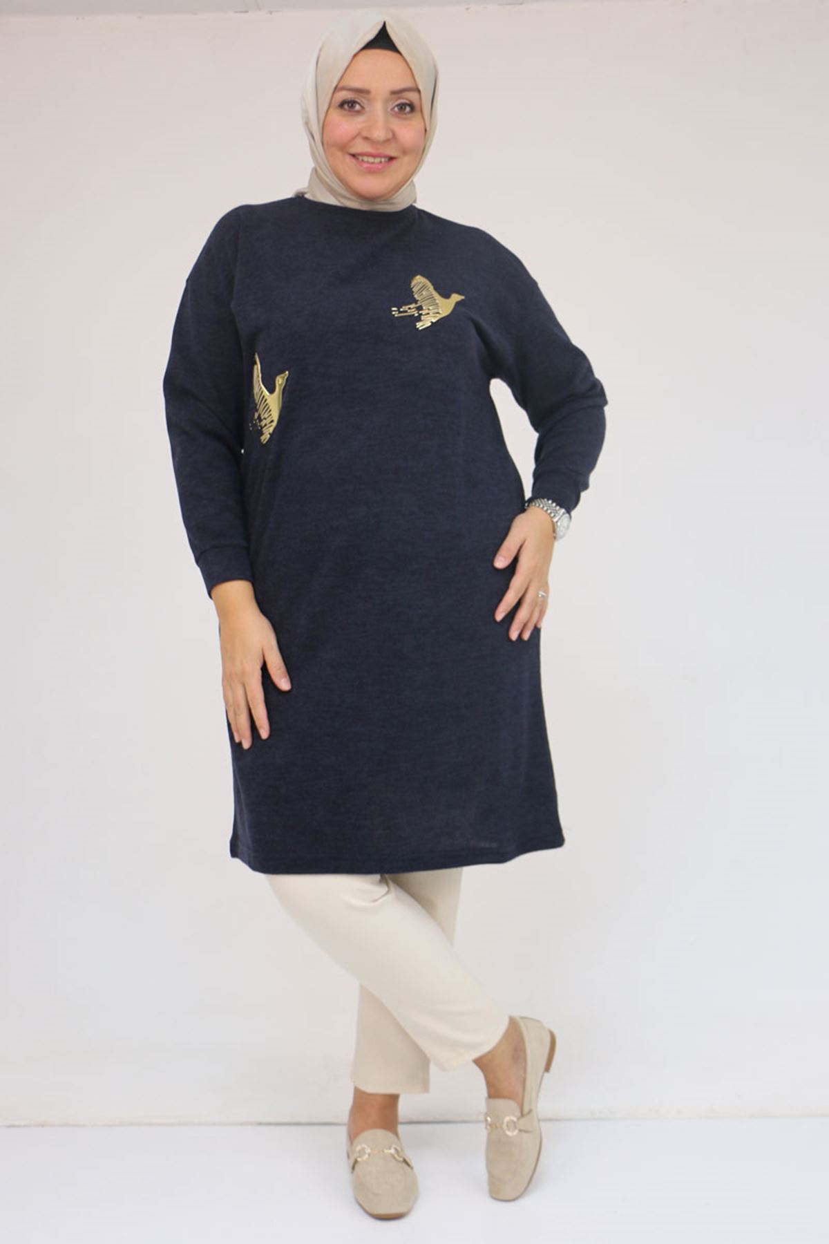 58143 Büyük Beden Düşük Kollu Aksesuar Detaylı Mir Tunik - Lacivert