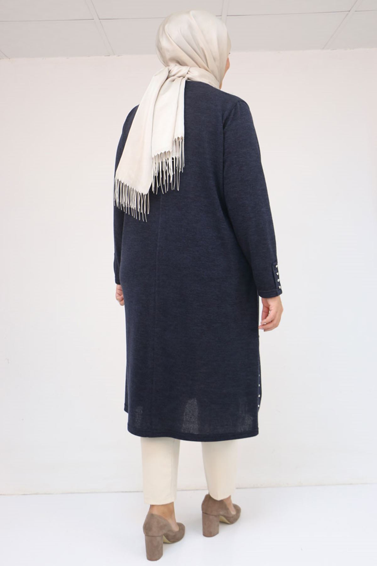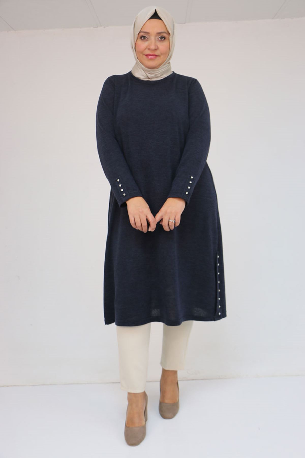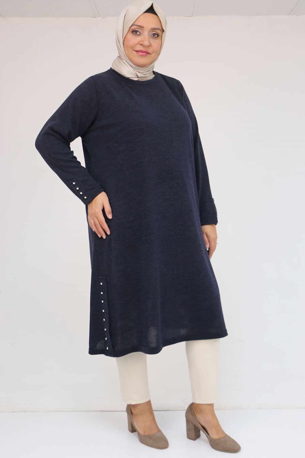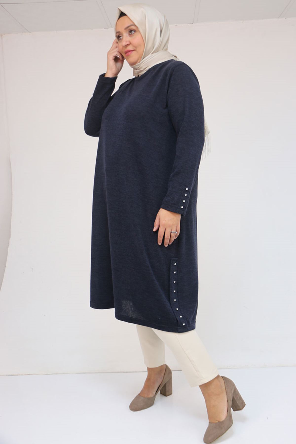 58146 Büyük Beden Kol Ve Yan Patları Taş Detaylı Mir Tunik - Lacivert