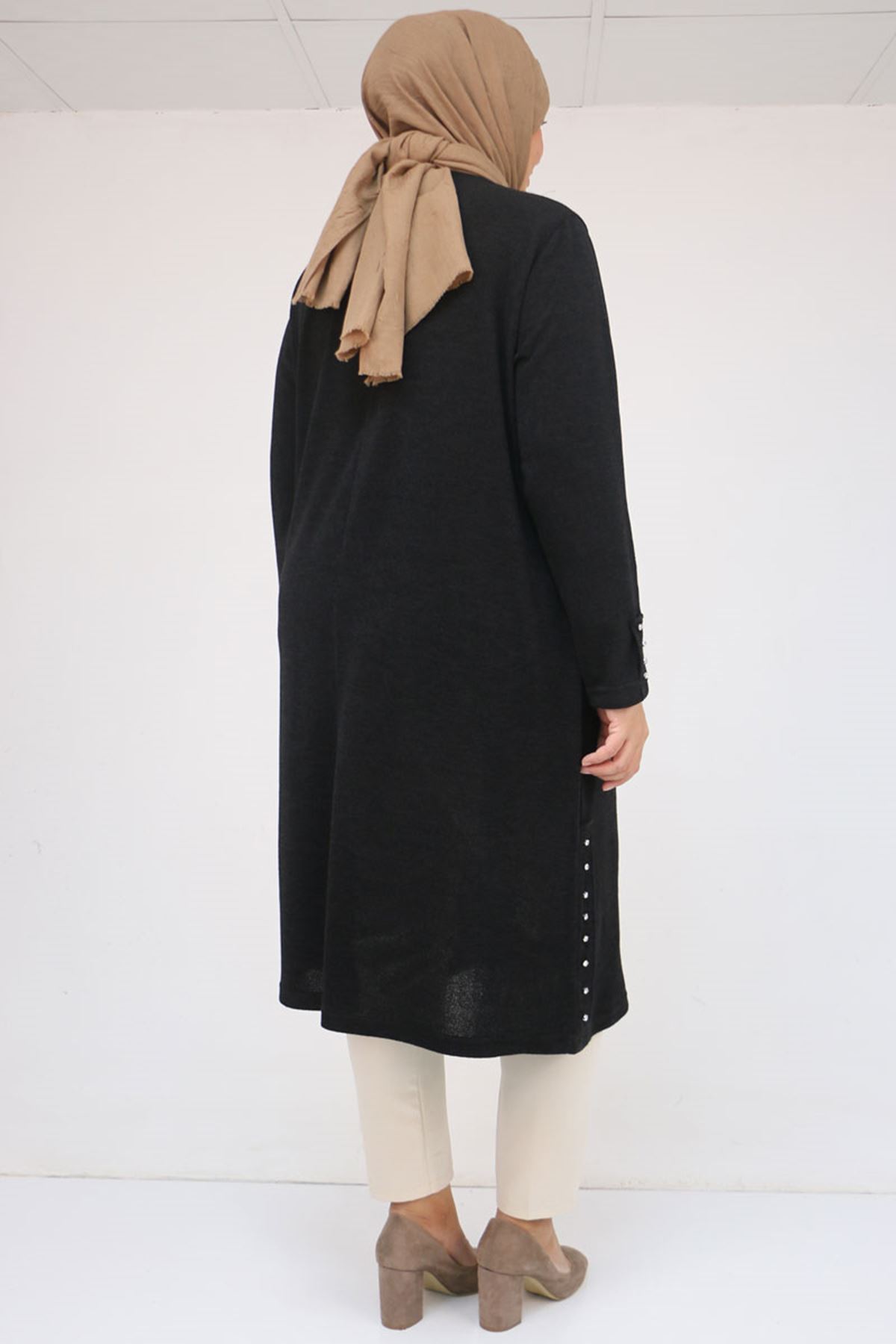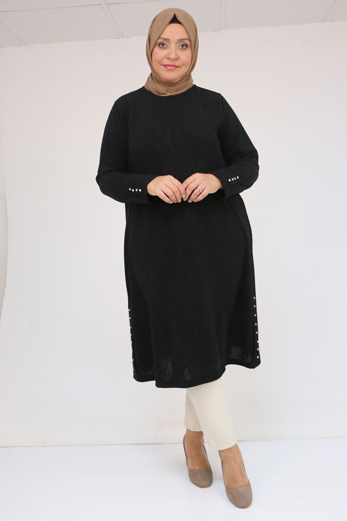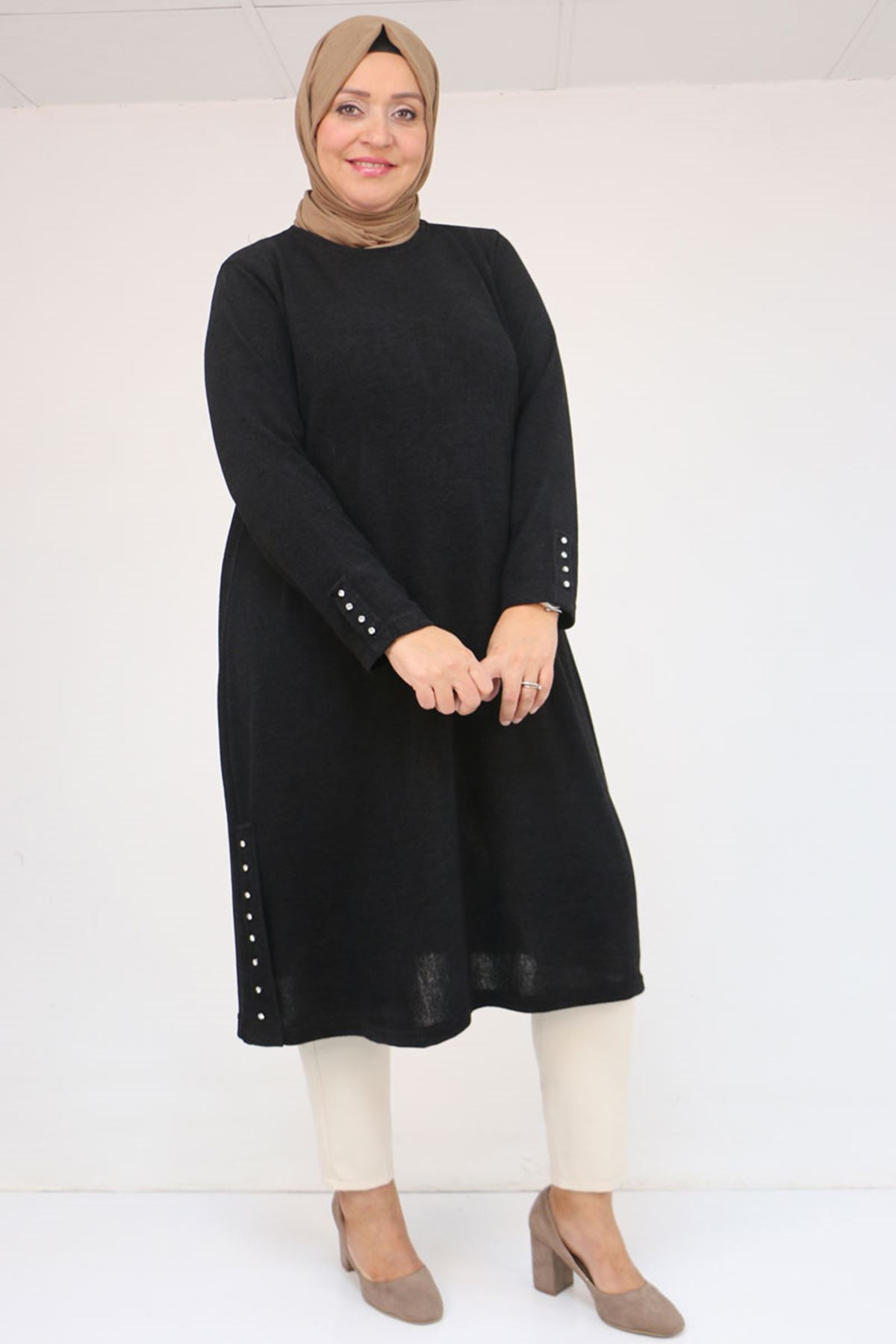58146 Büyük Beden Kol Ve Yan Patları Taş Detaylı Mir Tunik - Siyah