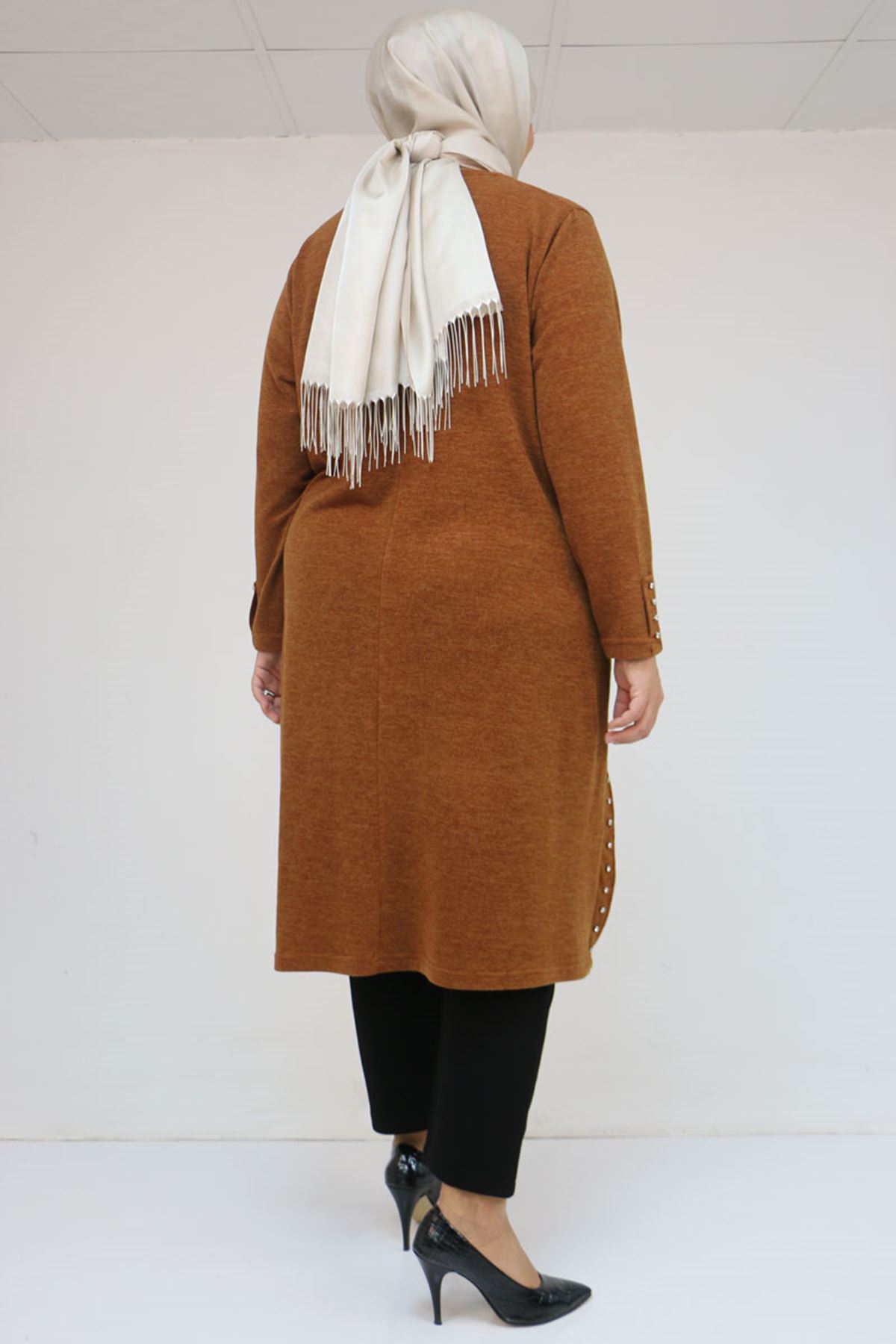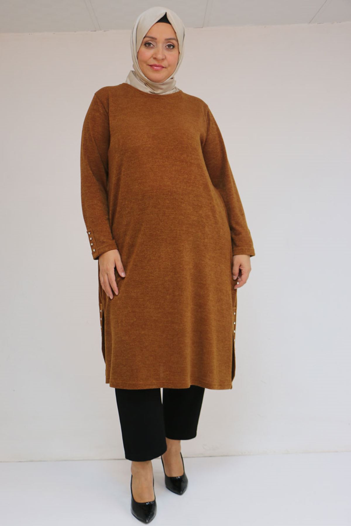 58146 Büyük Beden Kol Ve Yan Patları Taş Detaylı Mir Tunik - Taba