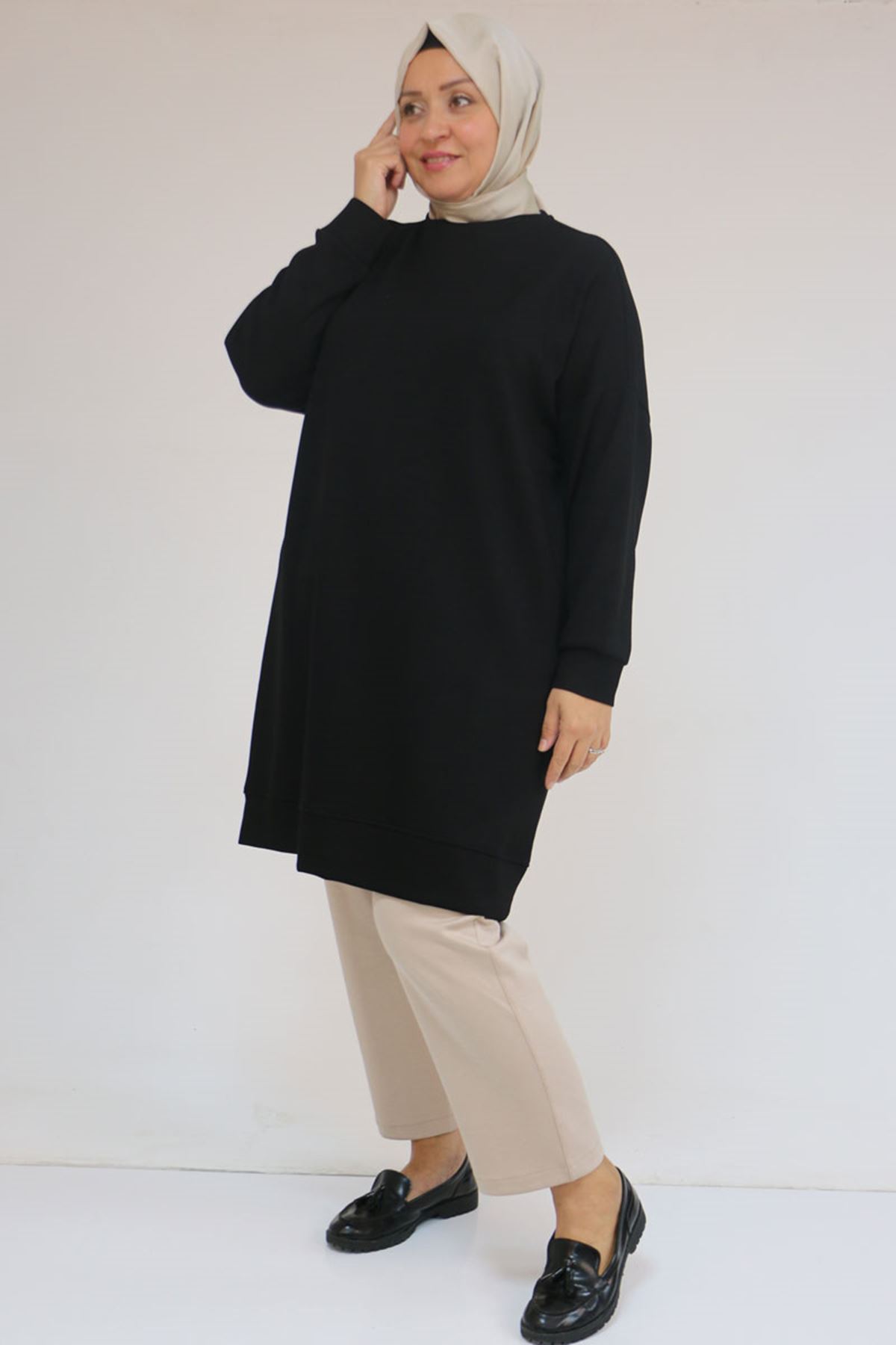 58151 Büyük Beden Kol Ve Etek Ucu Kendinden Ribanalı Modal Tunik - Siyah