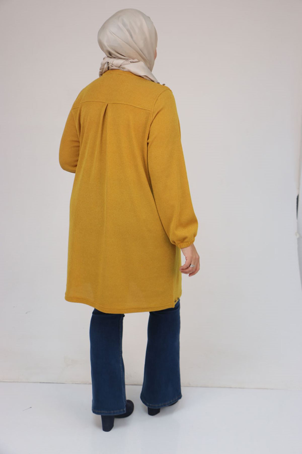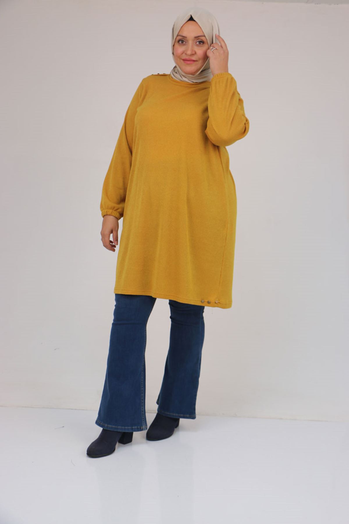 58155 Büyük Beden Kolları Lastikli Perçinli Mir Tunik - Hardal