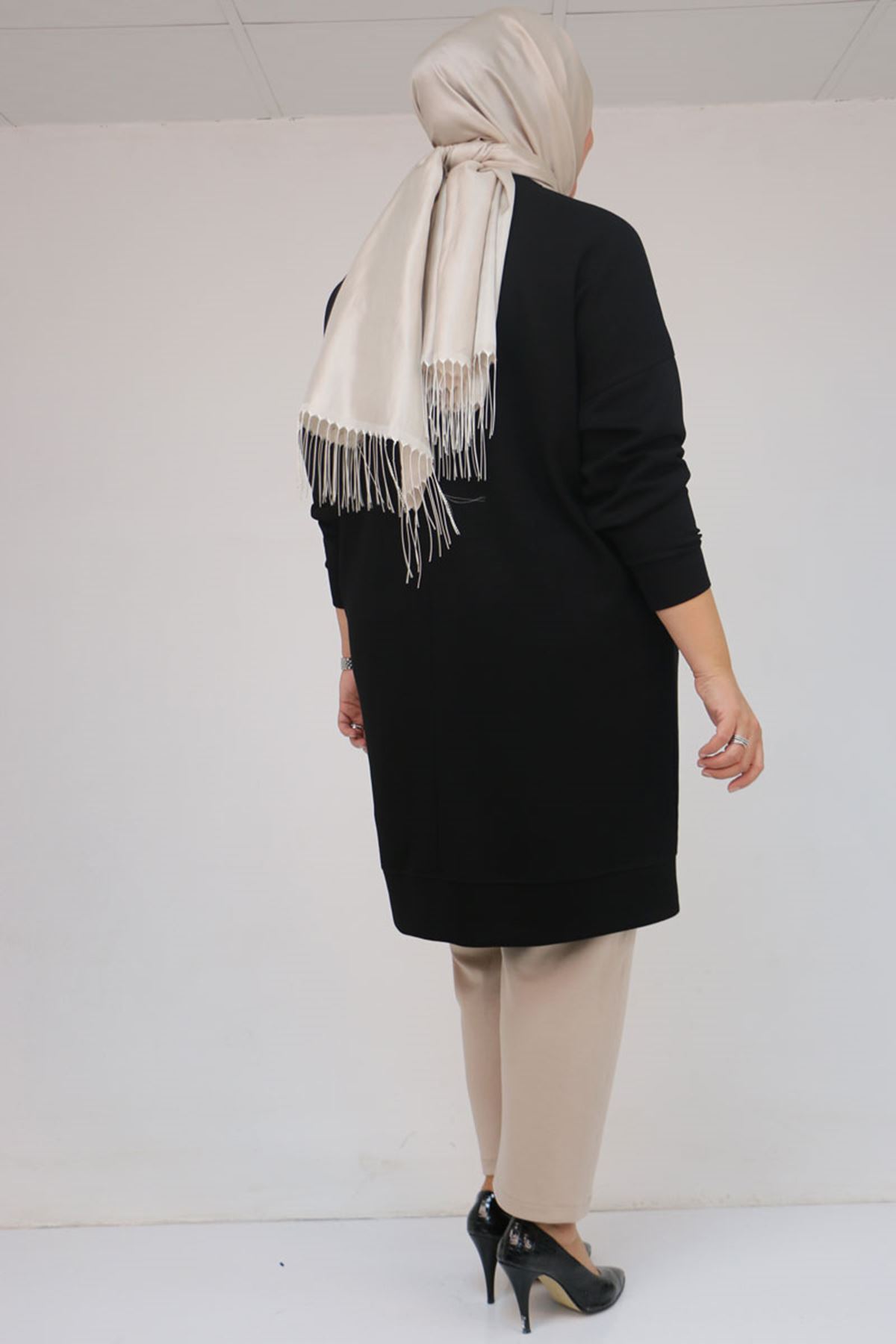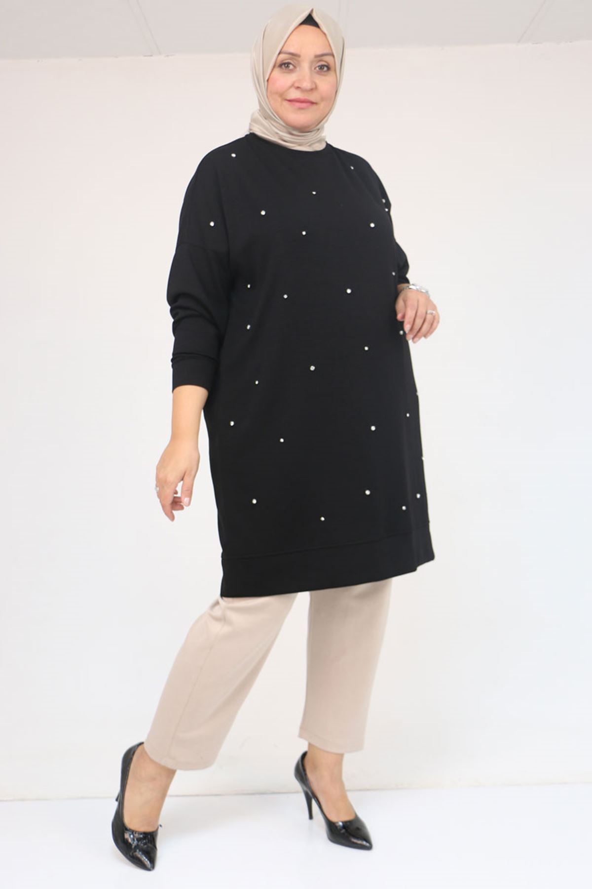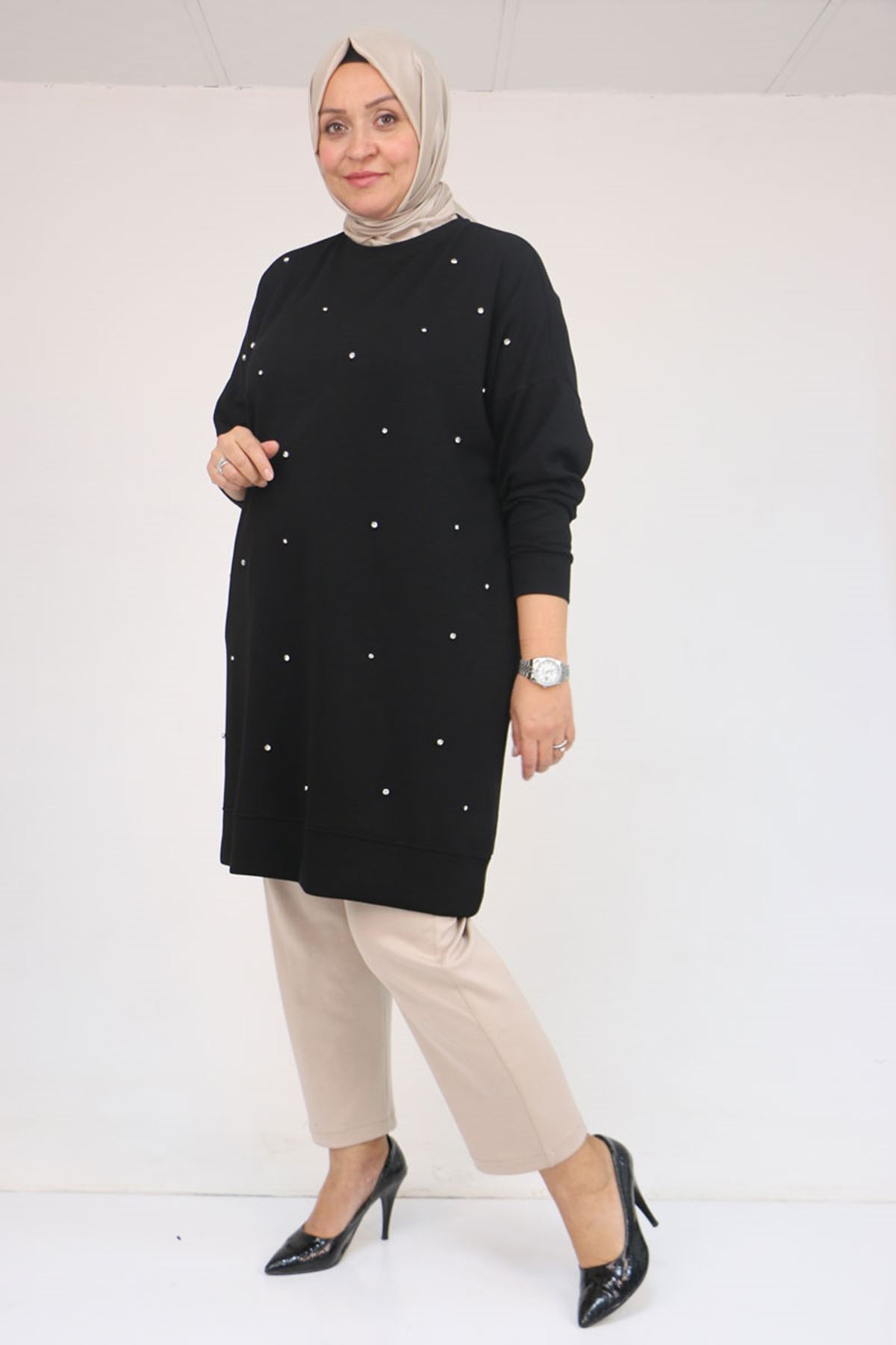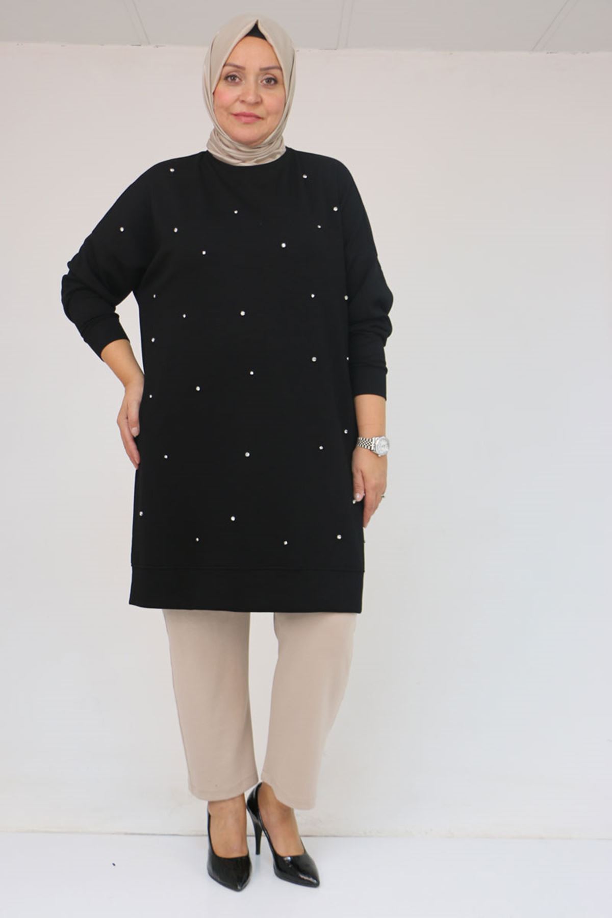 58157 Büyük Beden Beyoğlu Taş Çakmalı Modal Tunik - Siyah