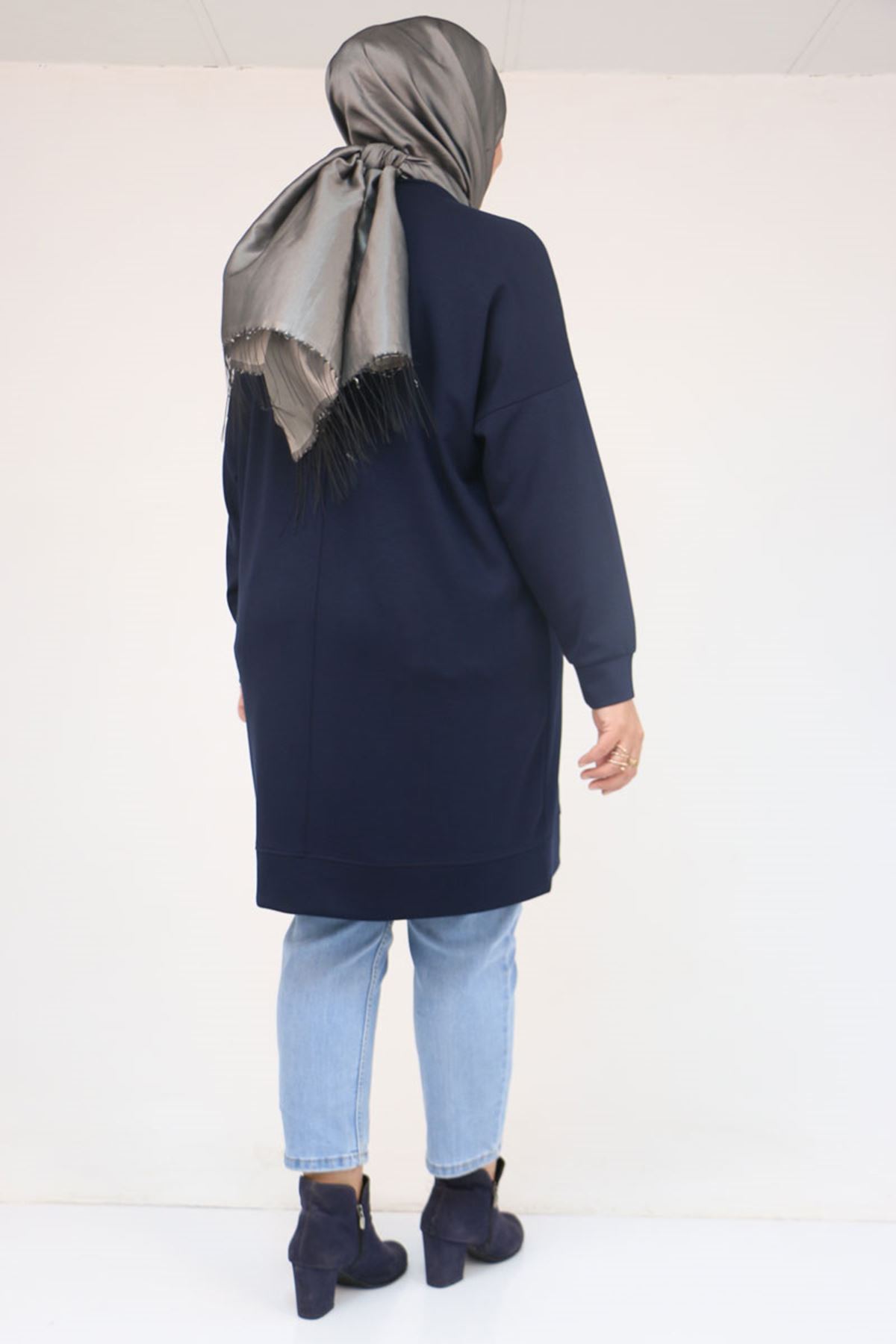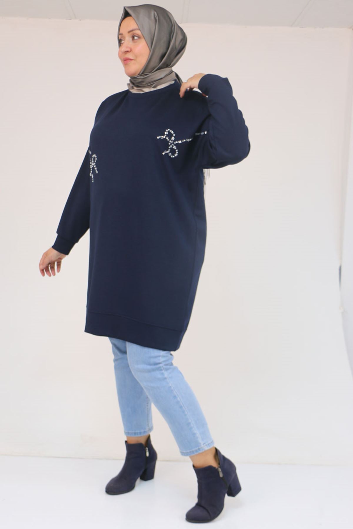 58165 Büyük Beden Taş Baskı Detaylı Modal Tunik - Lacivert