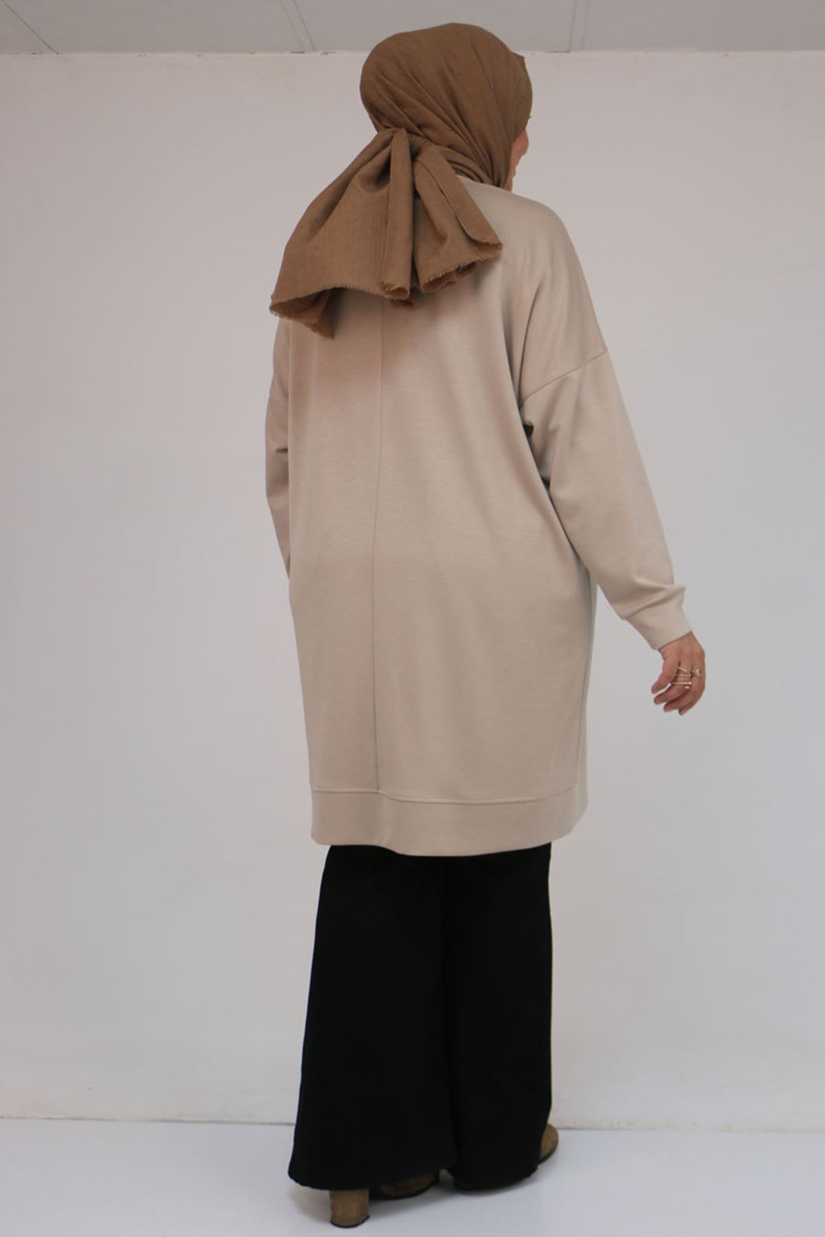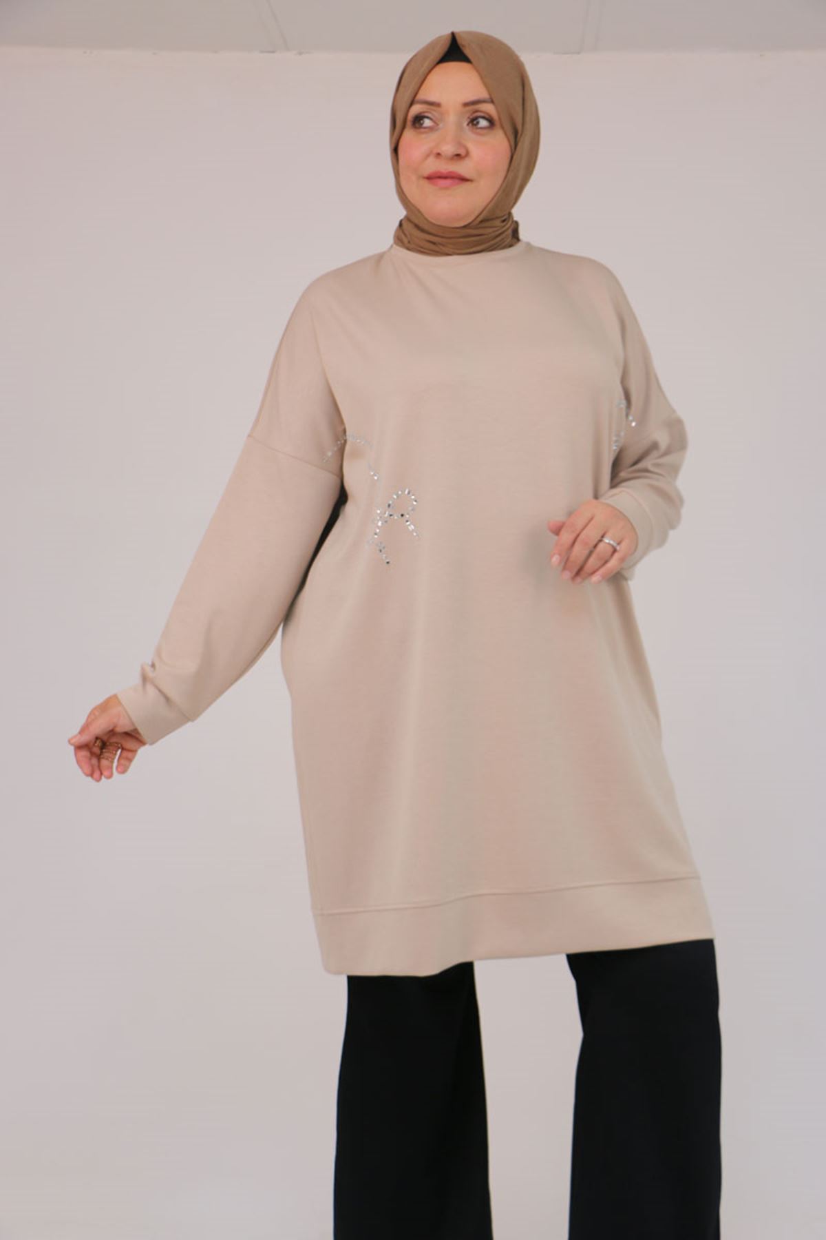 58165 Büyük Beden Taş Baskı Detaylı Modal Tunik - Vizon