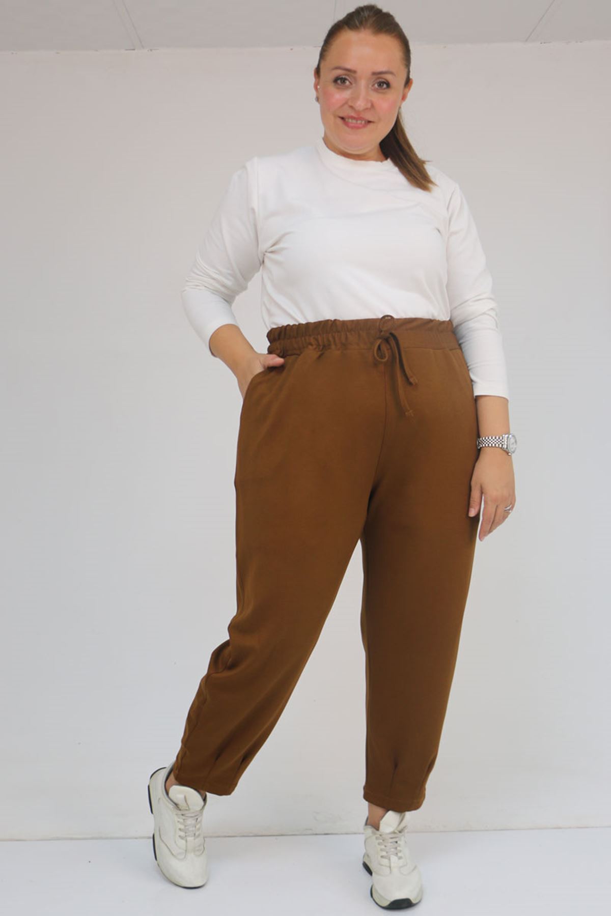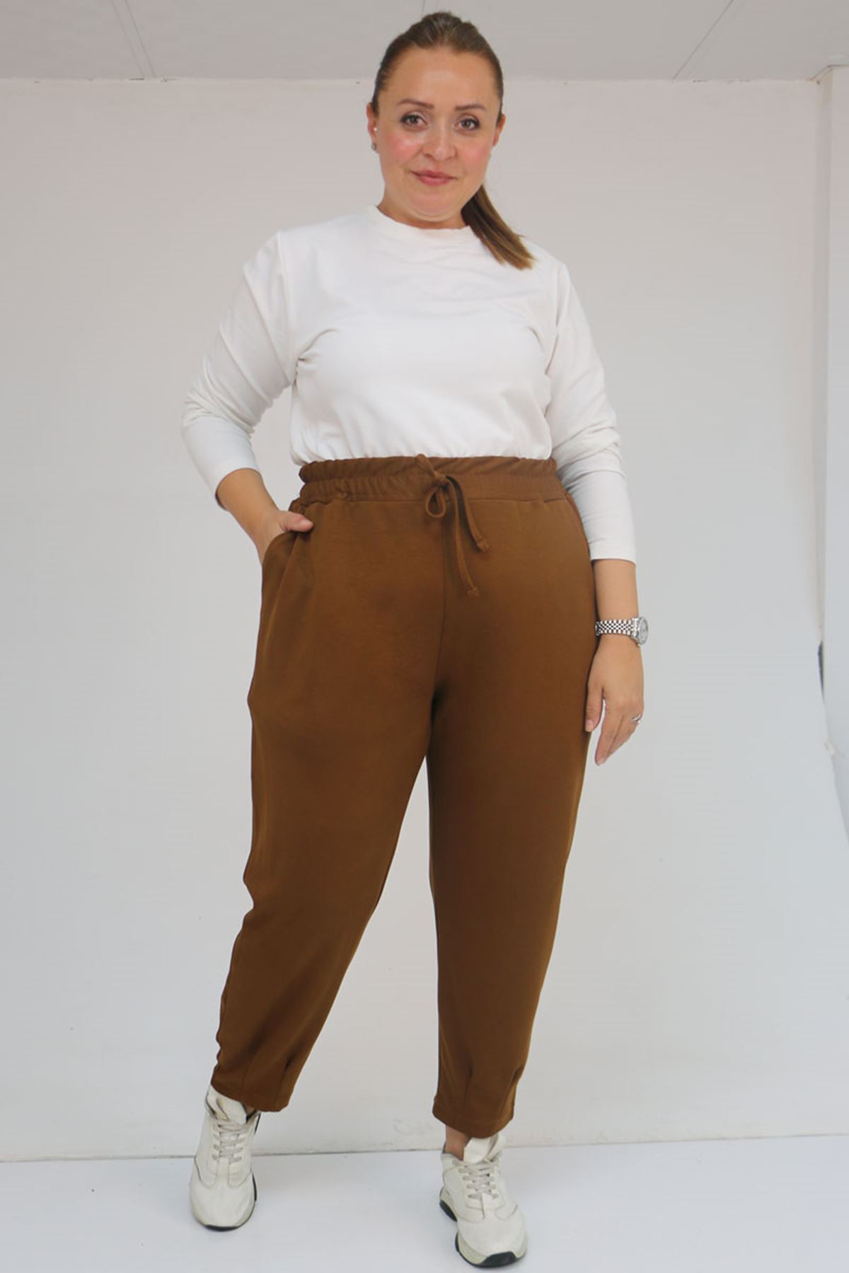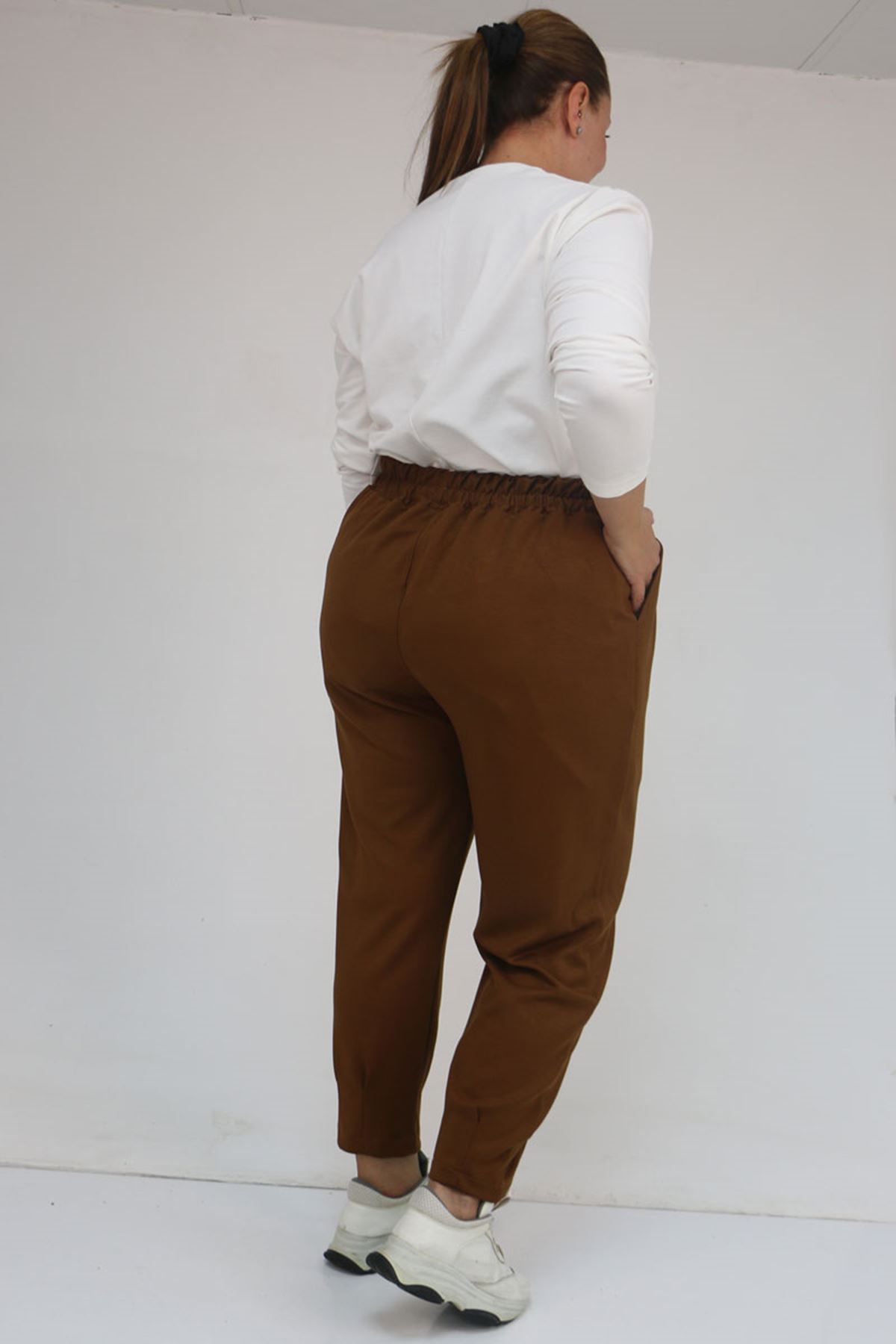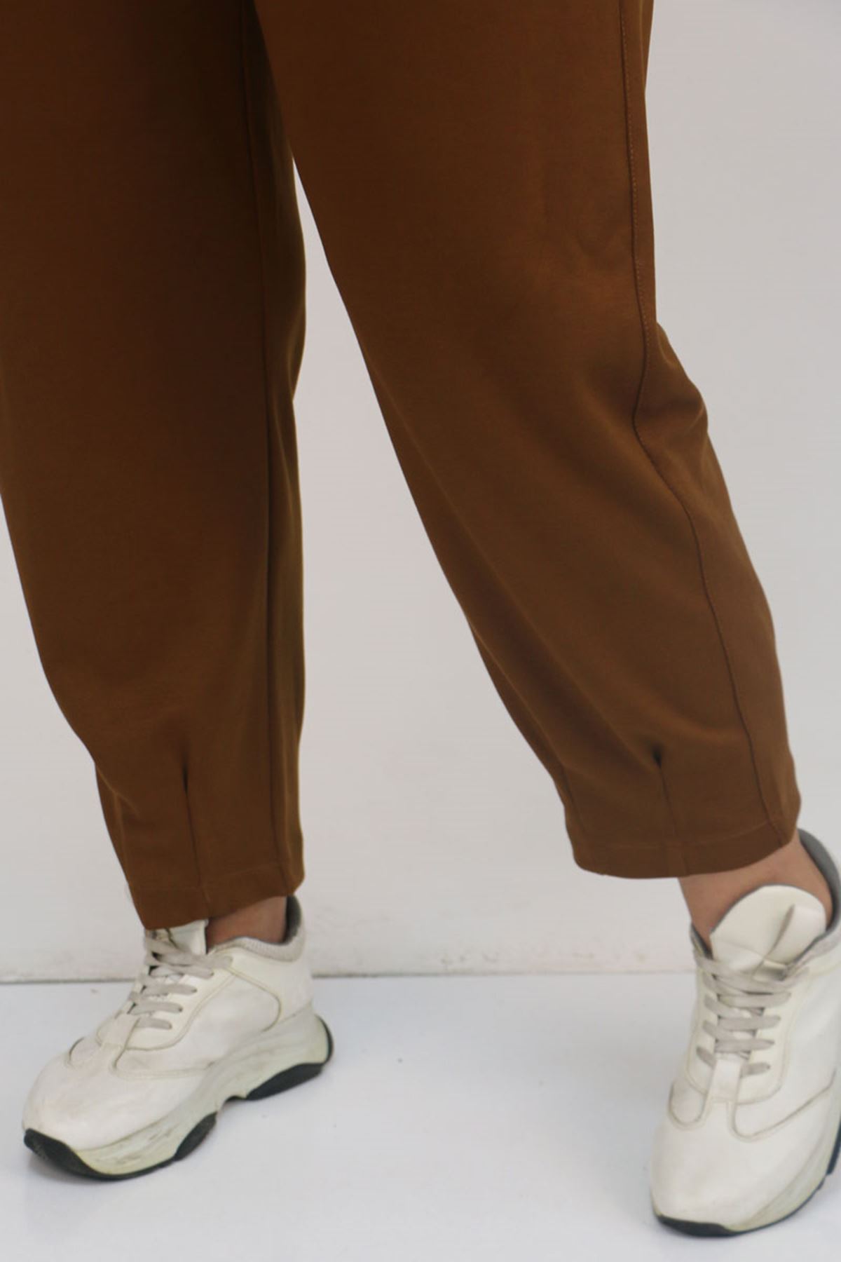 59028 Büyük Beden Paçası Çıma Detaylı Modal Pantolon - Taba