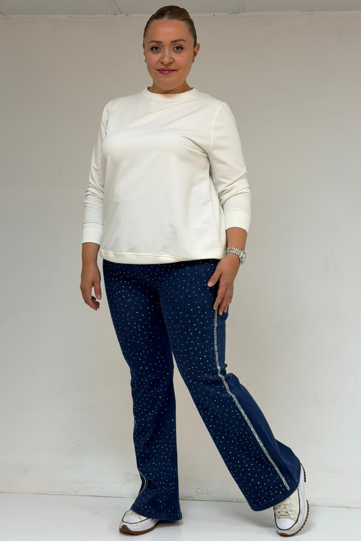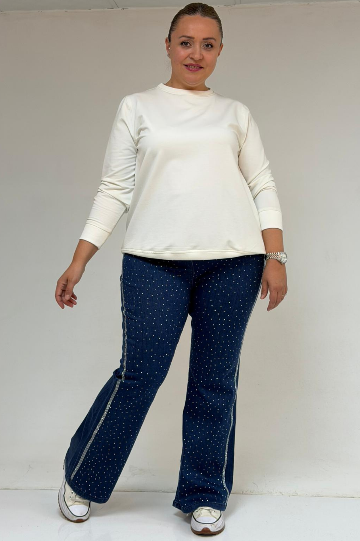59038 Büyük Beden İspanyol Paça Taş Baskı Detaylı Kot Pantolon - Lacivert